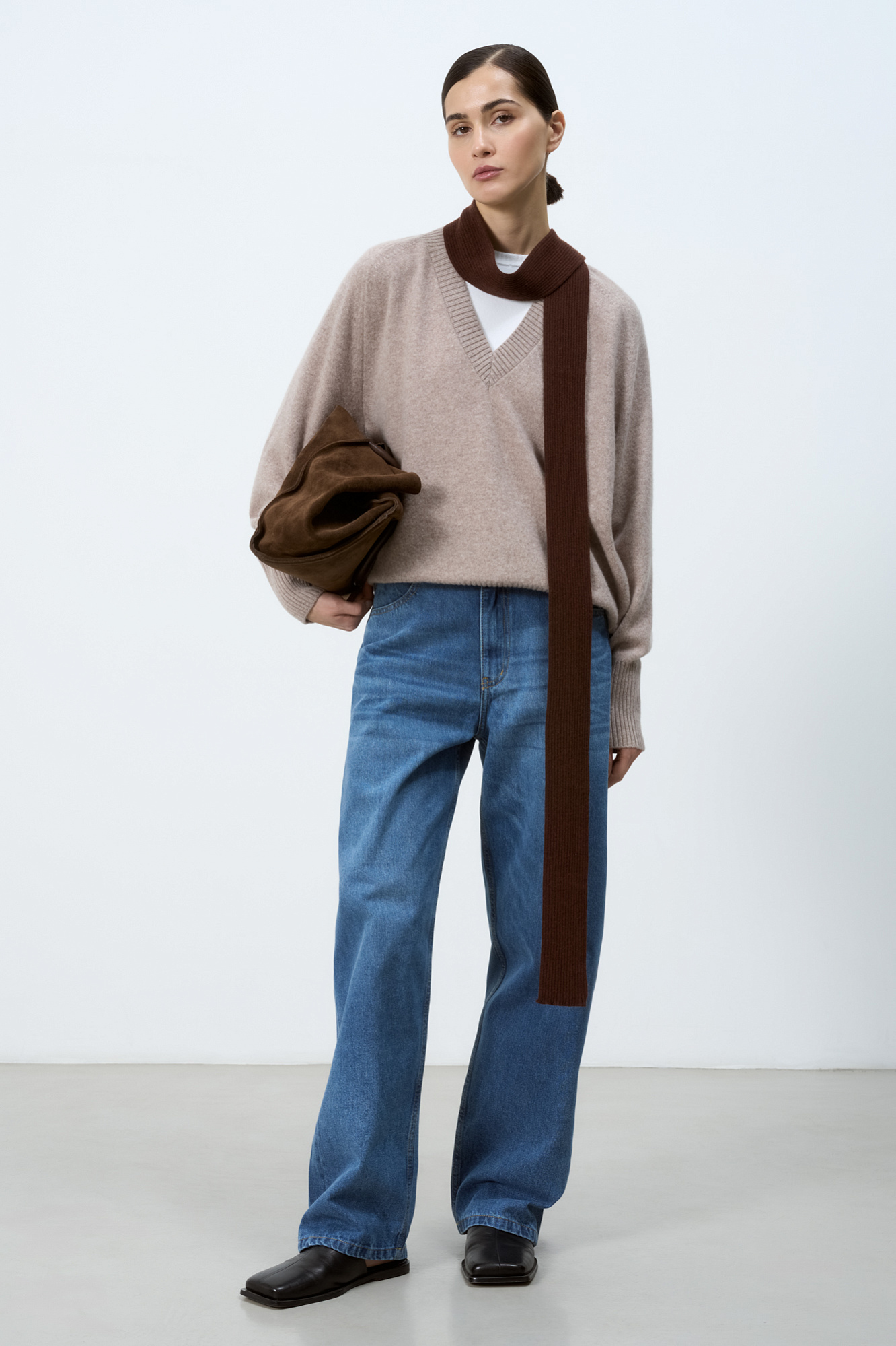 Джемпер с V-образным вырезом из 100% кашемира. Модель свободного силуэта со спущенной линией плеча. Края изделия в рубчик.