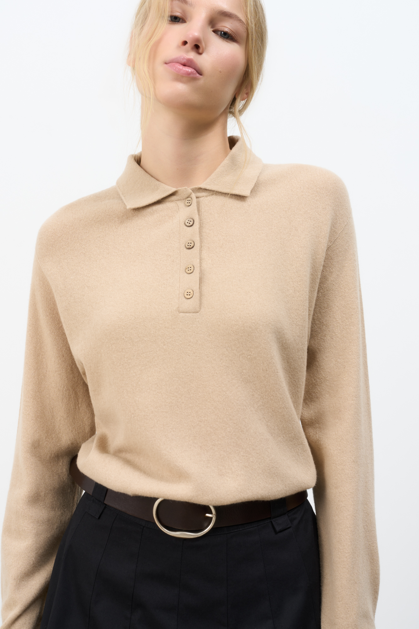 Трикотажный джемпер из кашемира и шерсти. Модель прямого силуэта со спущенной линией плеча и воротником поло на пуговицах. Манжеты рукавов и низ изделия выполнен в рубчик.