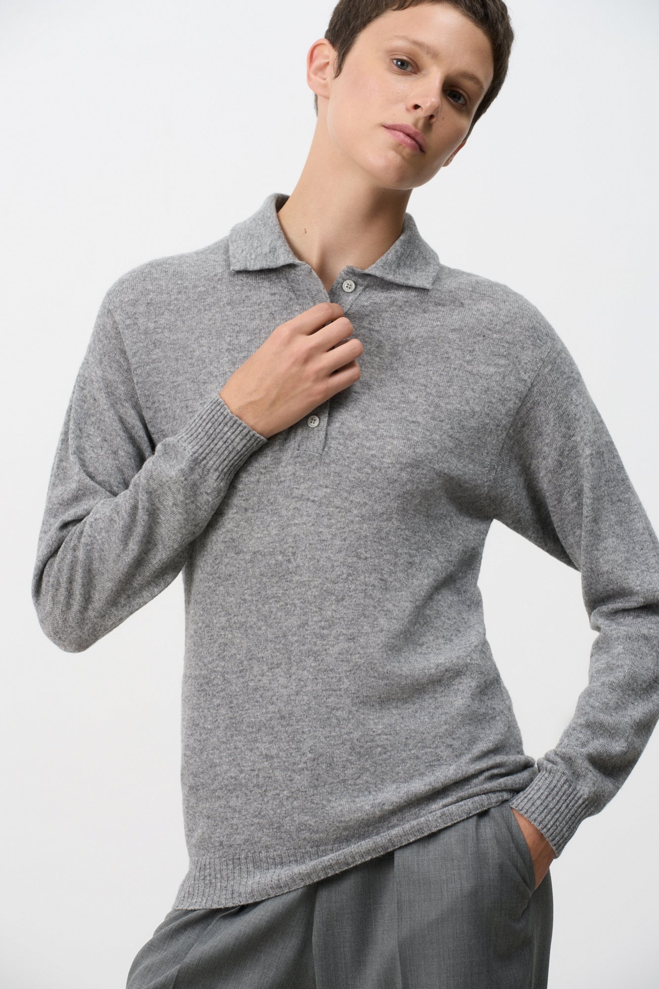 Трикотажный джемпер из кашемира и шерсти. Модель прямого силуэта со спущенной линией плеча и воротником поло на пуговицах. Манжеты рукавов и низ изделия выполнен в рубчик.