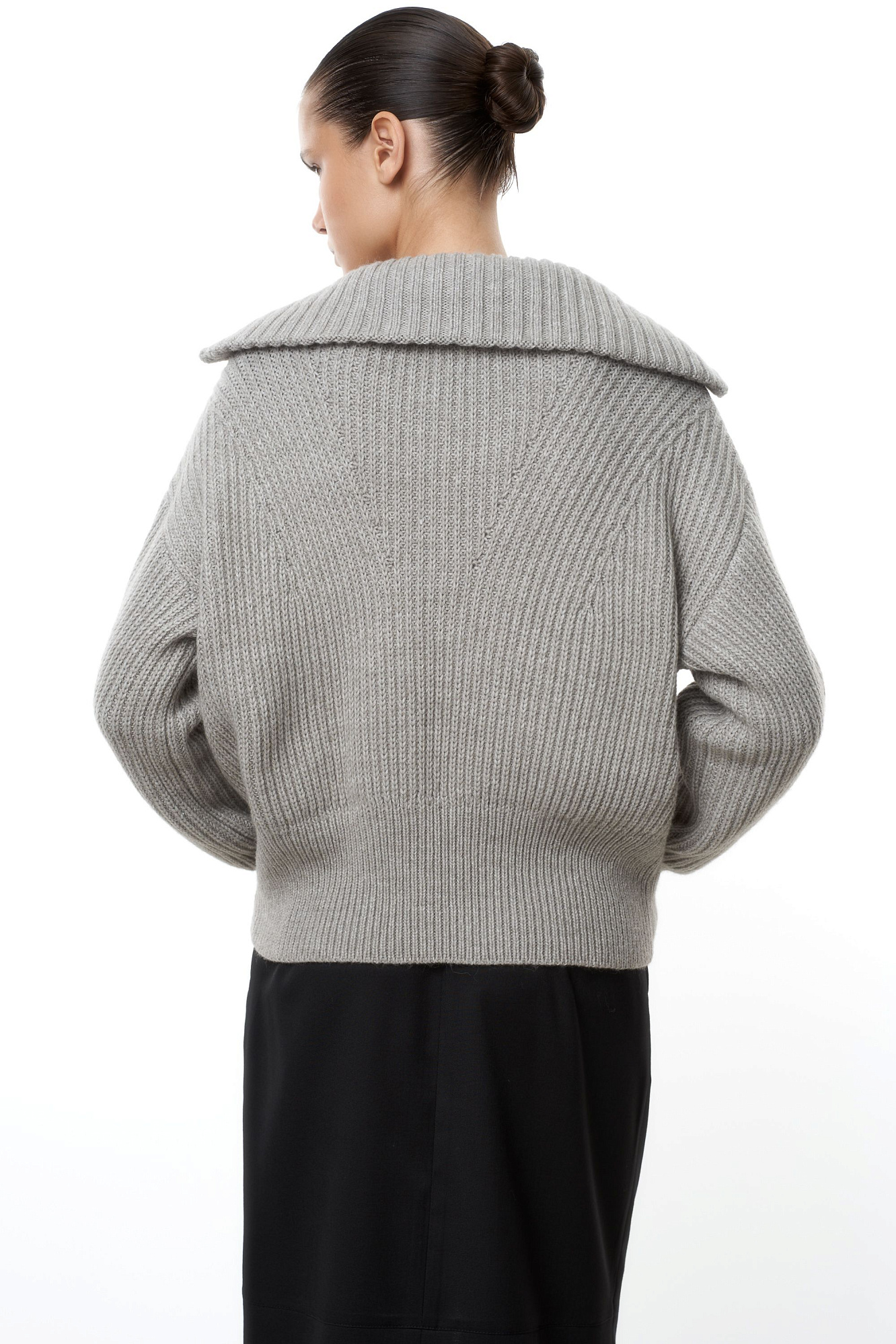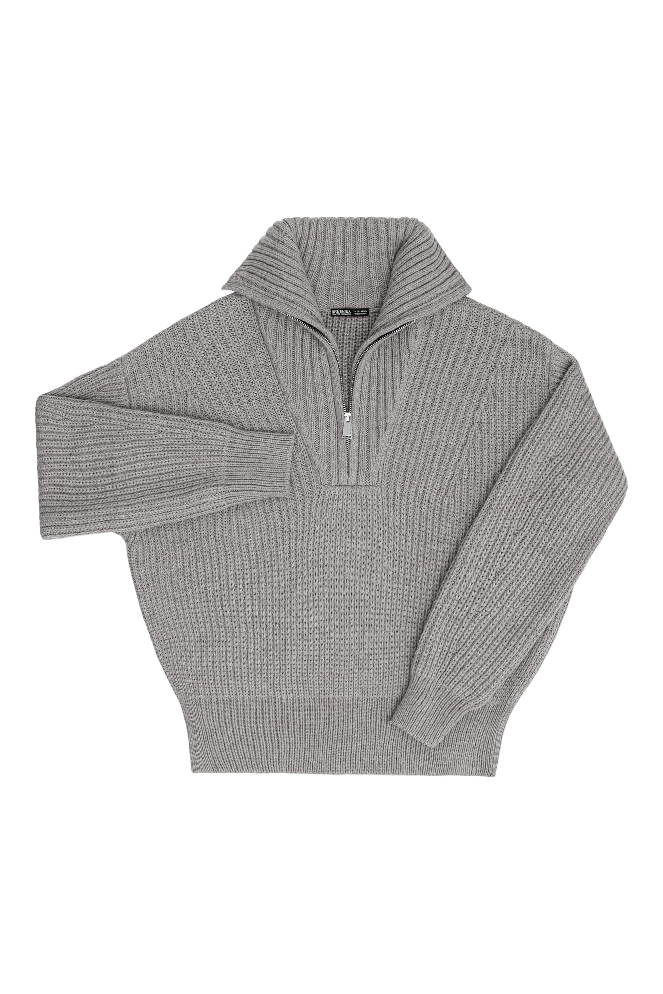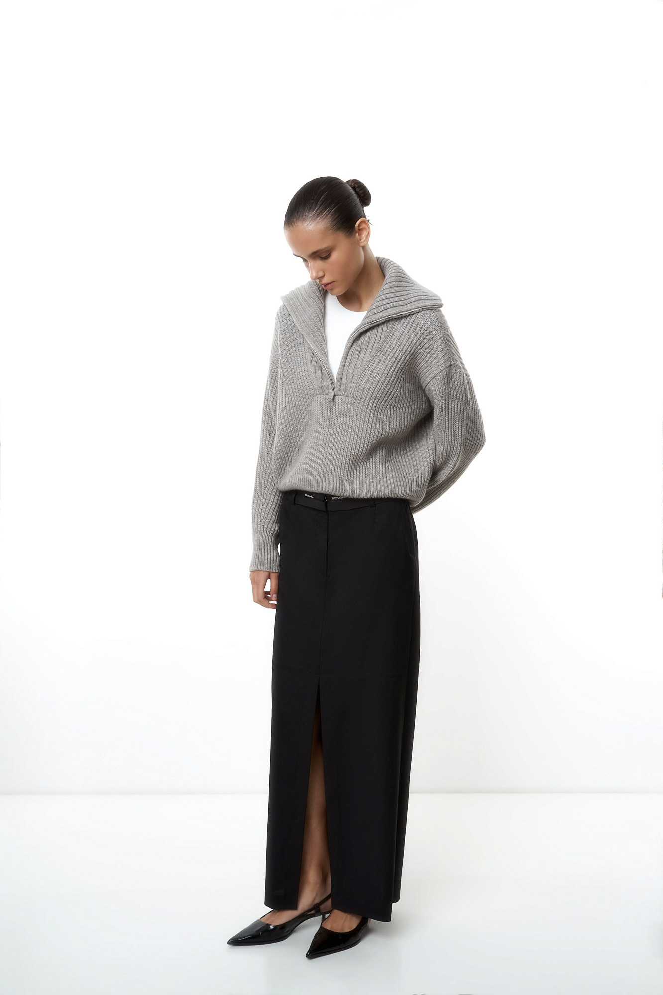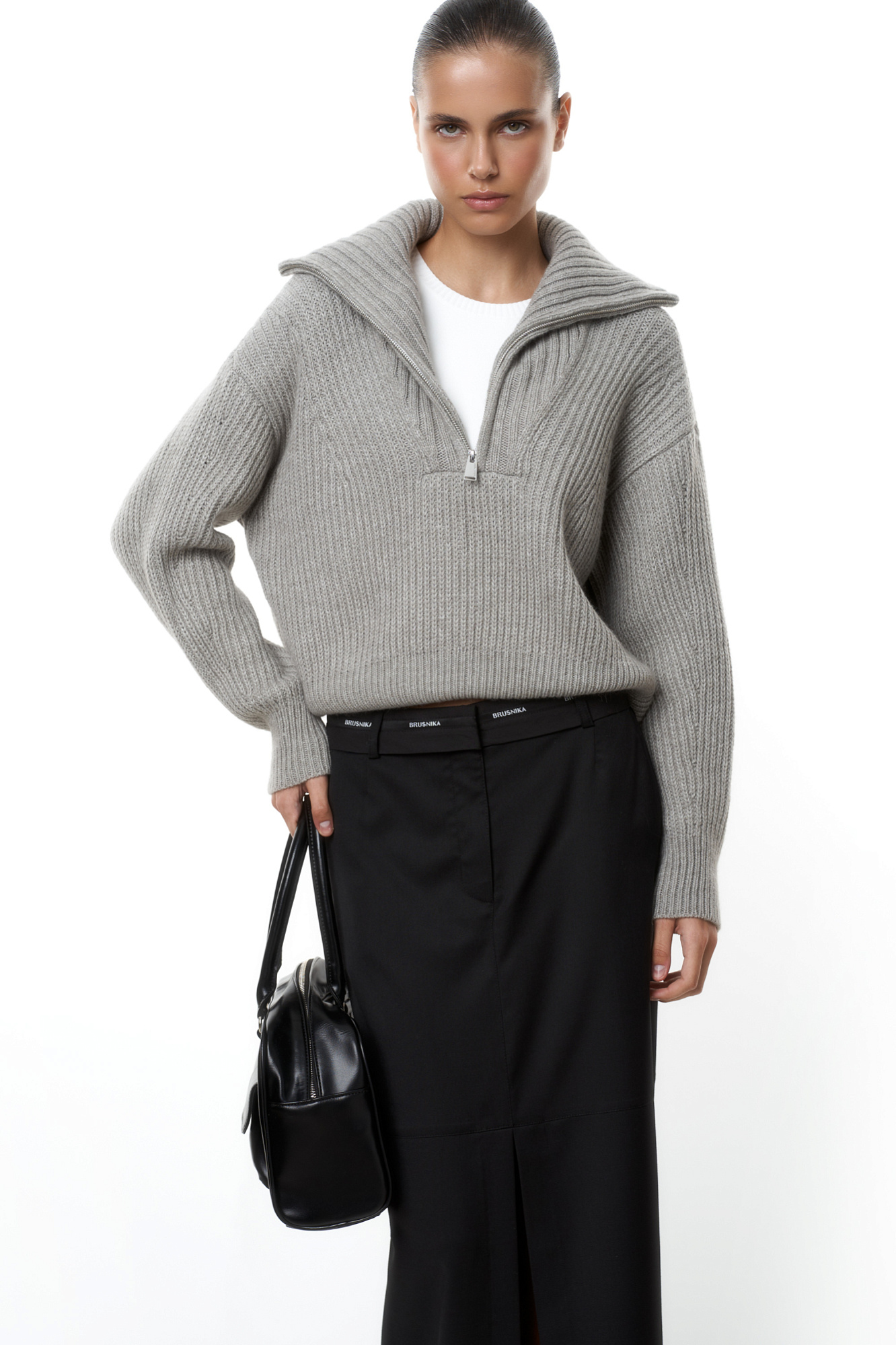 Трикотажный джемпер с шерстью альпака. Модель свободного силуэта со спущенной линией плеча и высоким воротом. Застежка на молнию, края изделия в рубчик.