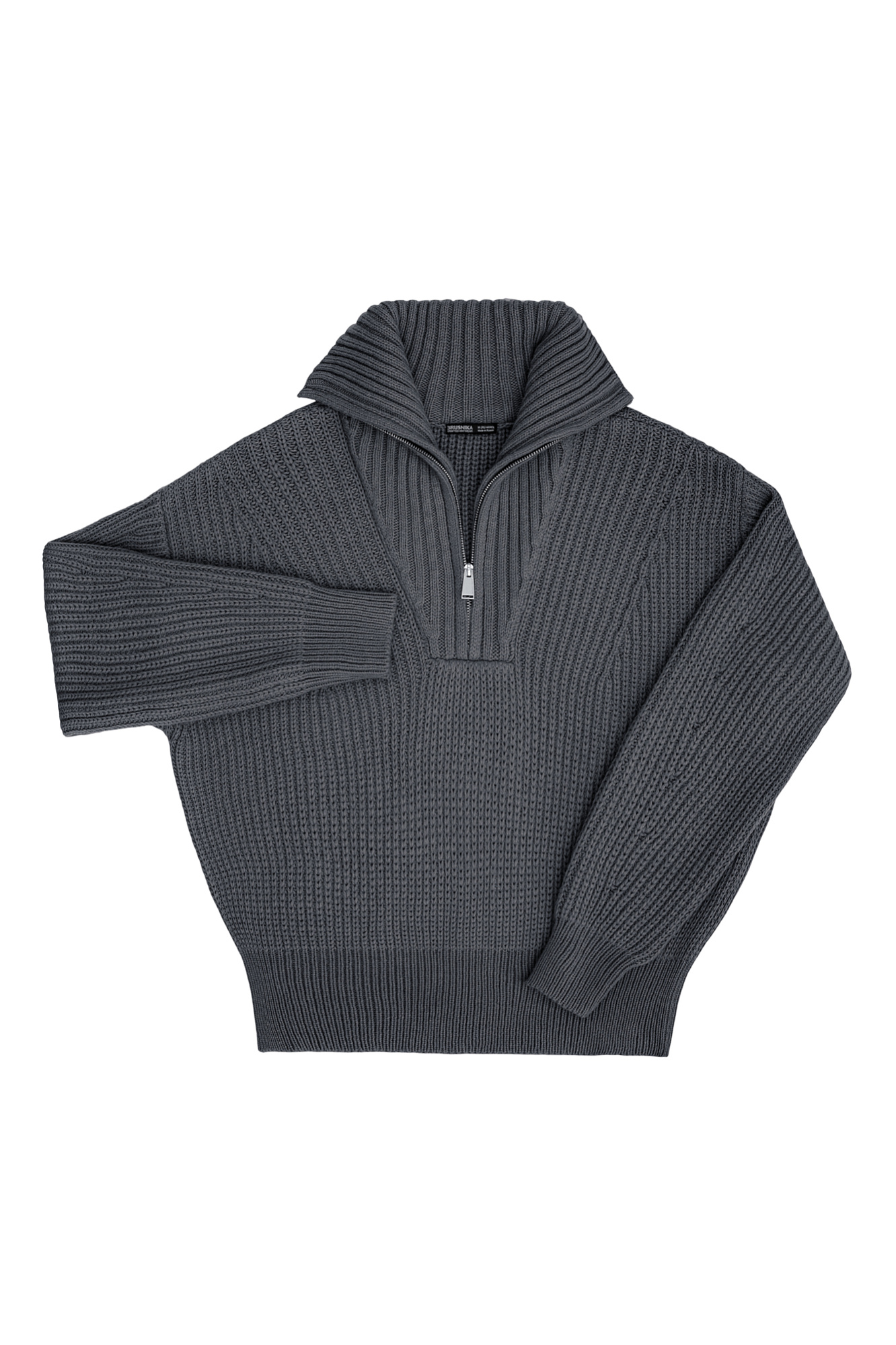 Трикотажный джемпер с шерстью альпака. Модель свободного силуэта со спущенной линией плеча и высоким воротом. Застежка на молнию, края изделия в рубчик.