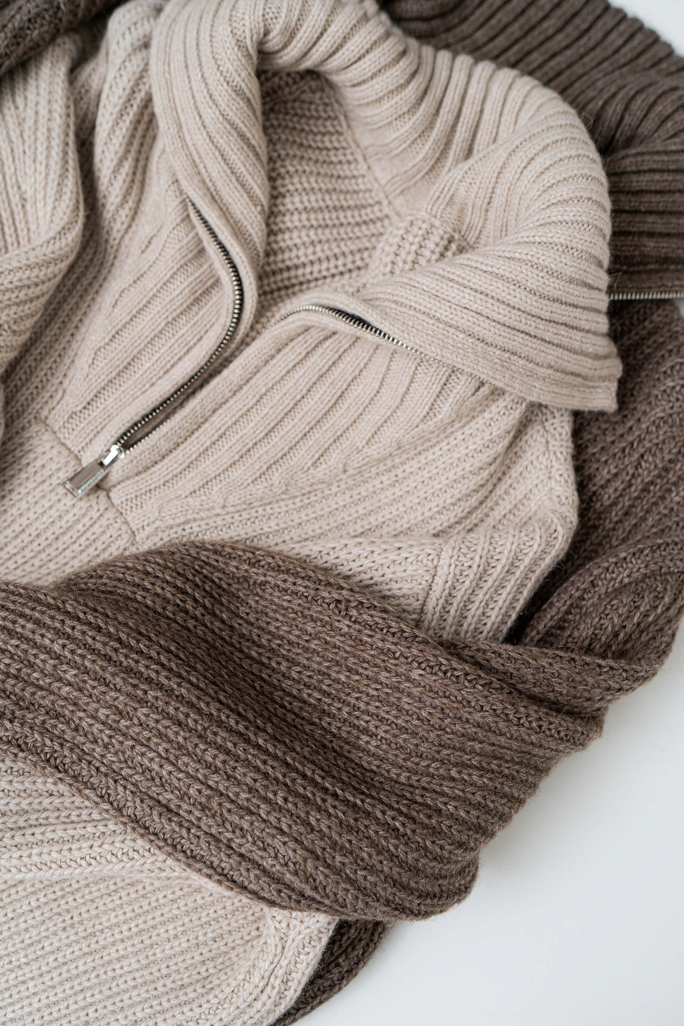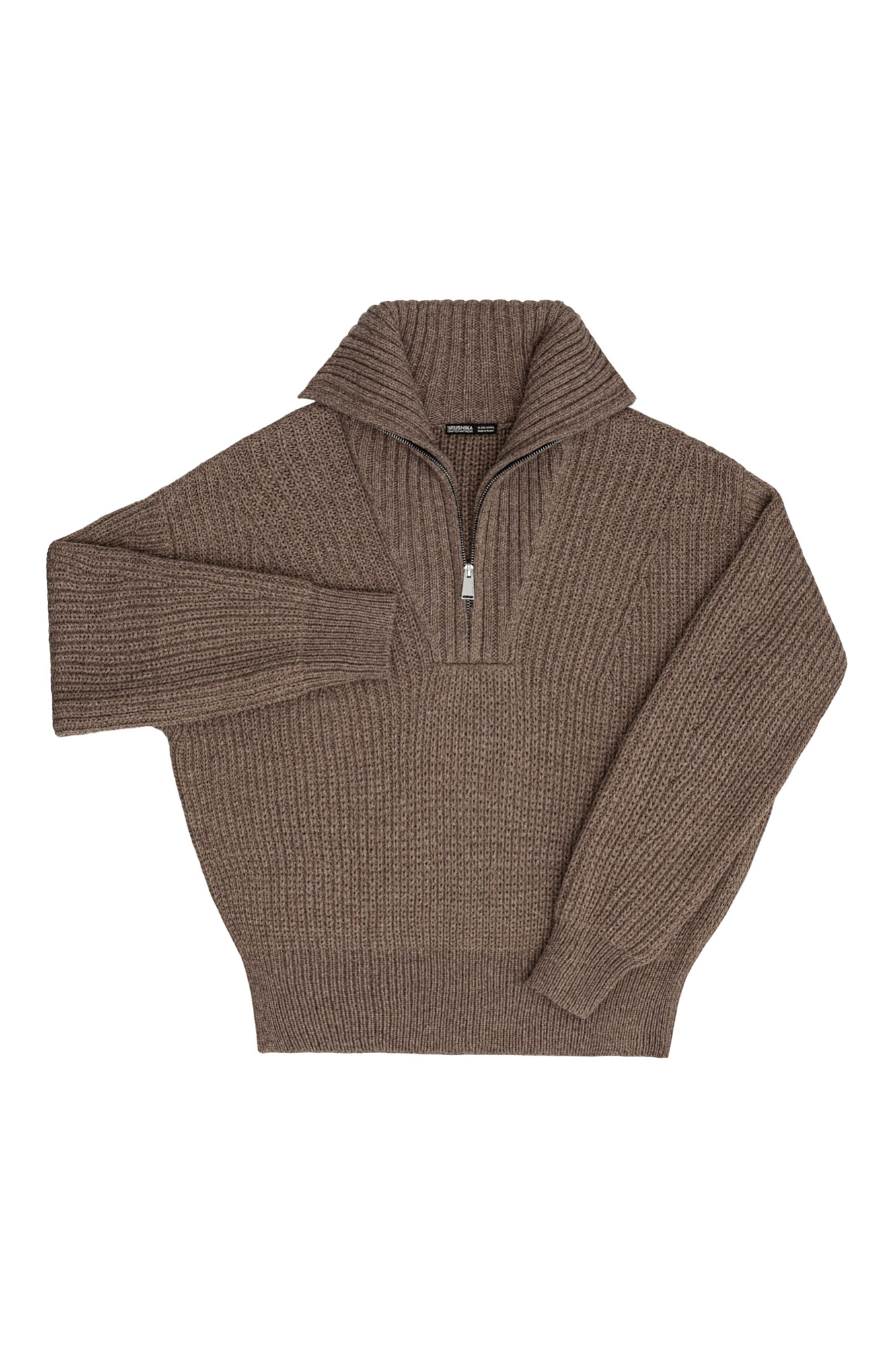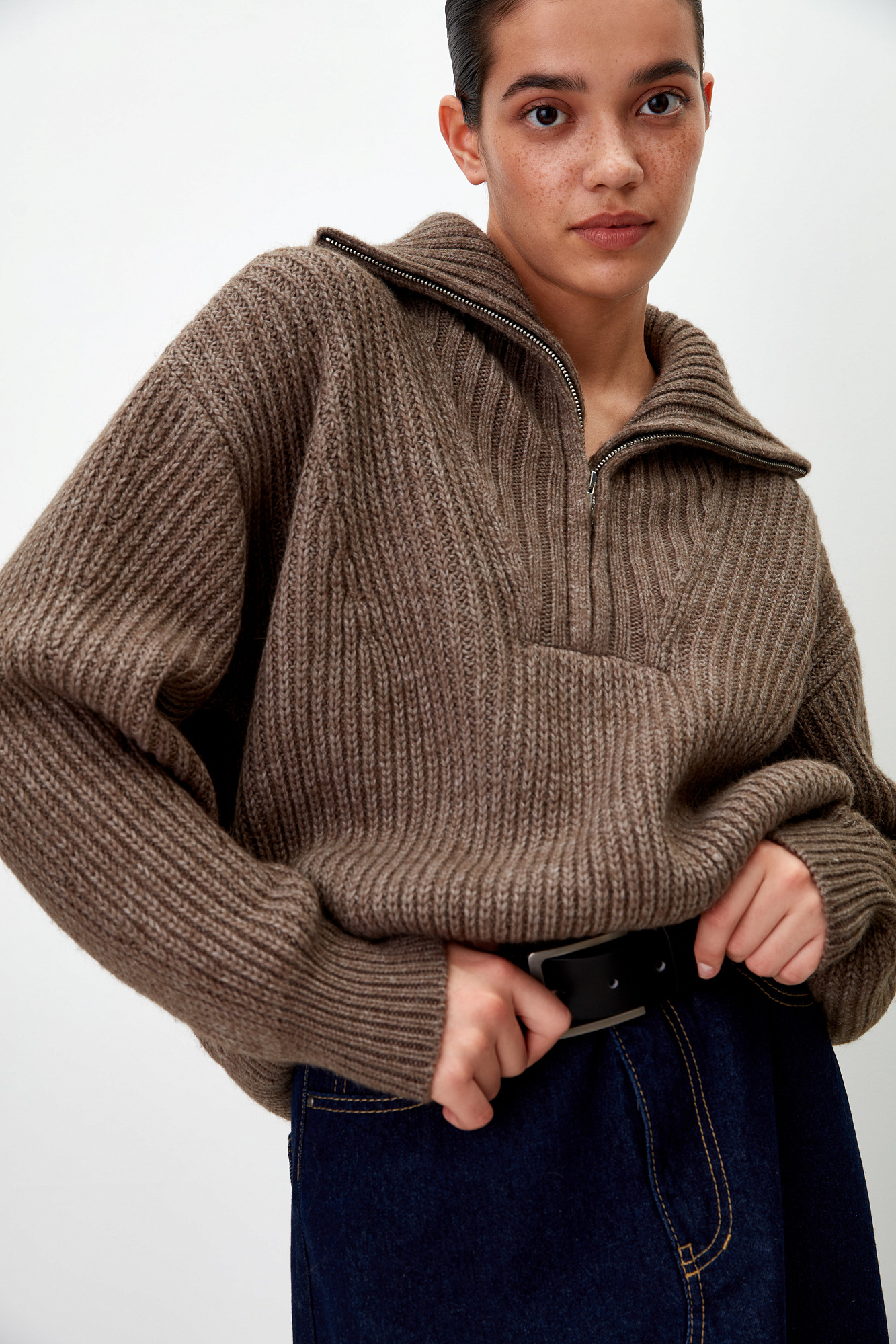 Трикотажный джемпер с шерстью альпака. Модель свободного силуэта со спущенной линией плеча и высоким воротом. Застежка на молнию, края изделия в рубчик.