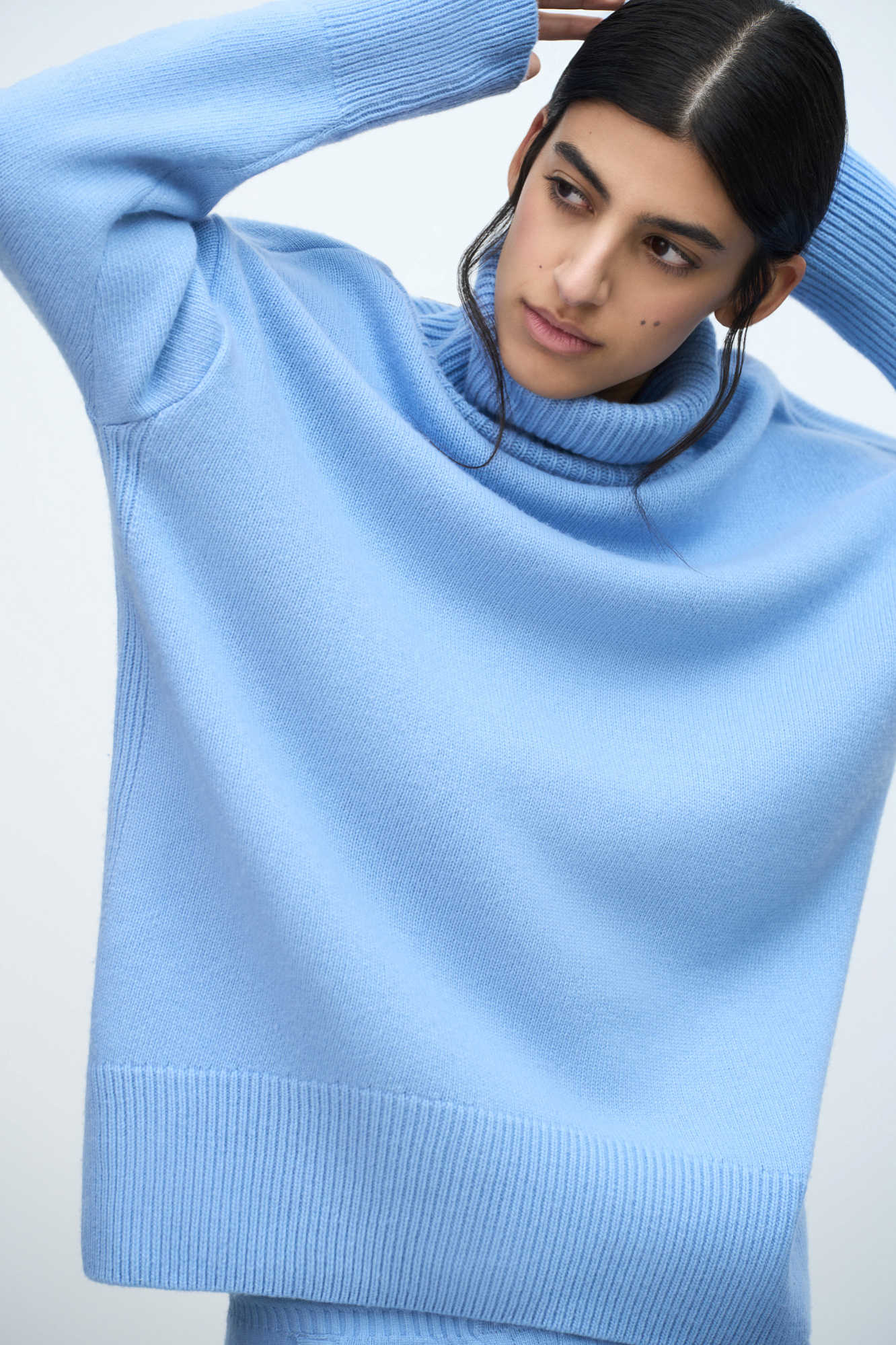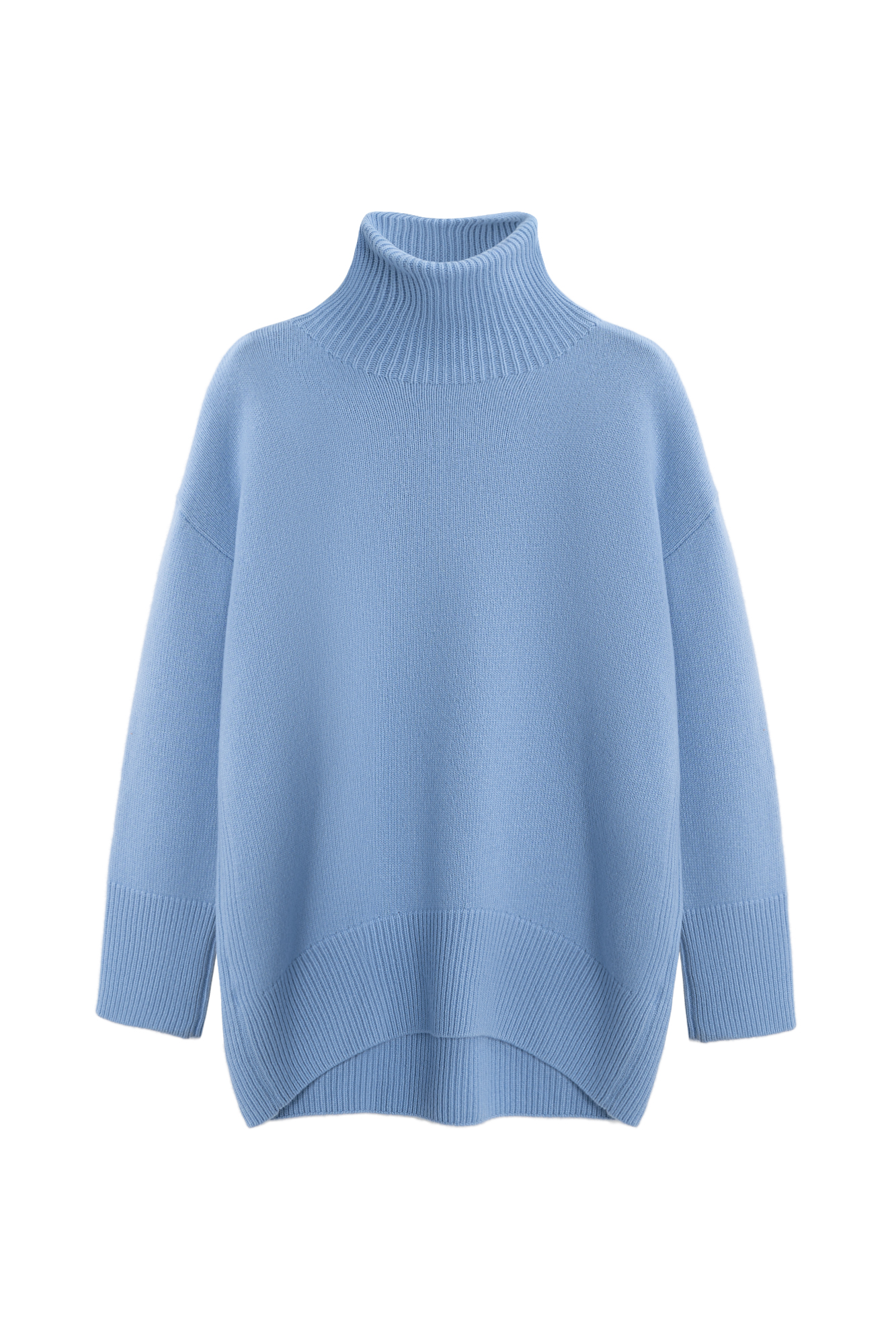 Трикотажный джемпер из мягкой шерсти с добавлением кашемира. Высокий ворот, заниженная линия плеч, удлиненная спинка. Края изделия сделаны в широкий рубчик. Можно дополнить комплектными брюками.