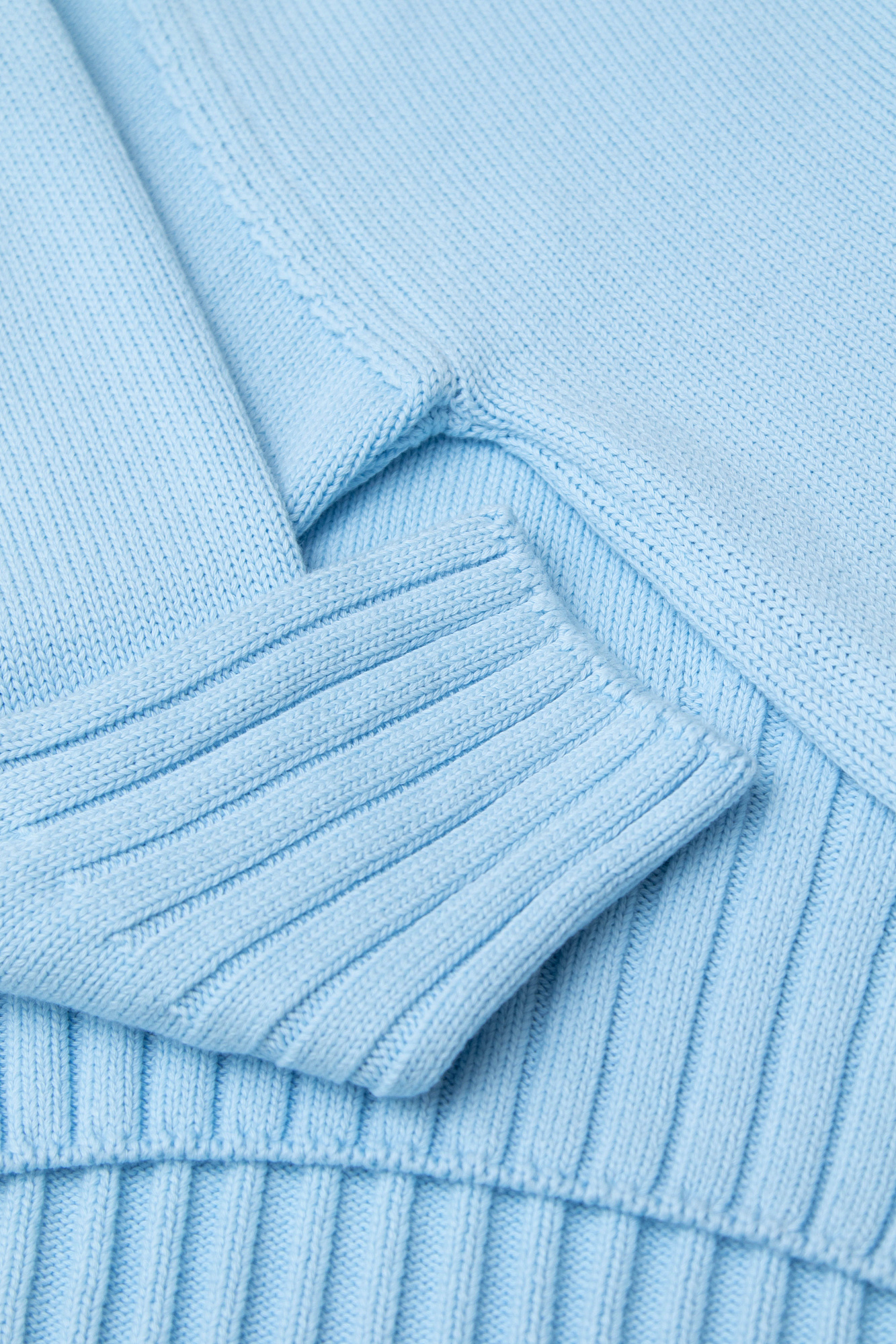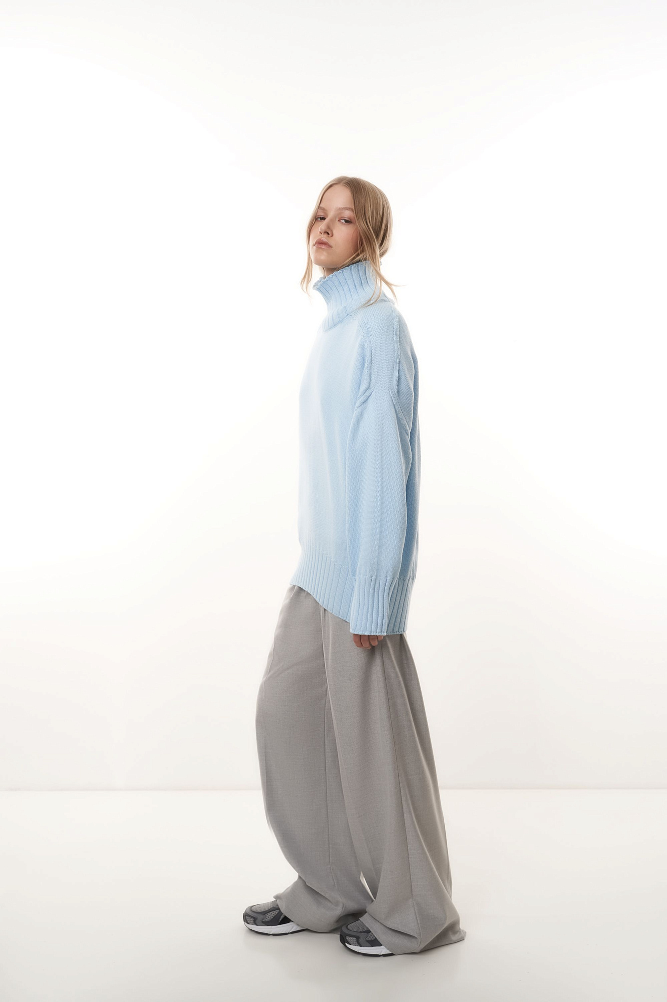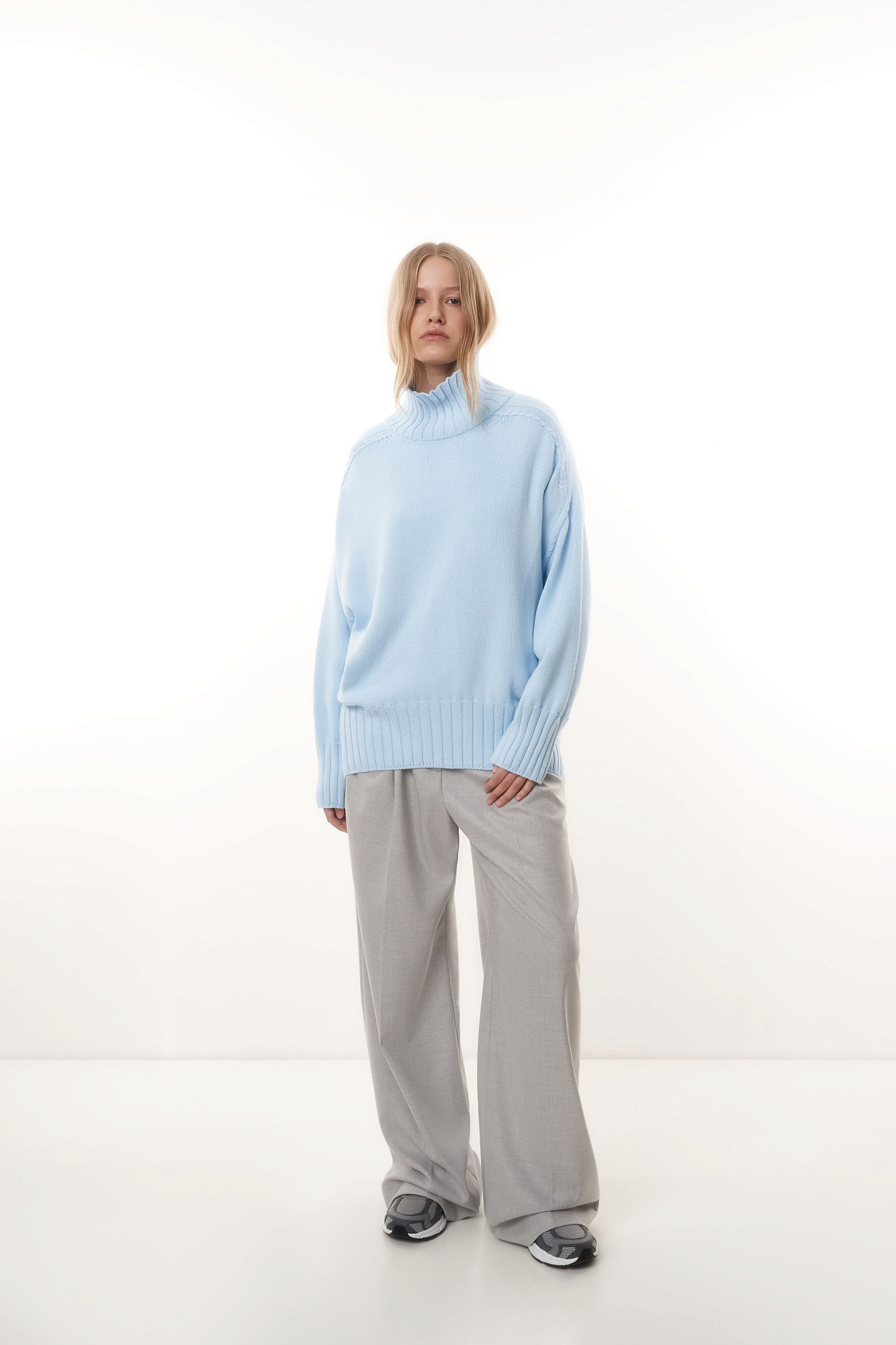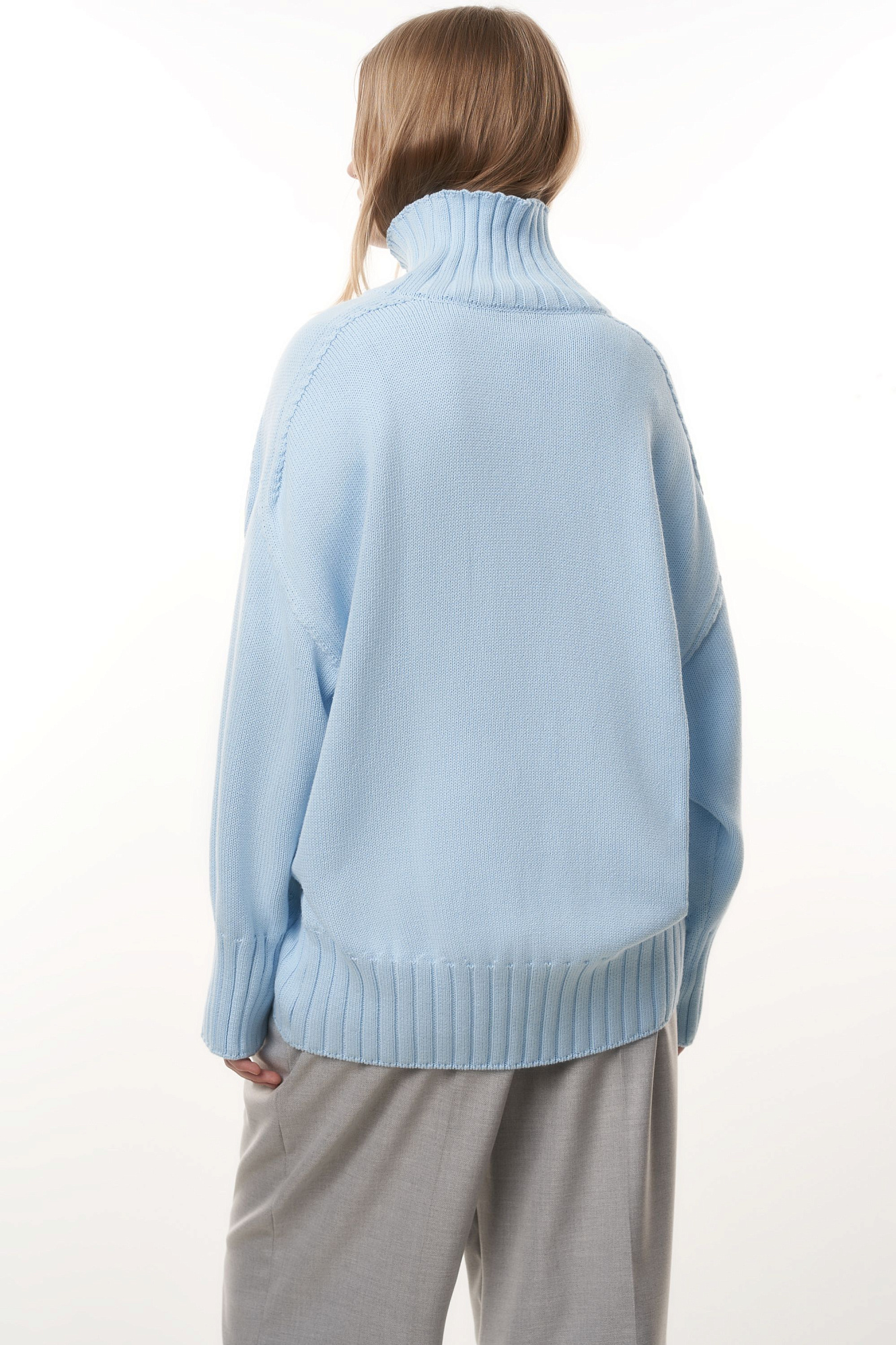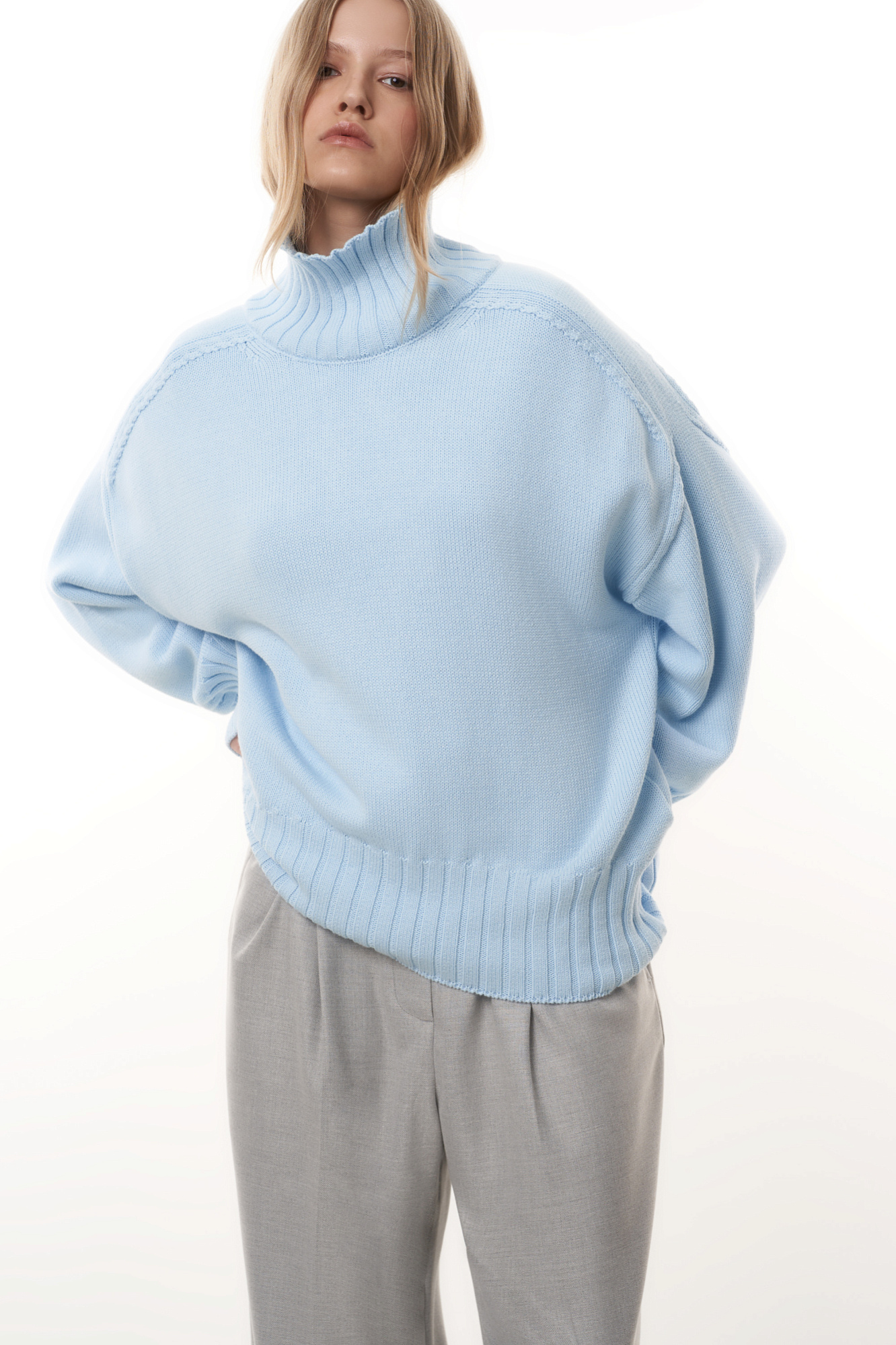 Объемный джемпер крупной вязки из 100% хлопка с высоким горлом. Манжеты и низ изделия в рубчик.