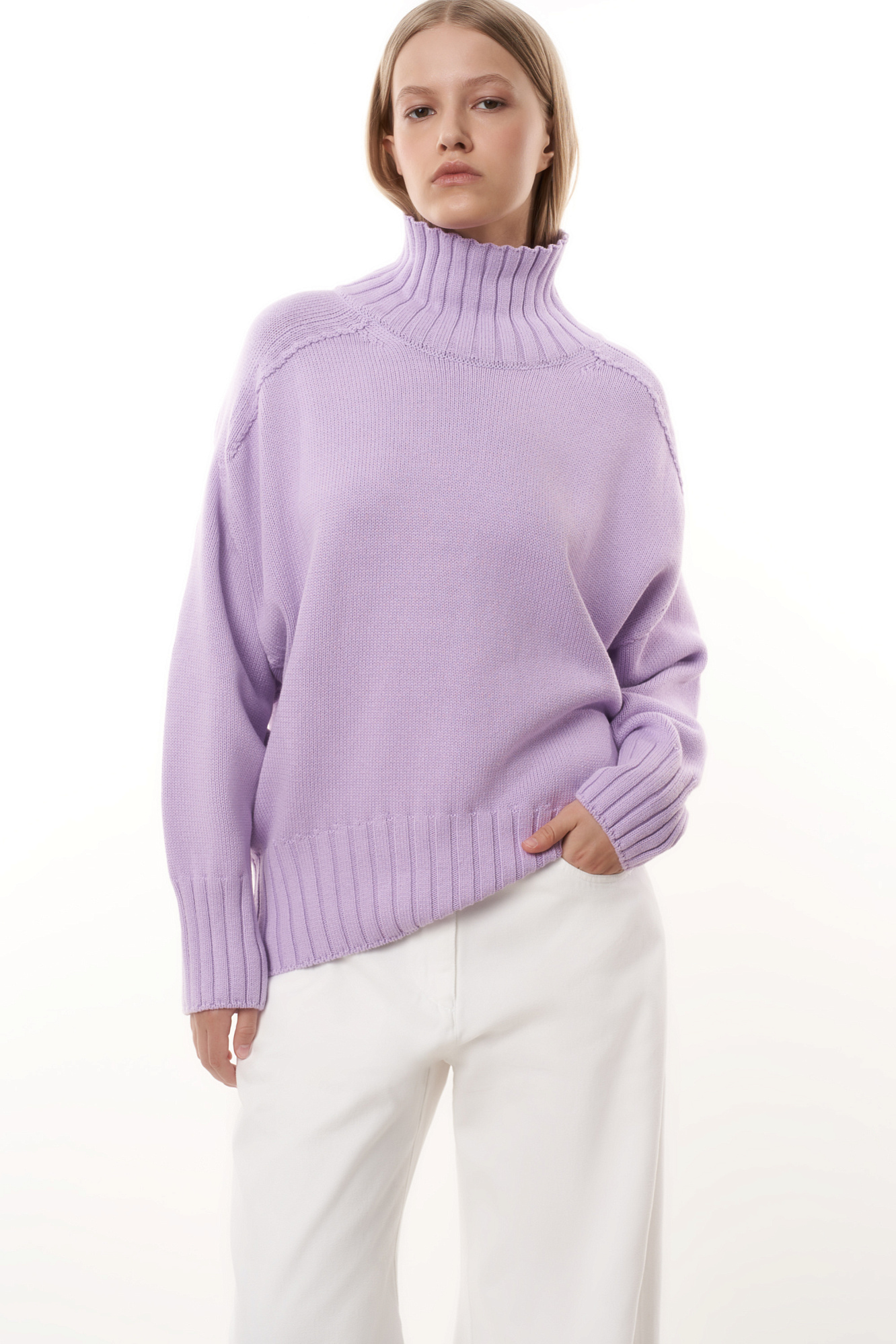 Объемный джемпер крупной вязки из 100% хлопка с высоким горлом. Манжеты и низ изделия в рубчик.