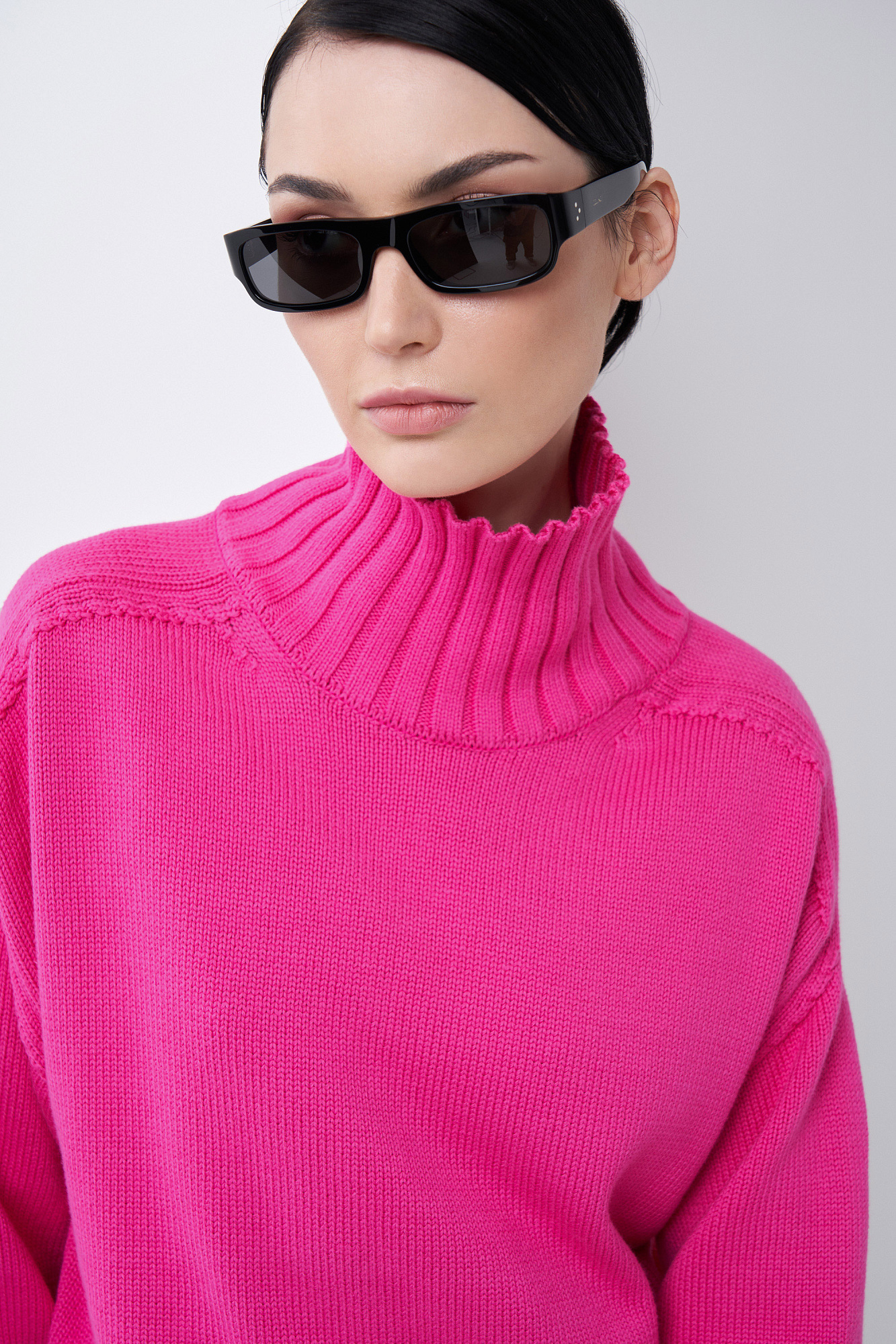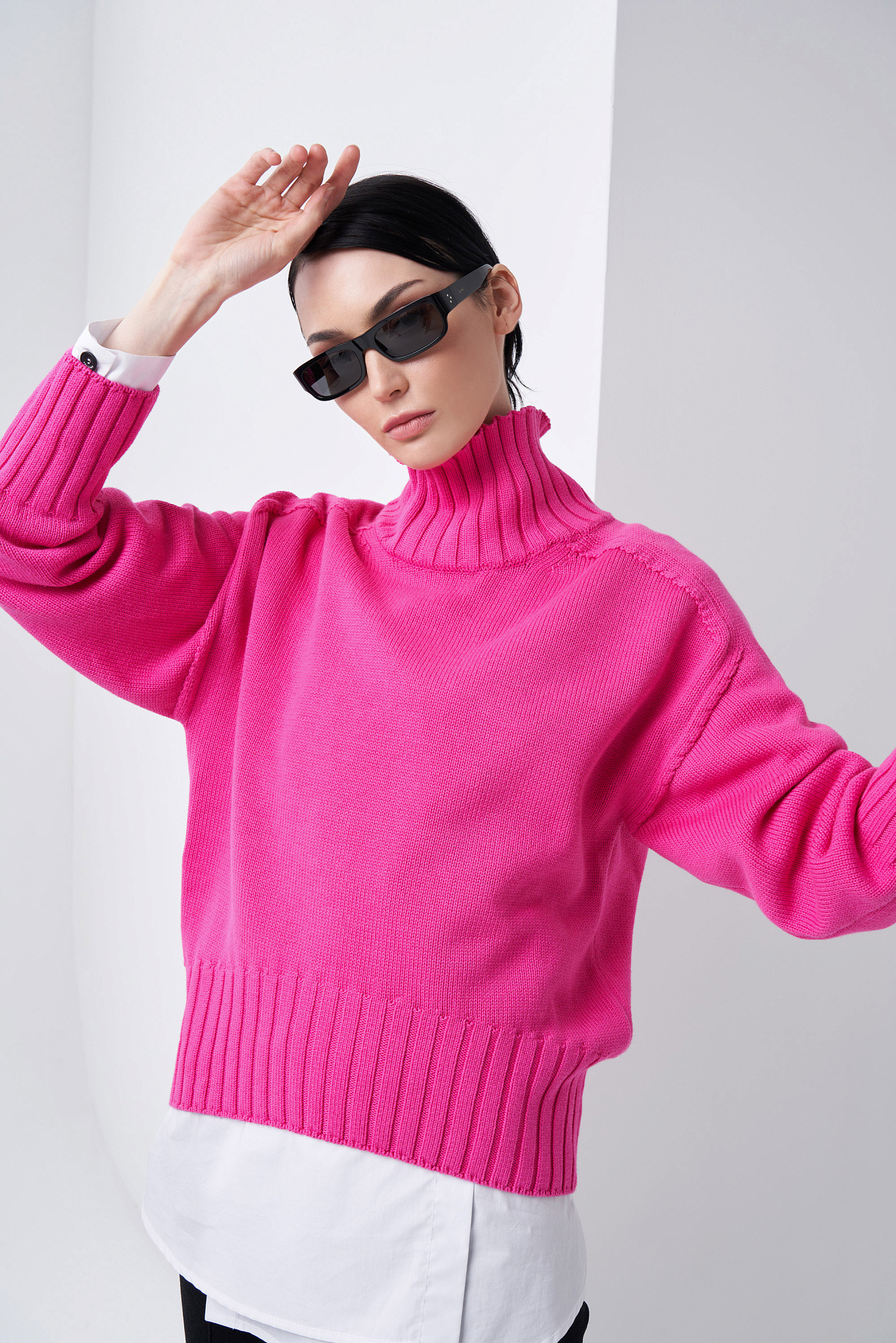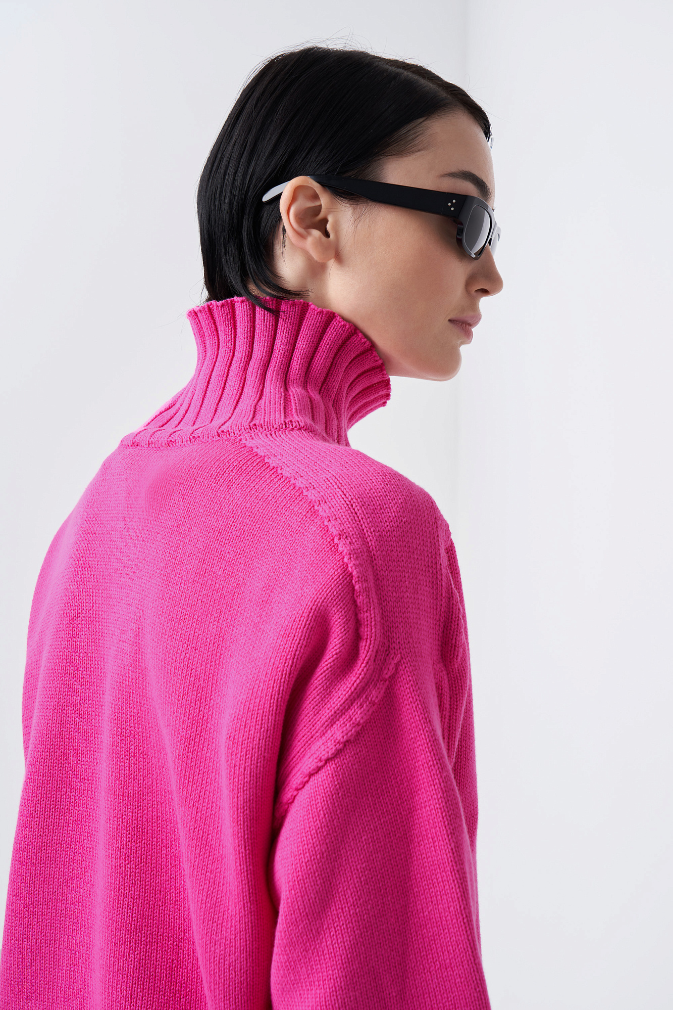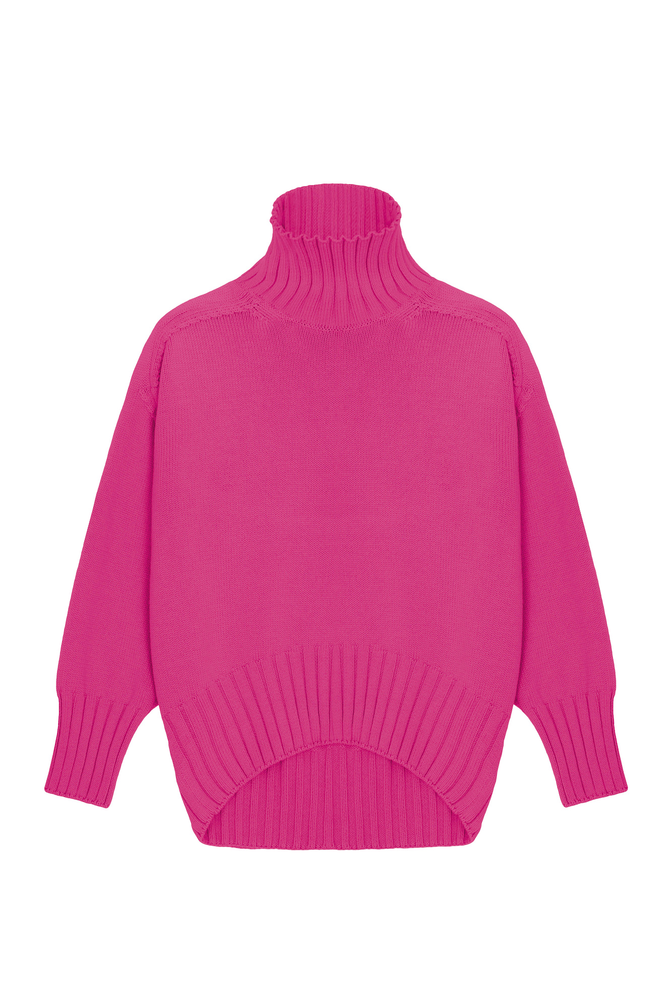Объемный джемпер крупной вязки из 100% хлопка с высоким горлом. Манжеты и низ изделия в рубчик.