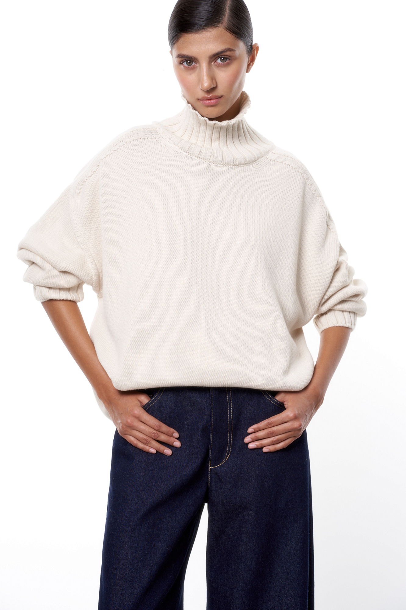 Объемный джемпер крупной вязки из 100% хлопка с высоким горлом. Манжеты и низ изделия в рубчик.