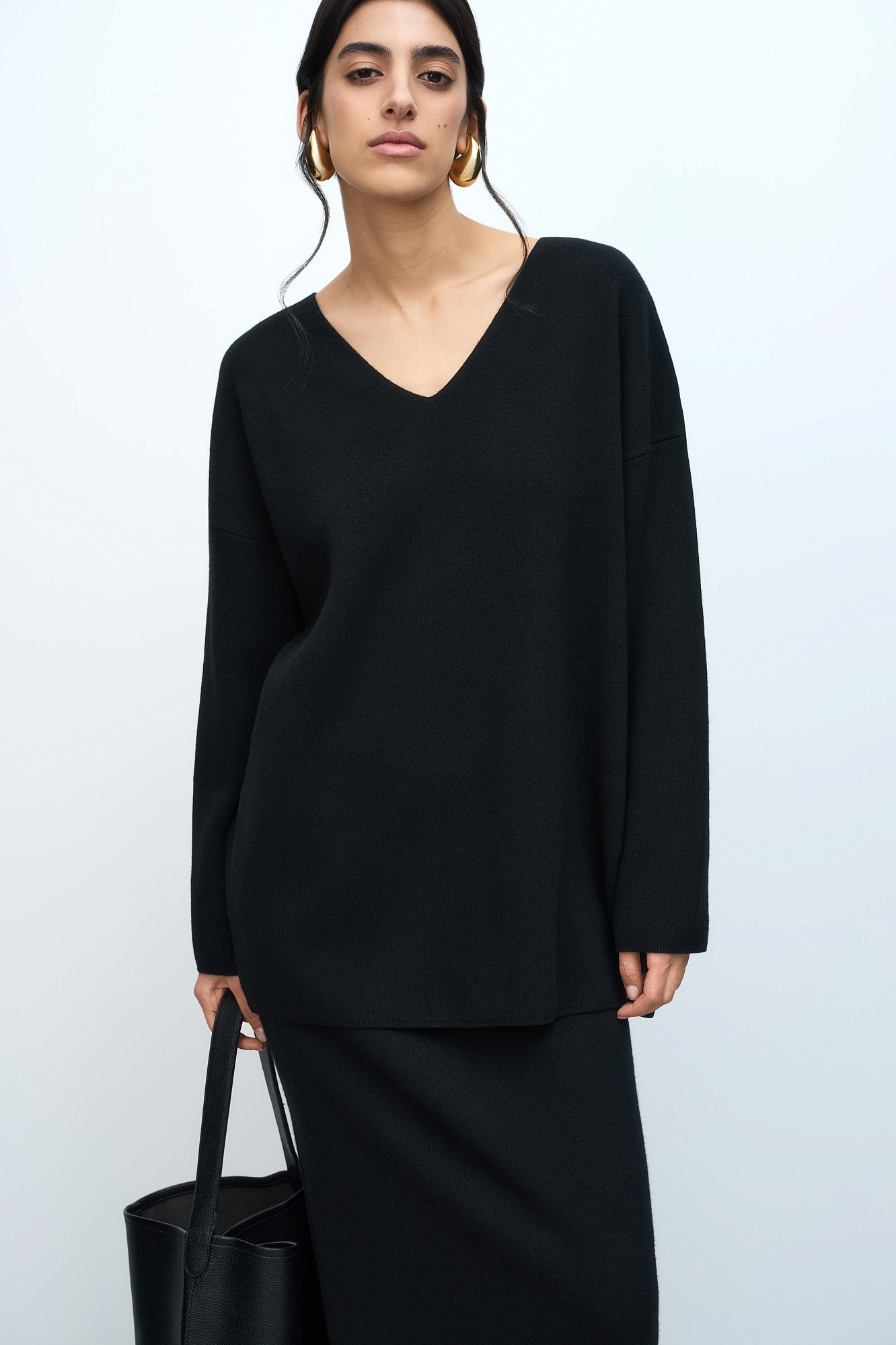 Удлиненный трикотажный джемпер из шерсти с добавлением кашемира. Модель свободного силуэта со спущенной линией плеча и глубоким V-образным вырезом. Дополнить образ можно комплектной юбкой.