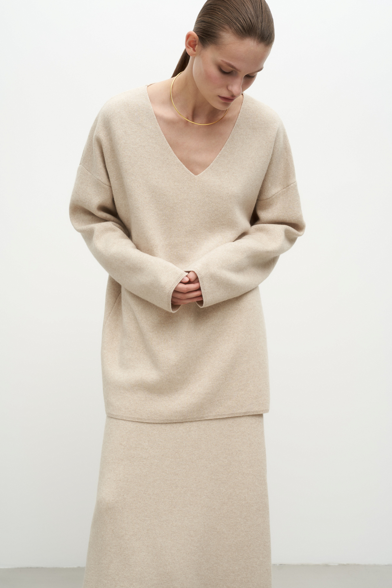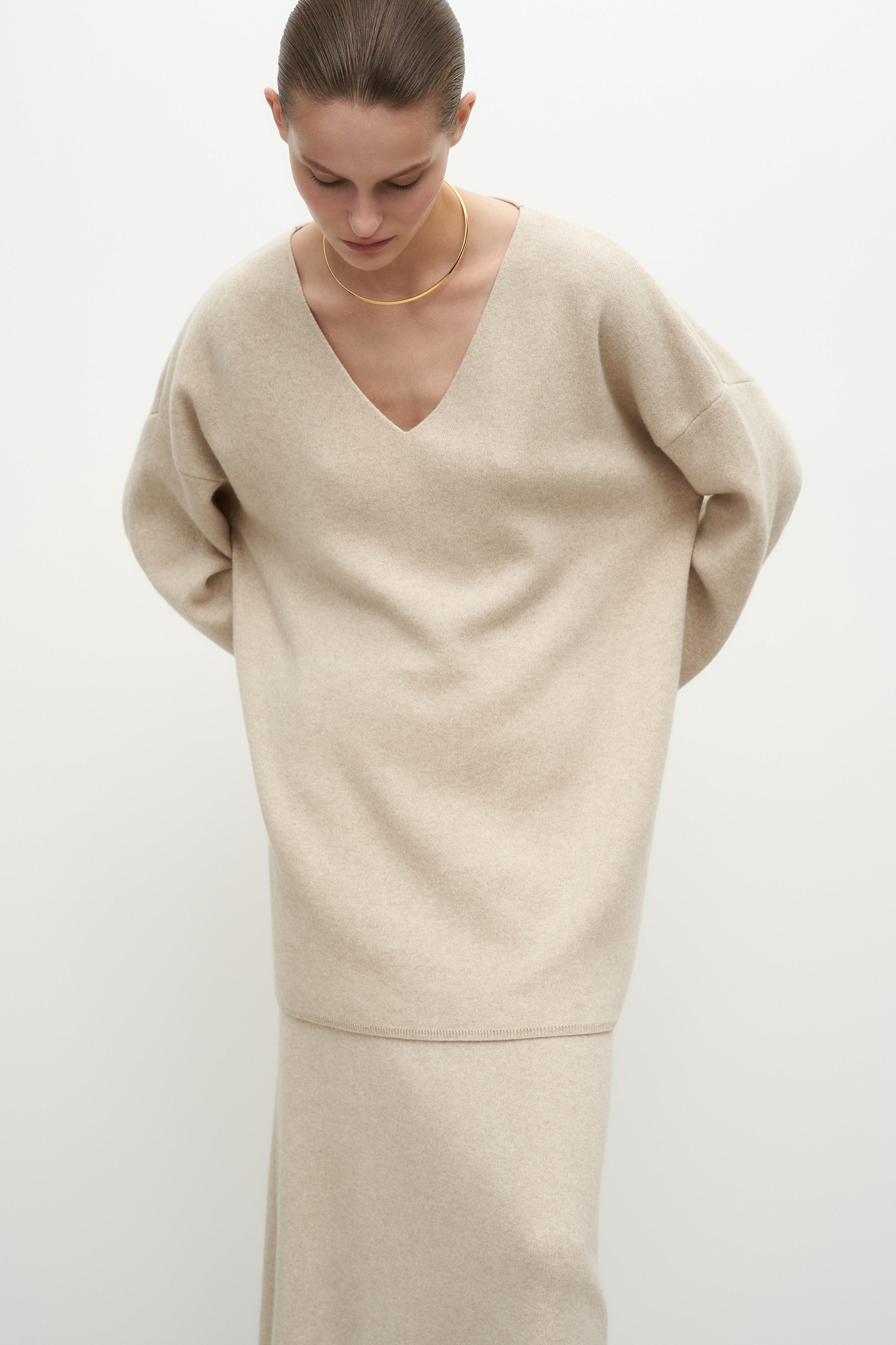 Удлиненный трикотажный джемпер из шерсти с добавлением кашемира. Модель свободного силуэта со спущенной линией плеча и глубоким V-образным вырезом. Дополнить образ можно комплектной юбкой.