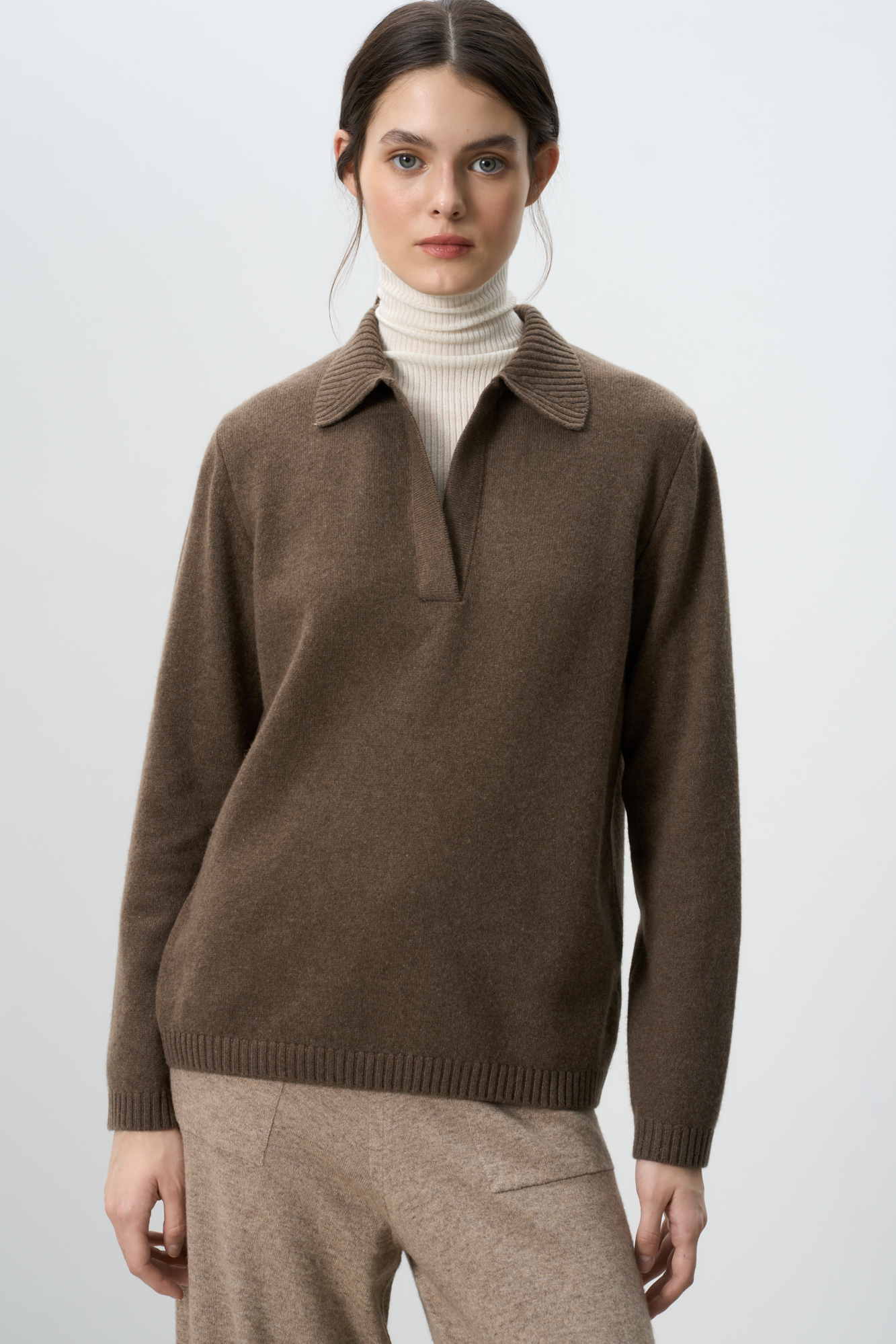 Трикотажный джемпер с воротником-поло из 100% кашемира. Модель свободного силуэта, края изделия выполнены в рубчик.