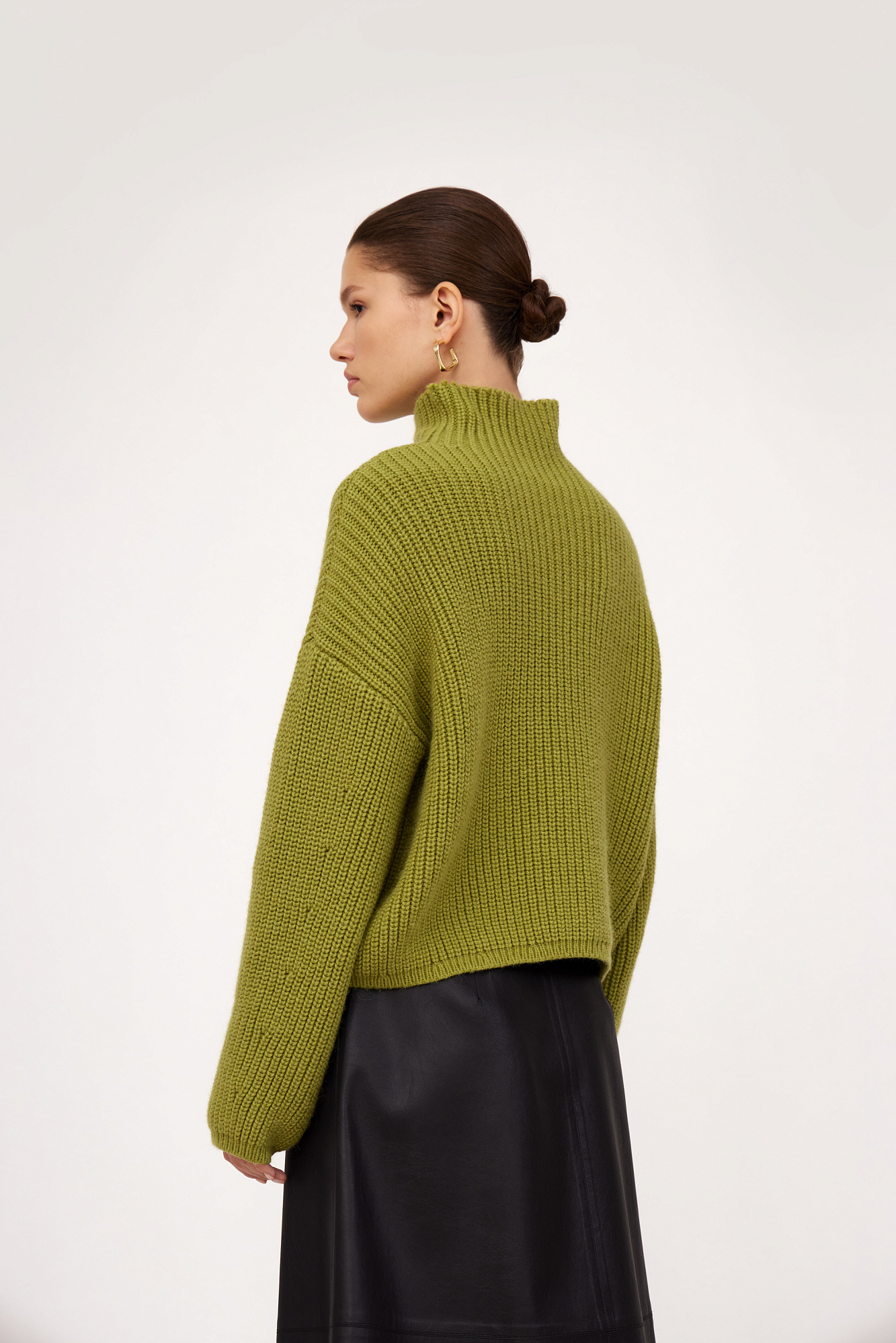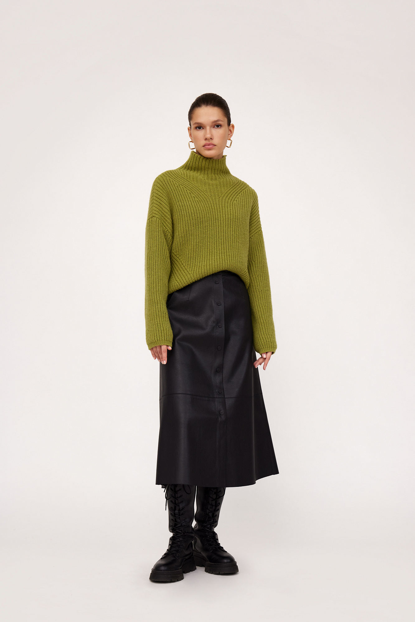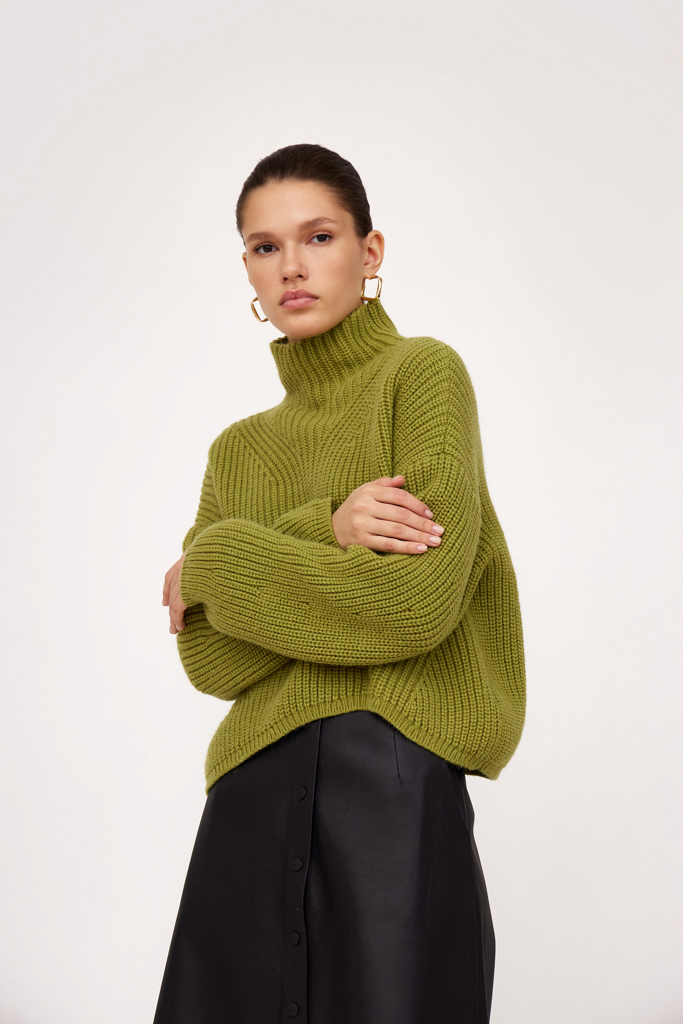 Трикотажный джемпер из шерсти Альпака с асимметричным нижним краем и декоративными дорожками. Модель свободного силуэта со спущенным плечом.