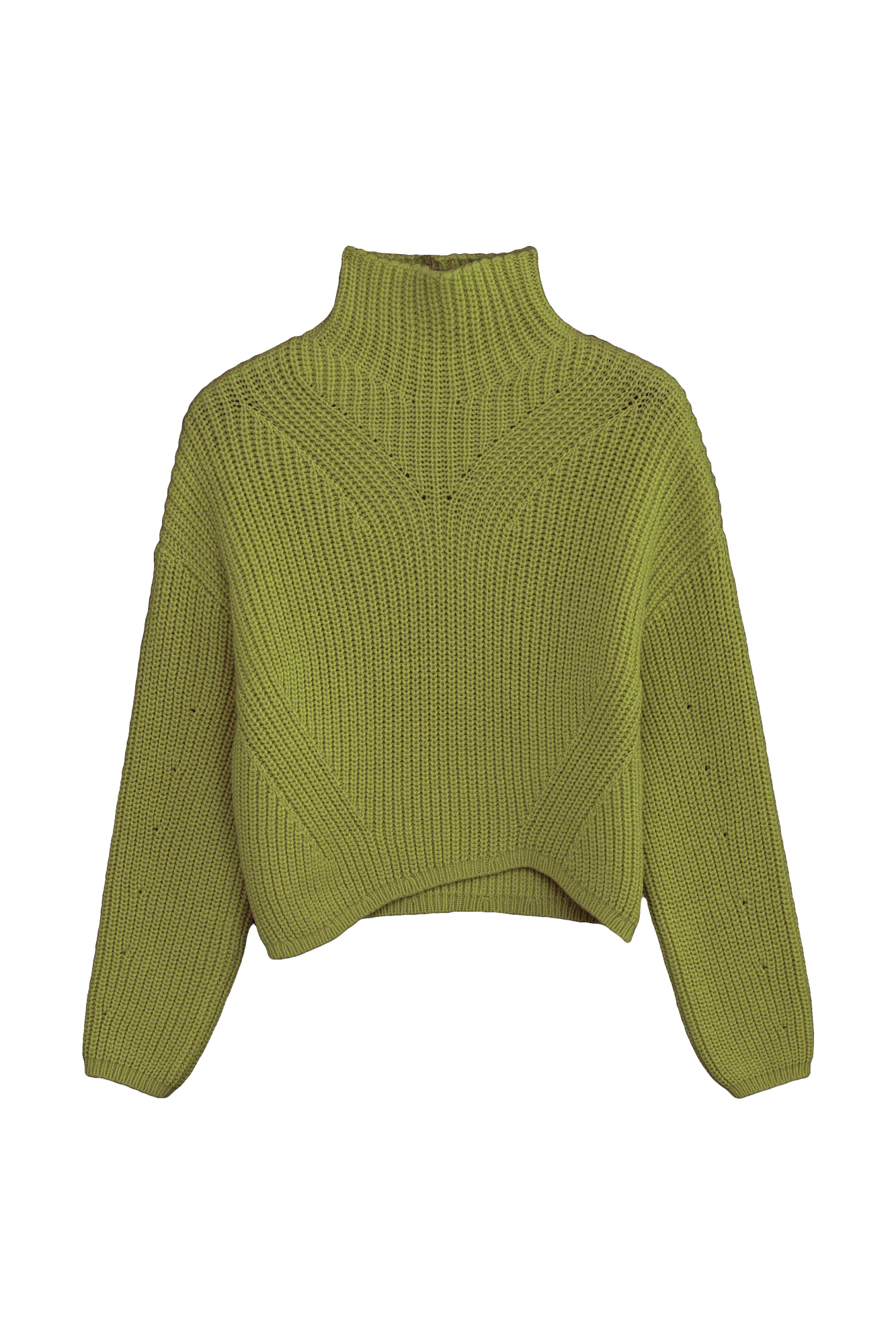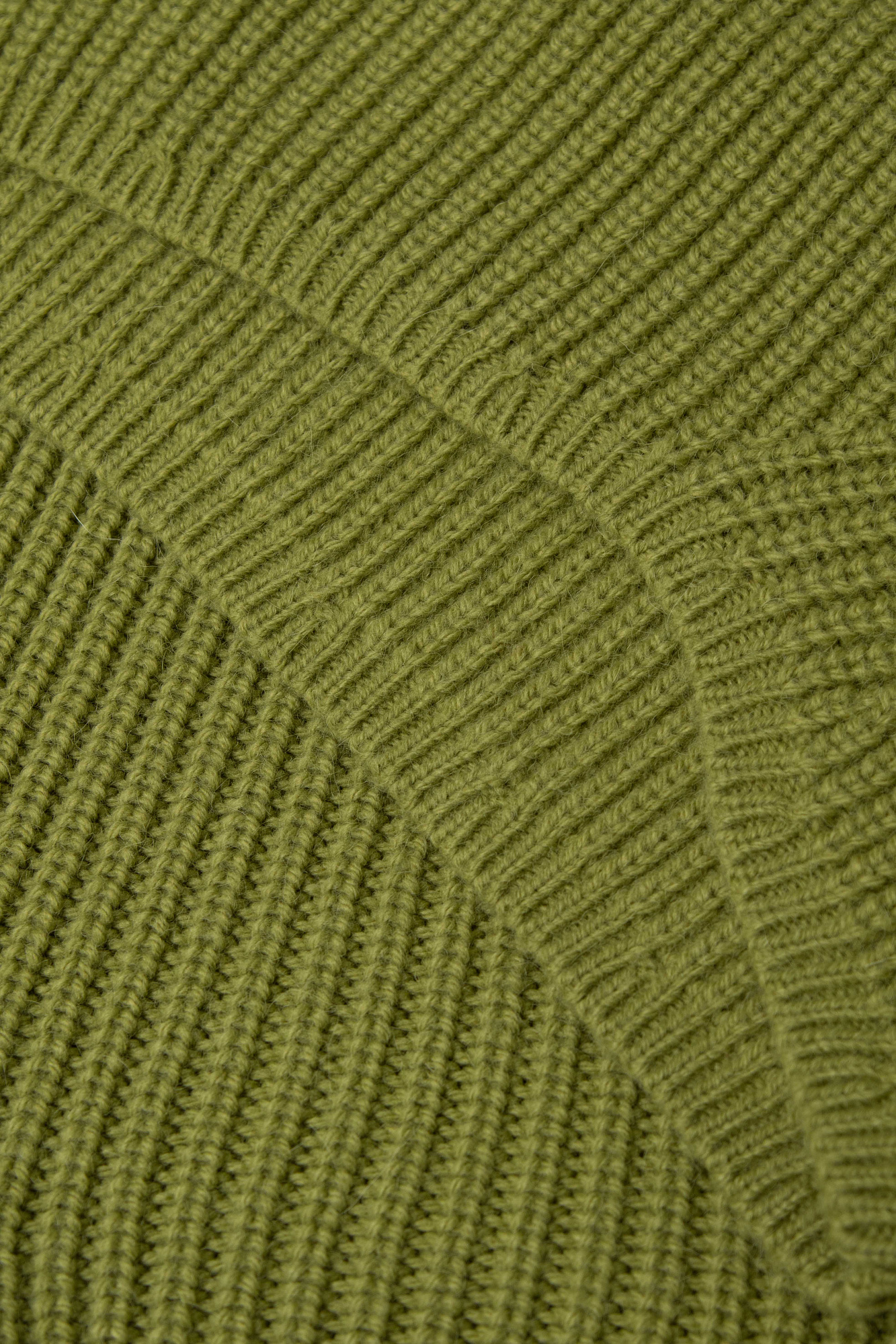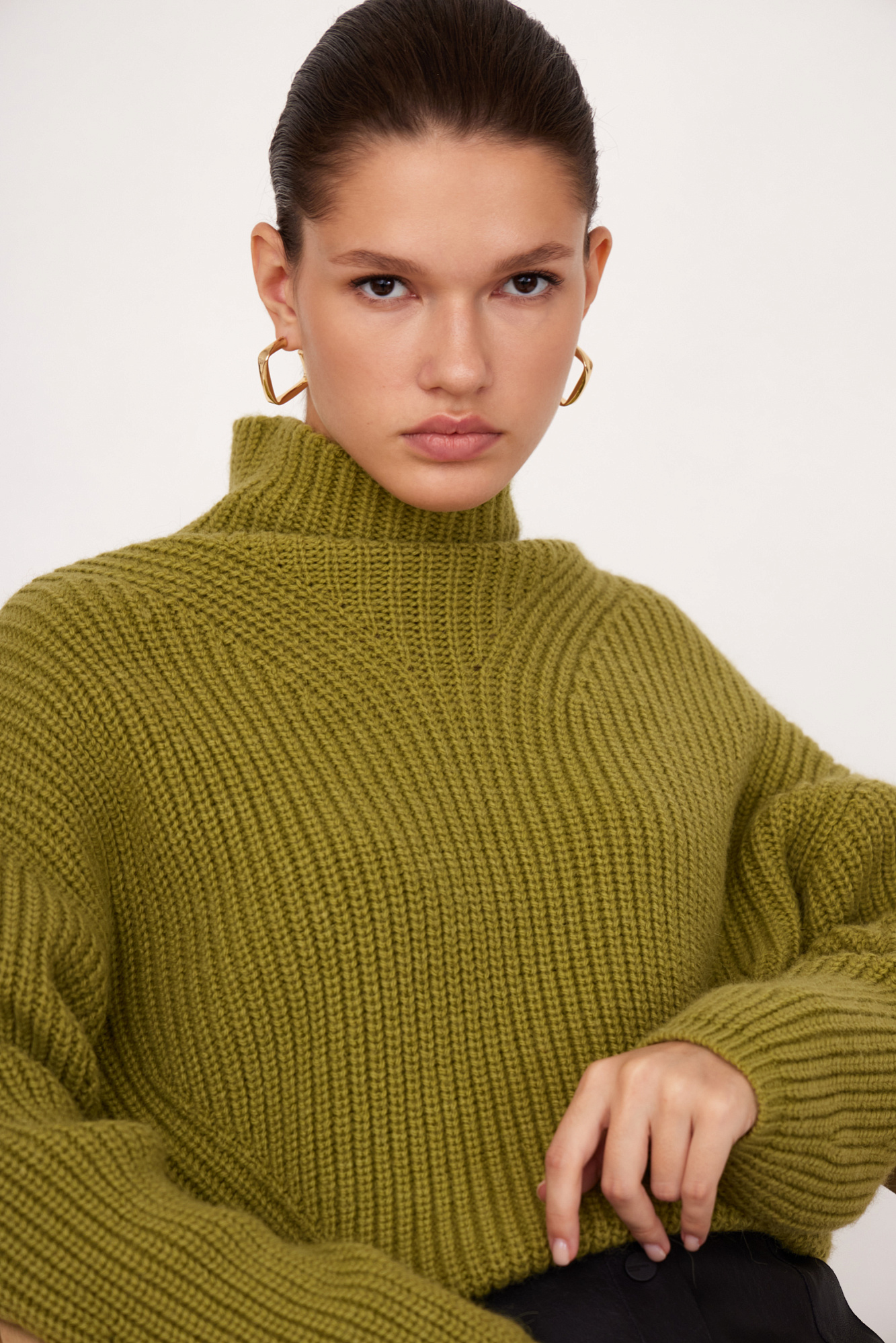 Трикотажный джемпер из шерсти Альпака с асимметричным нижним краем и декоративными дорожками. Модель свободного силуэта со спущенным плечом.
