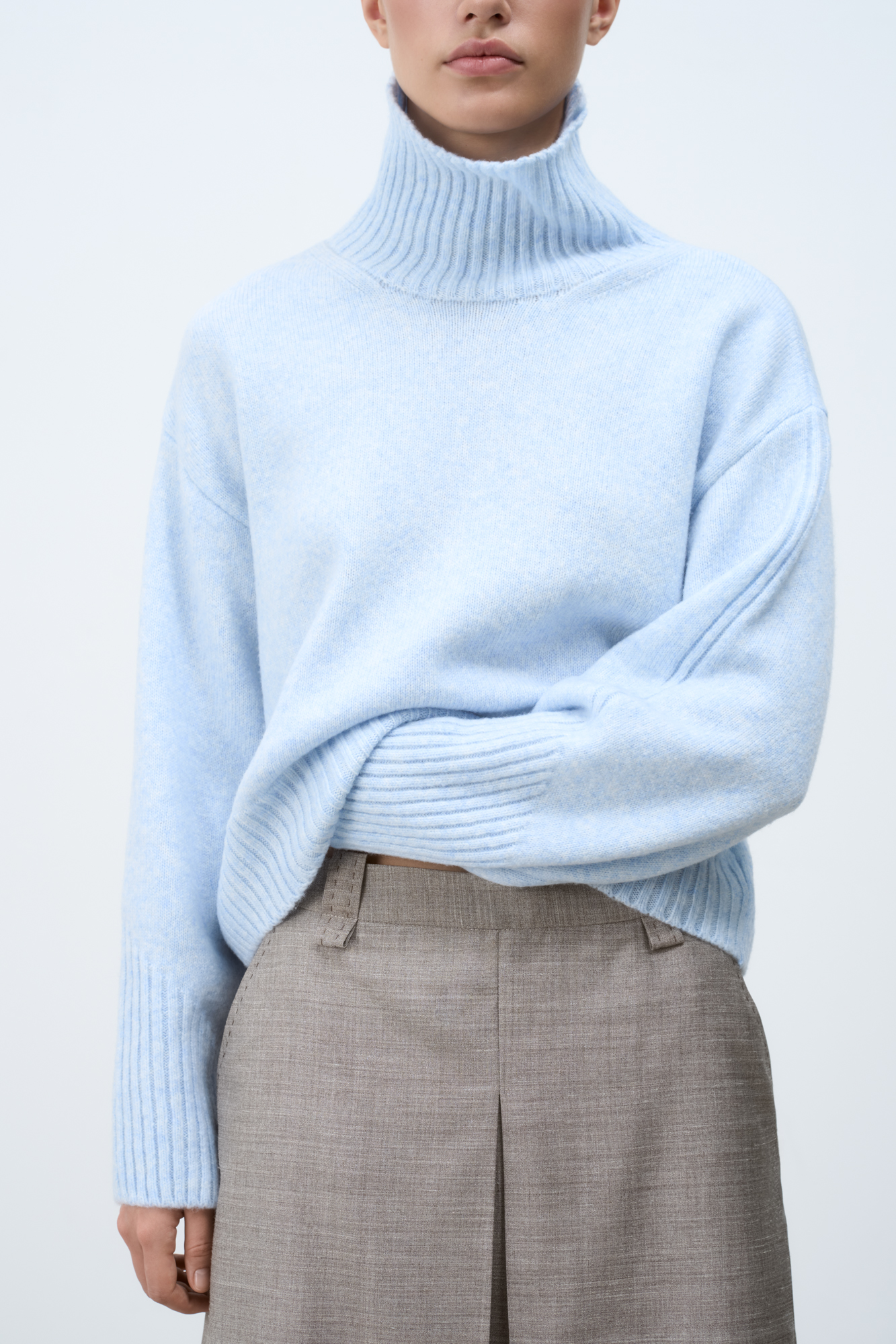 Джемпер из шерсти мериноса с высоким воротом и асимметричным низом. Рукава и низ иделия выполнены в рубчик.