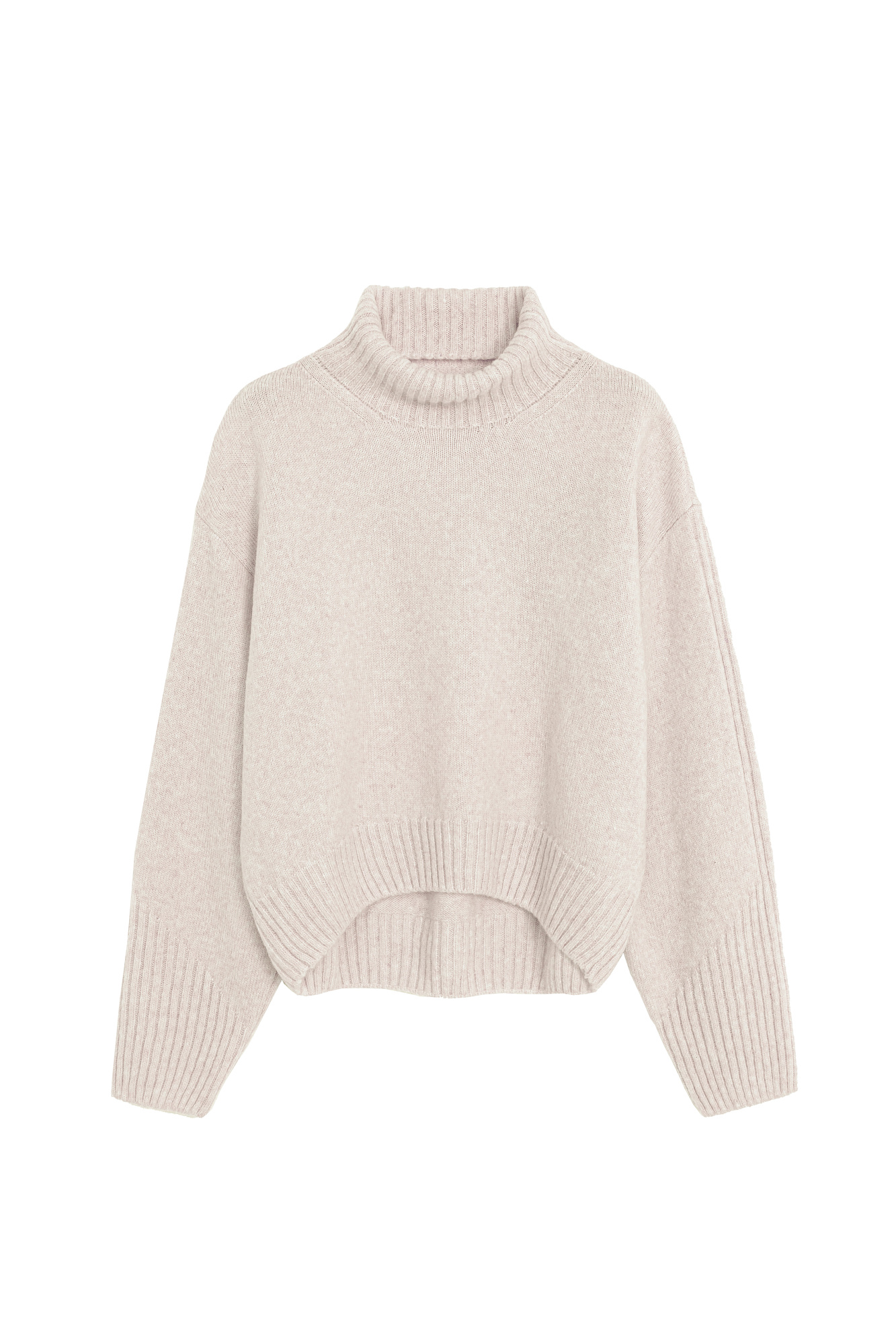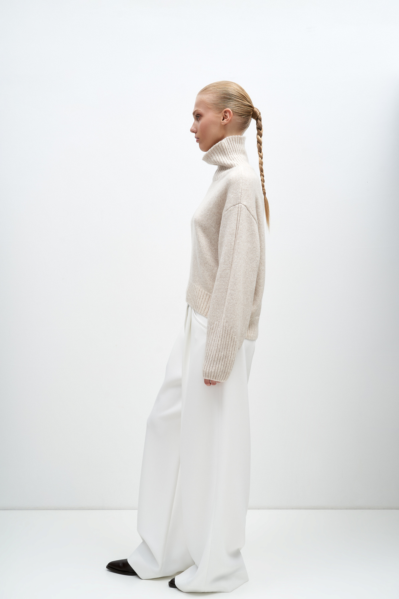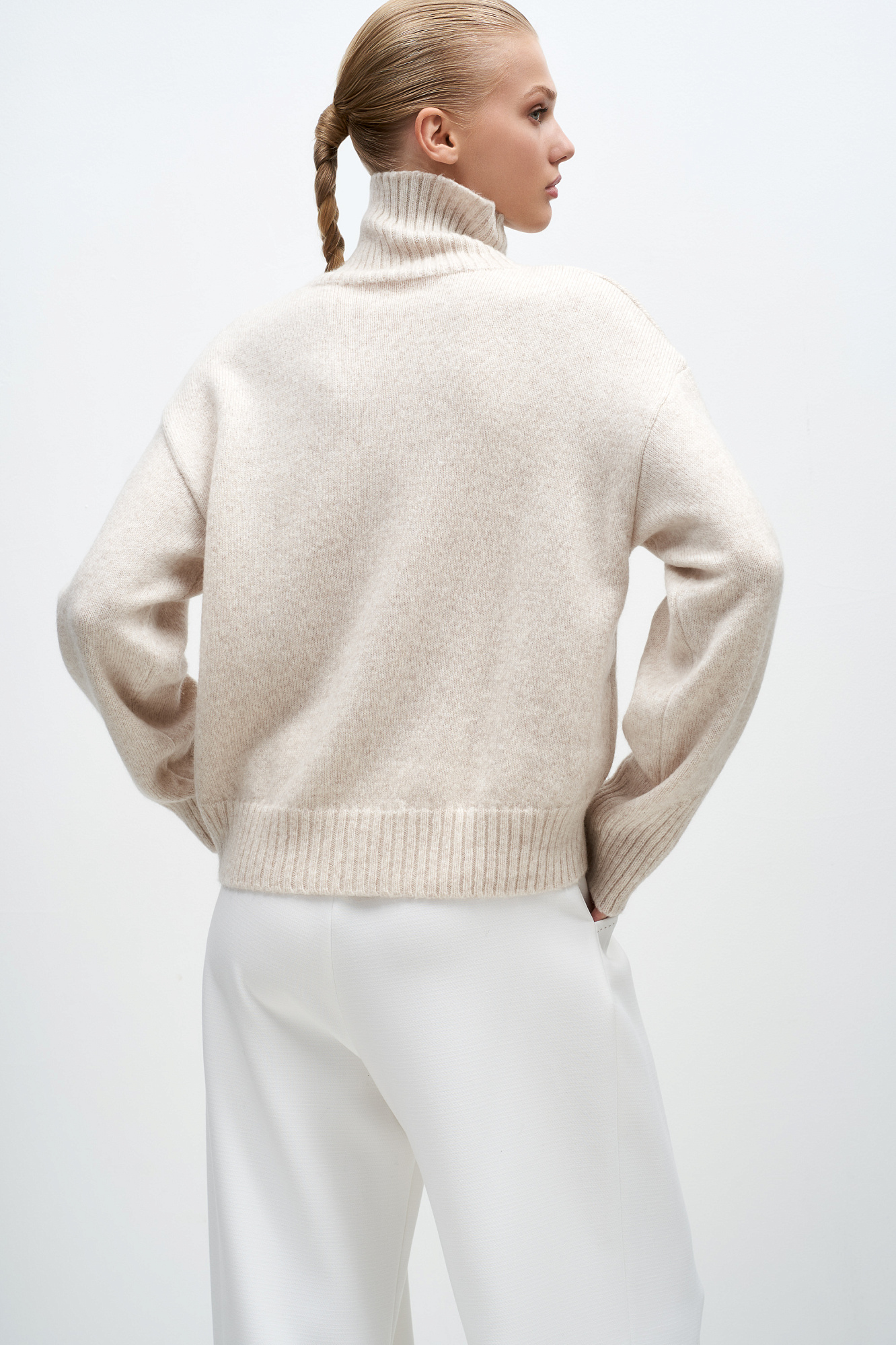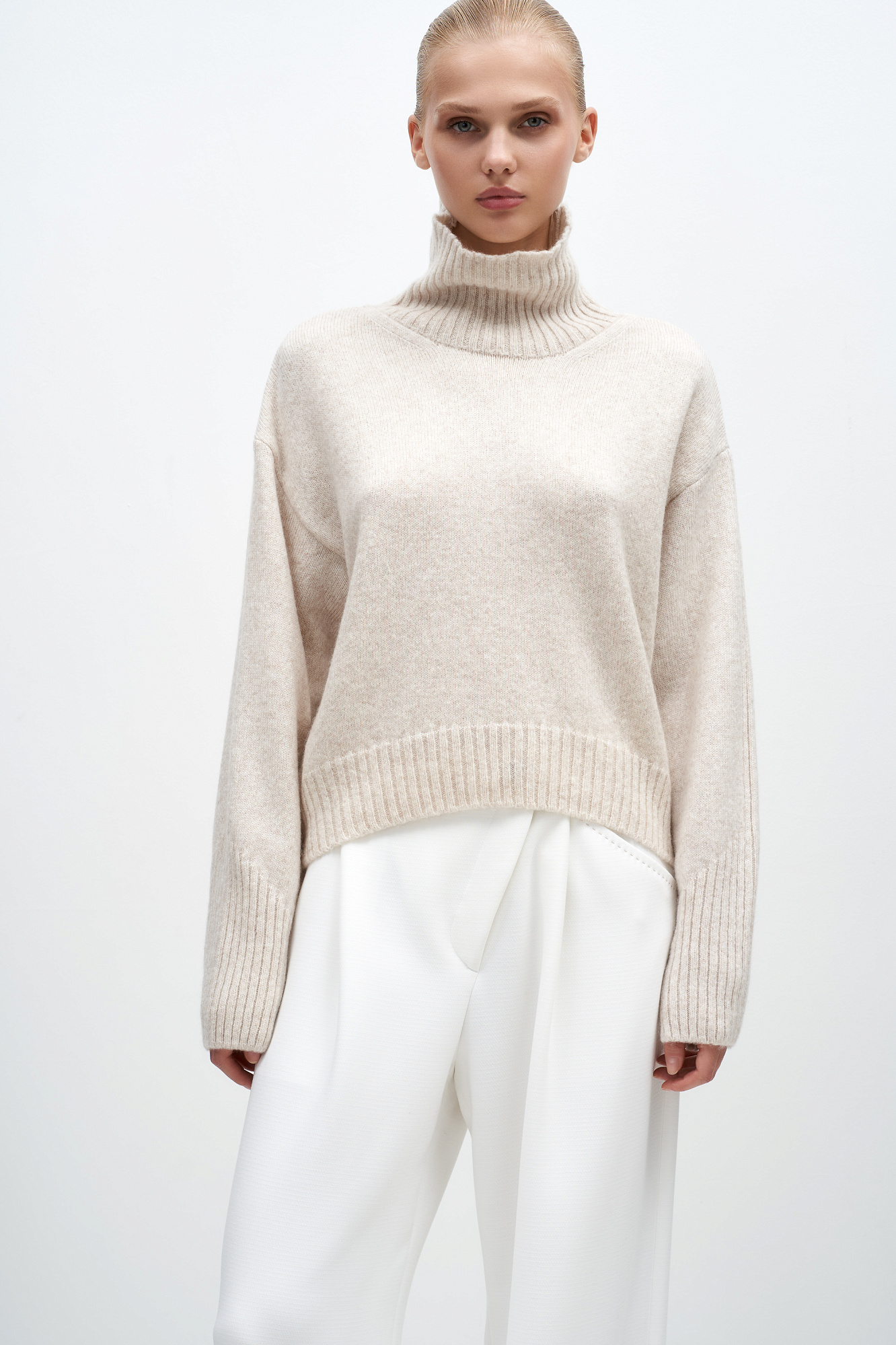 Джемпер из шерсти мериноса с высоким воротом и асимметричным низом. Рукава и низ иделия выполнены в рубчик.