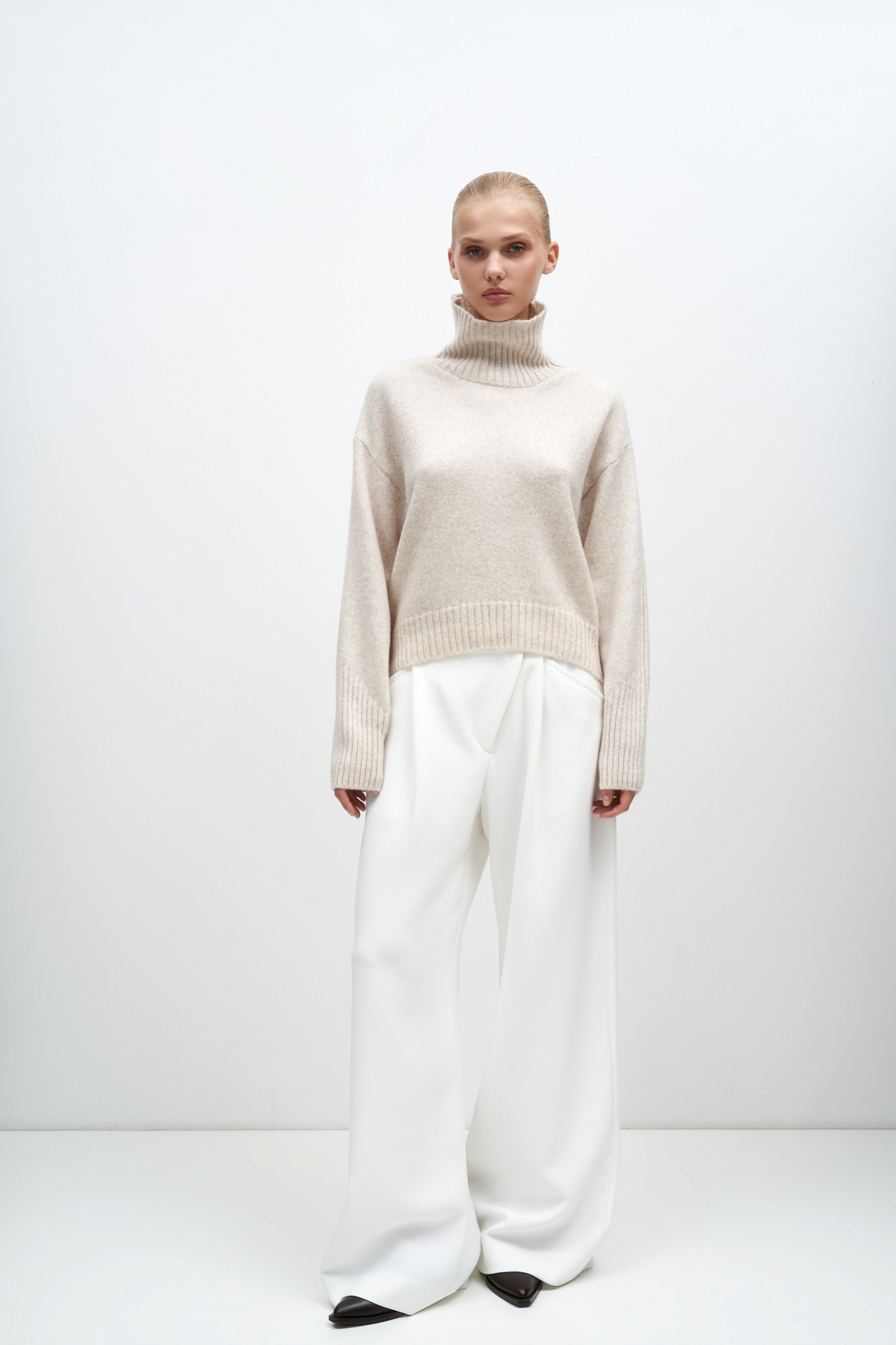 Джемпер из шерсти мериноса экстрафайн. Модель свободного силуэта с высоким воротом. Воротник, манжеты и низ изделия выполнены в широкий рубчик. Рубчик на манжетах образует асимметричный узор и с внешней стороны рукава продолжается до плеча.
