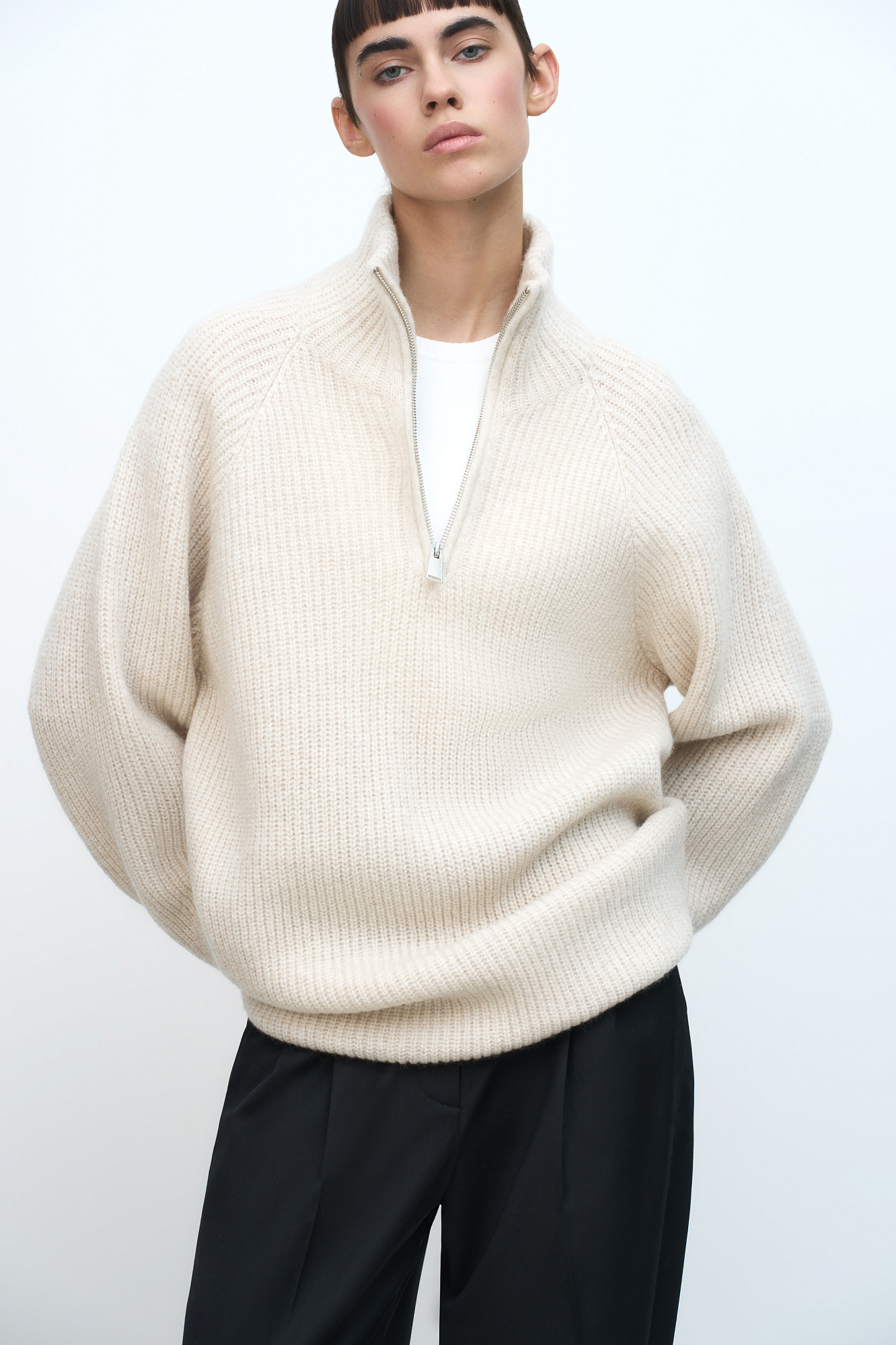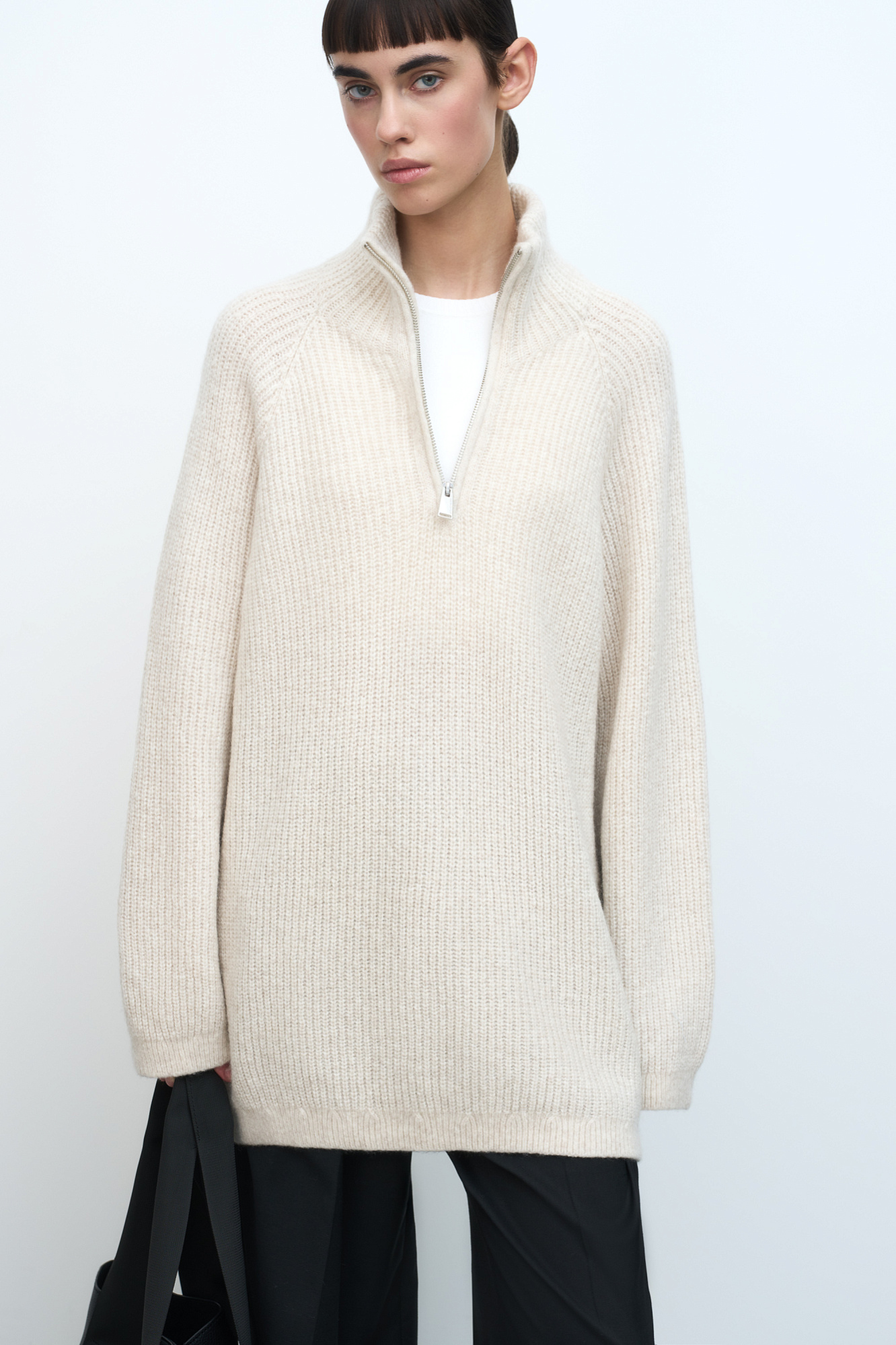 Удлиненный джемпер из мягкой шерсти мериноса экстрафайн. Модель свободного силуэта с высоким воротом и застежкой на молнию.