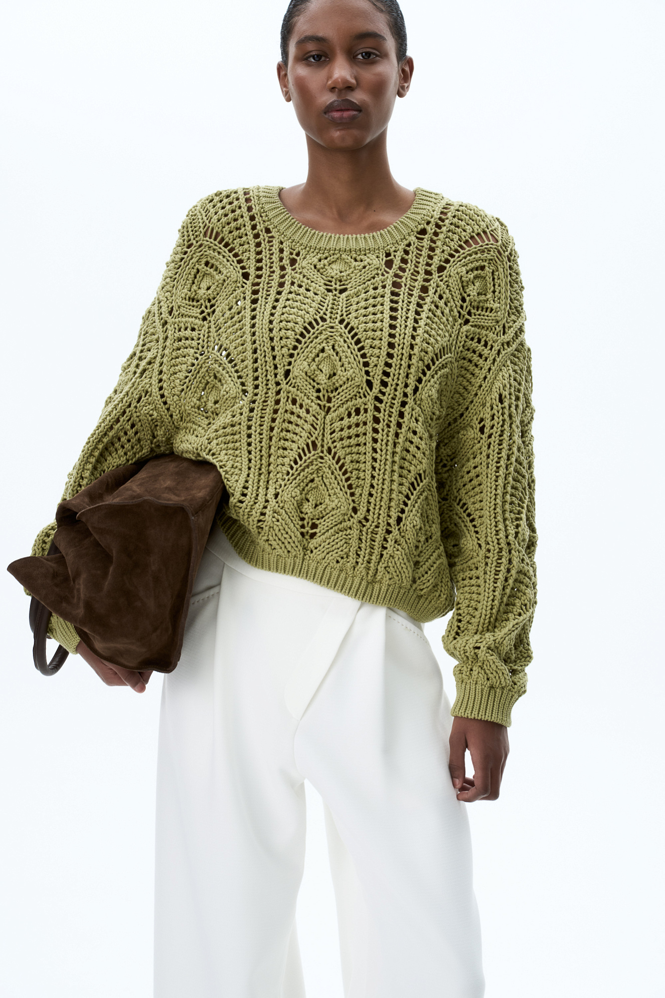 Трикотажный джемпер из хлопка, выполненный ажурной вязкой с орнаментом. Модель свободного силуэта с длинными рукавами и круглым вырезом горловины. Манжеты и низ изделия выполнены в рубчик.