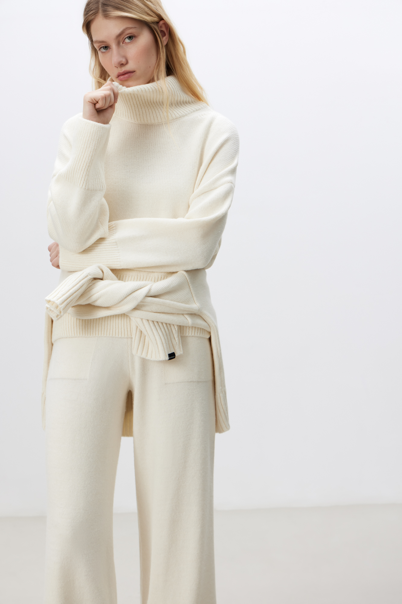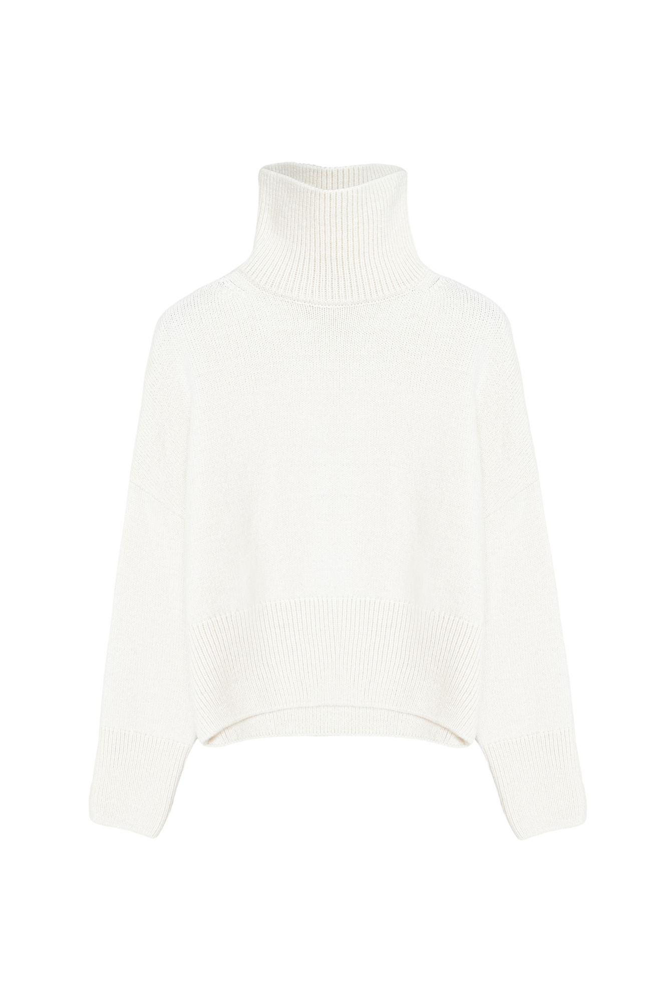 Трикотажный джемпер с шерстью альпака. Модель свободного силуэта с высоким воротником, спущенной линией плеча и длинными рукавами. Манжеты и низ изделия в рубчик.