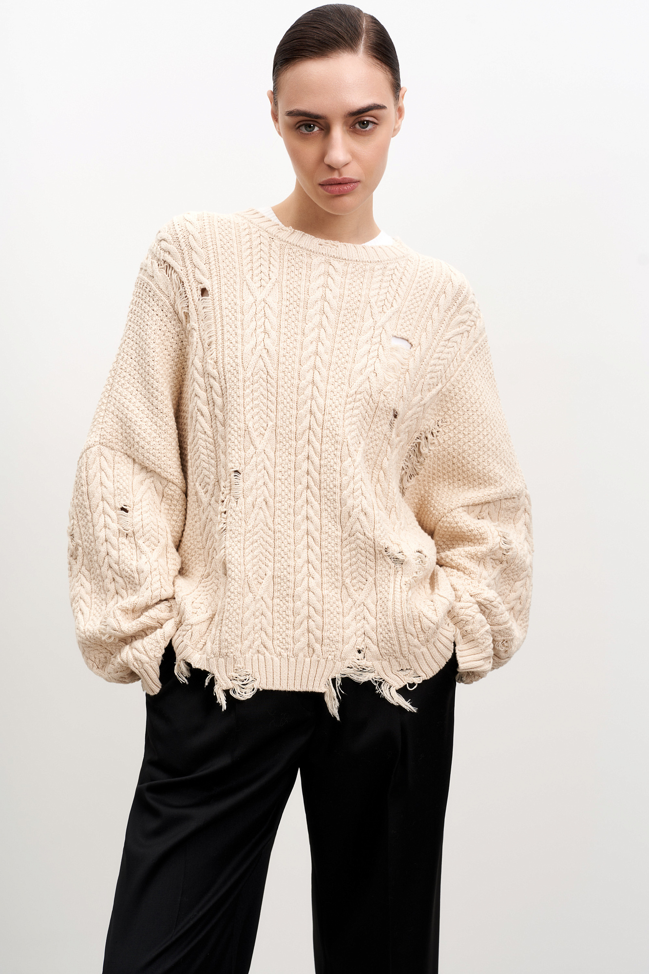 Трикотажный джемпер из вискозы с добавлением хлопка. Длинные рукава, круглый вырез, разрезы по всему изделию в стиле гранж.