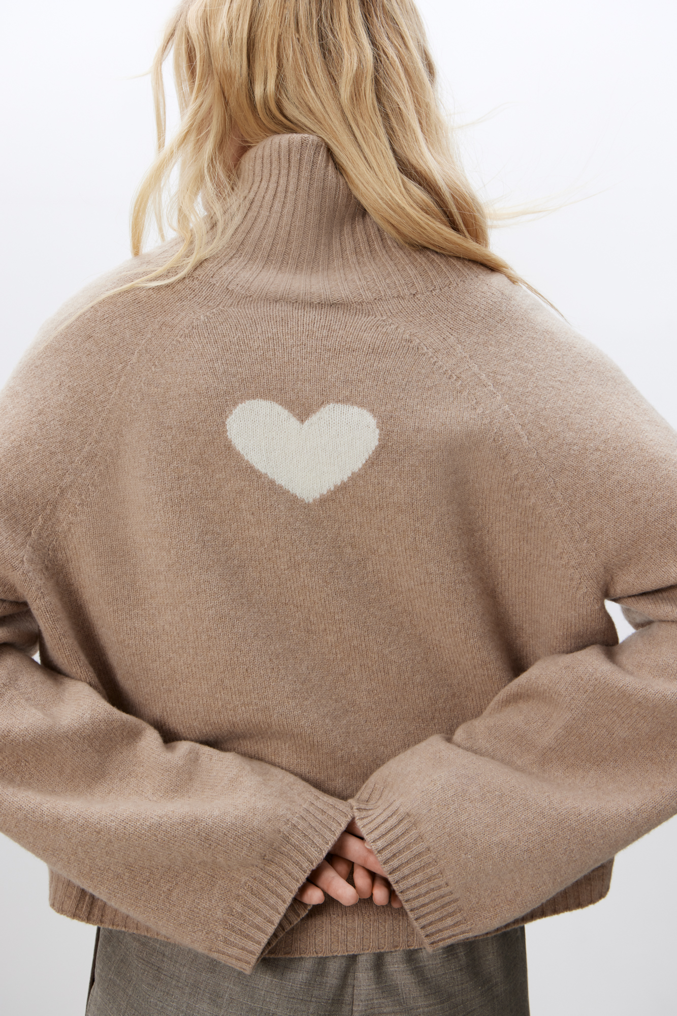 Трикотажный джемпер из шерсти с добавлением кашемира. Модель с высоким воротником в рубчик, спущенной линией плеча и жаккардовым рисунком в виде сердца на спине.