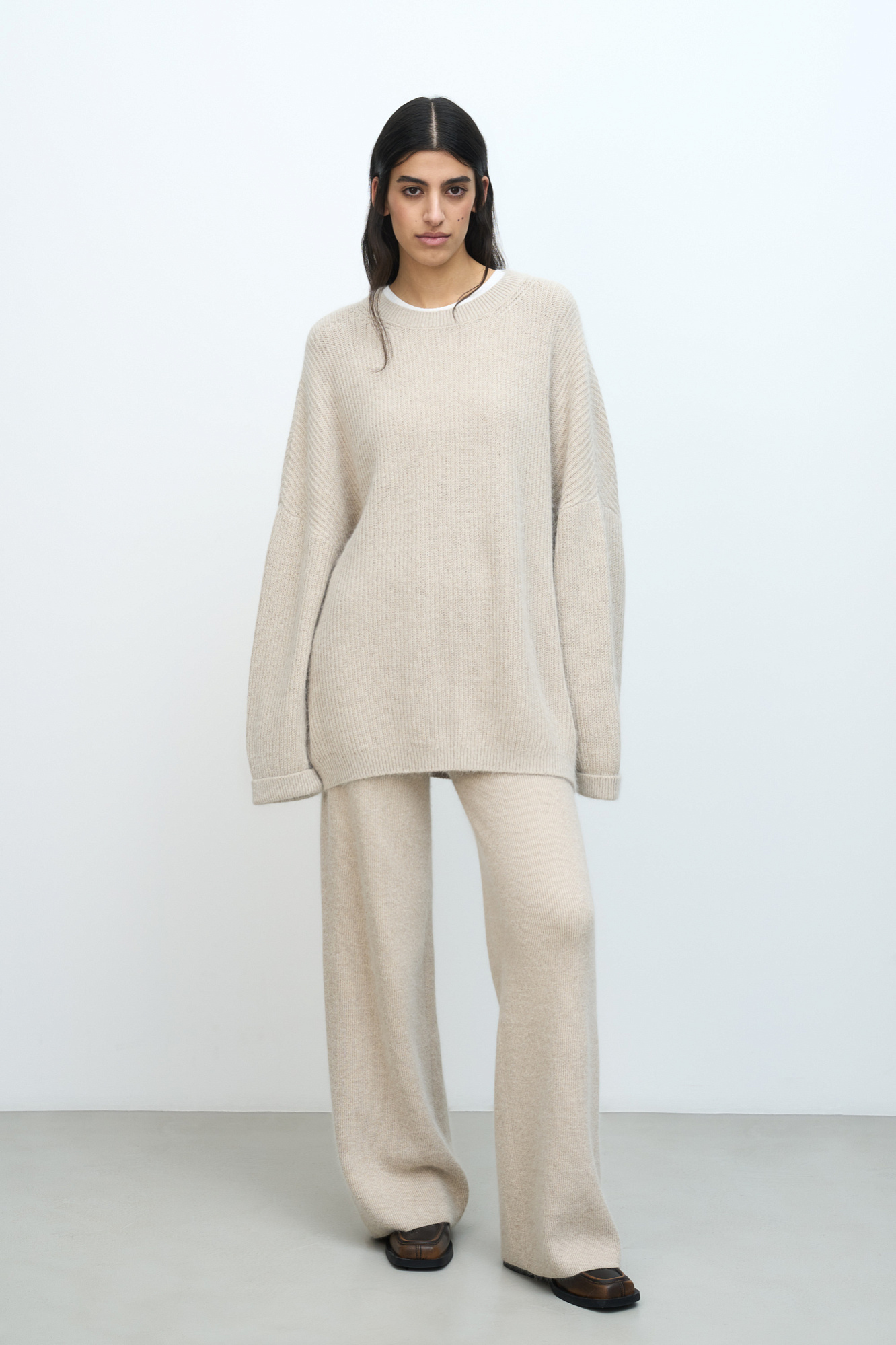 Трикотажный джемпер из смесовой шерсти. Модель свободного силуэта со спущенной линией плеча. Ворот, манжеты рукавов и низ изделия выполнены в рубчик.