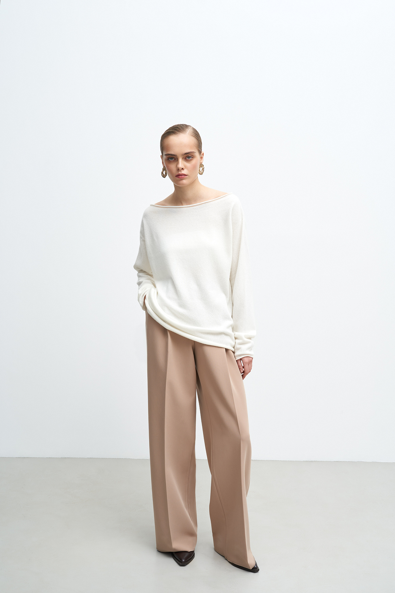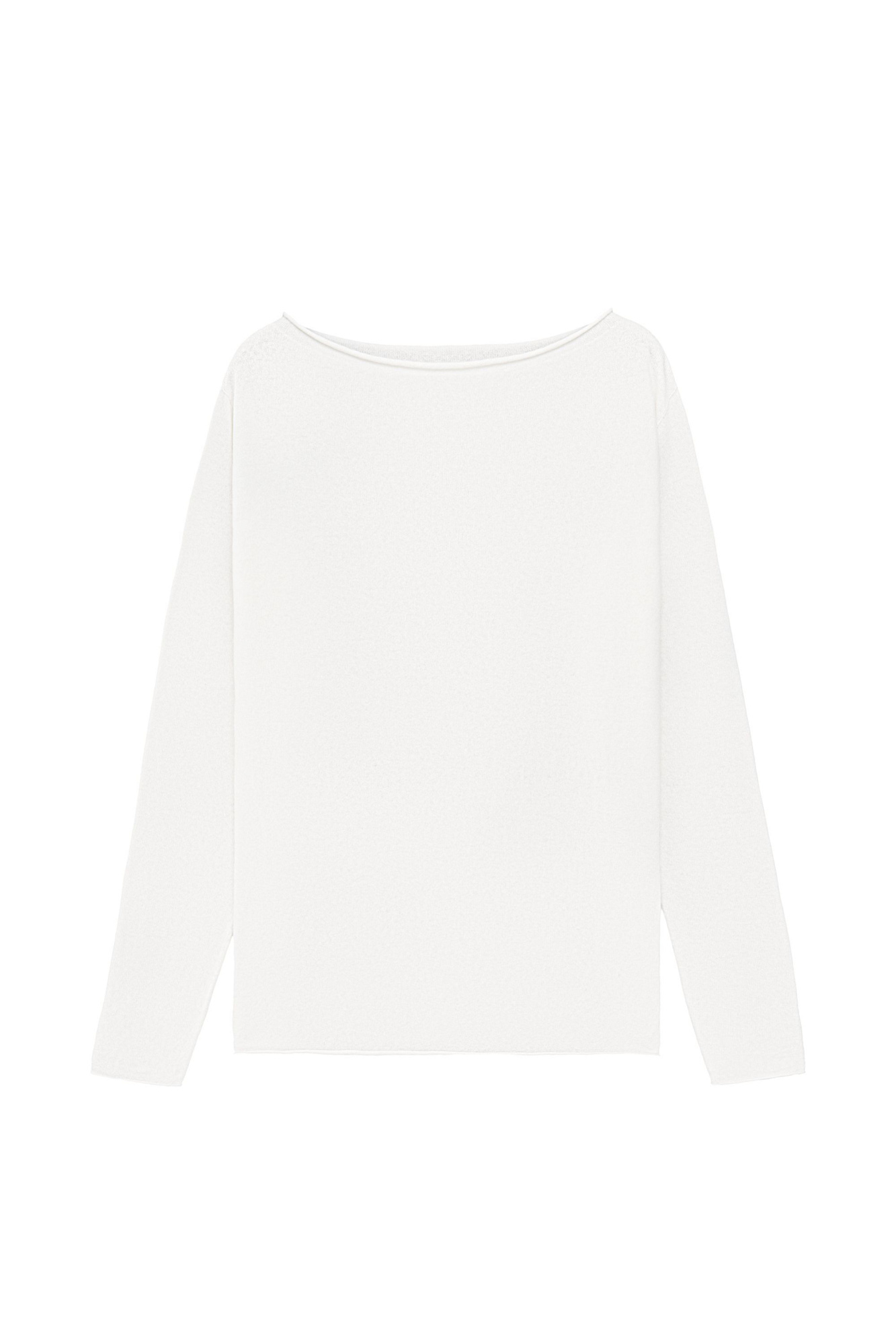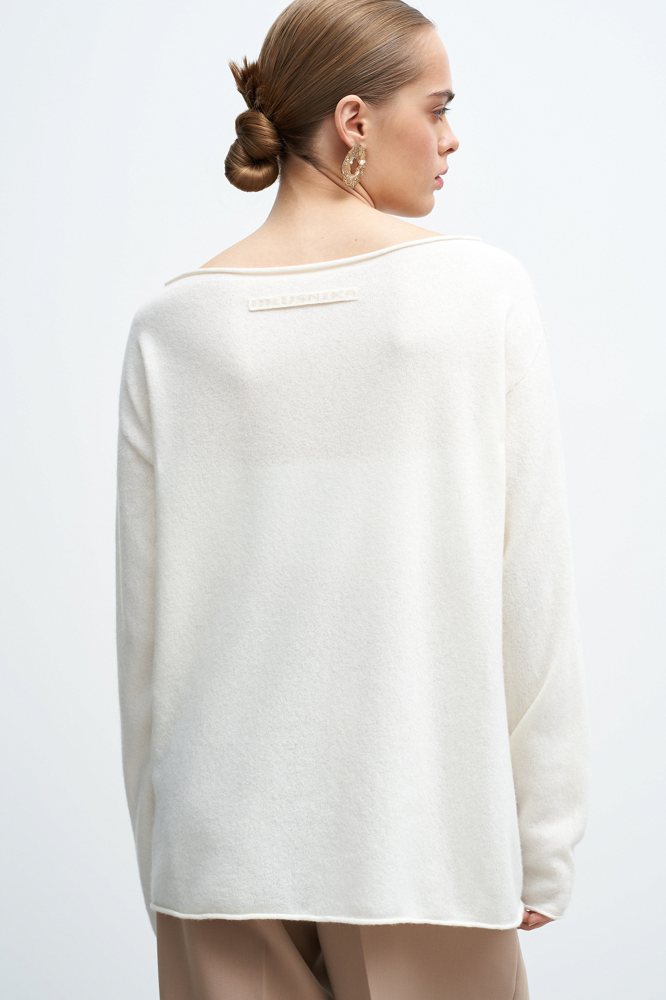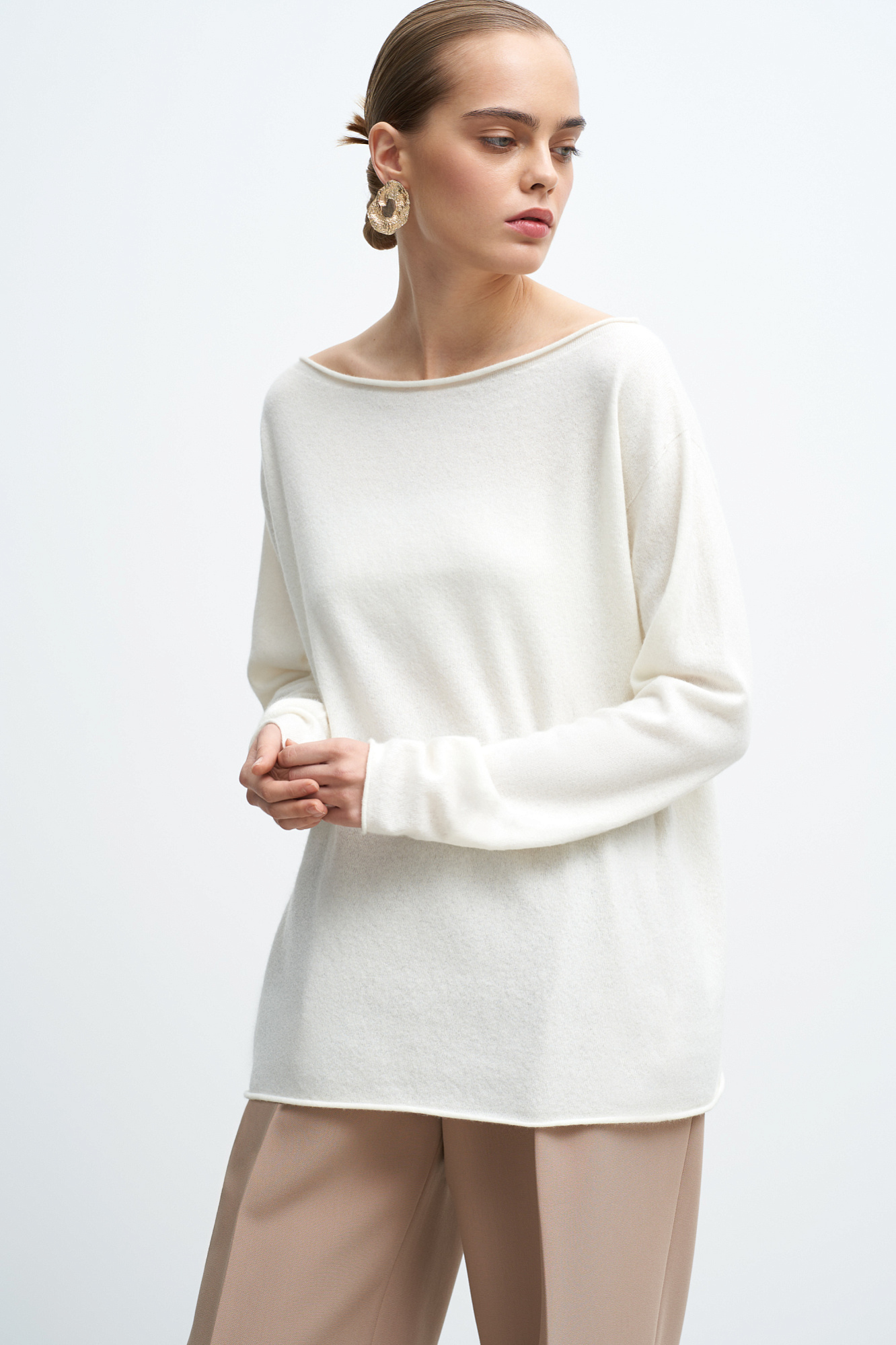 Трикотажный джемпер с закрученными краями из шерсти с добавлением кашемира. Модель свободного силуэта со спущенной линией плеча.