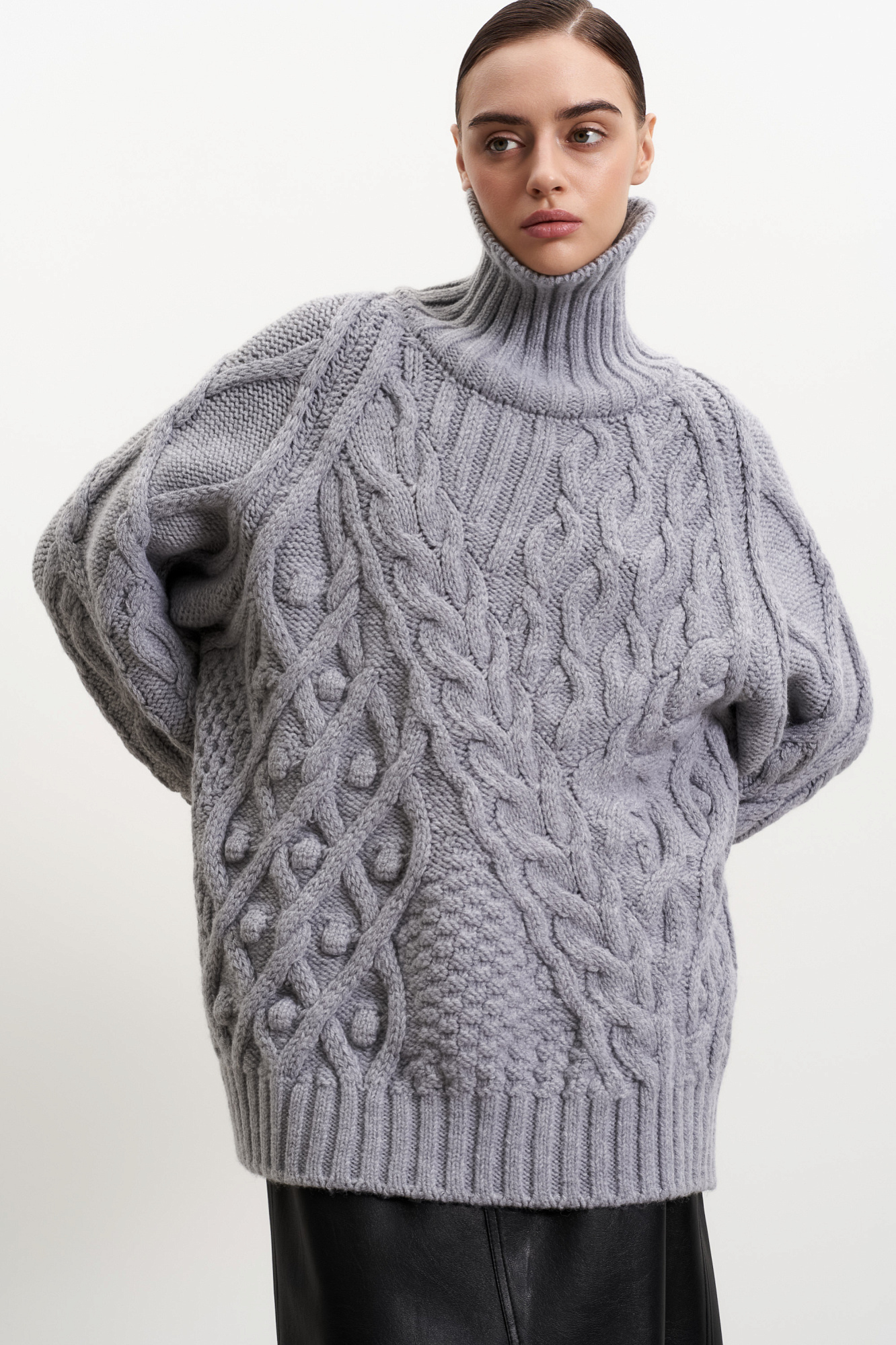 Трикотажный джемпер из шерсти альпака с добавлением кидмохера. Модель свободного силуэта с воротником-стойкой и спущенным плечом.