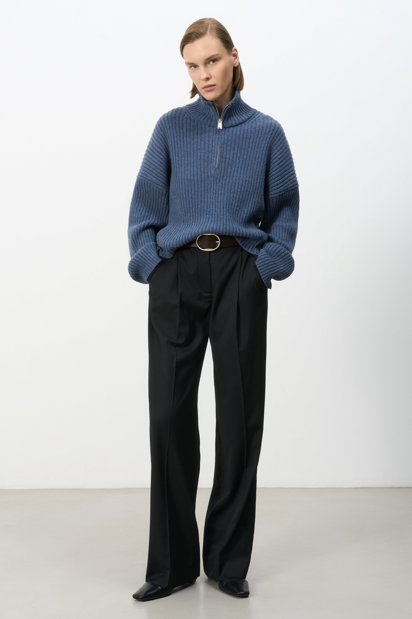 Джемпер из смесовой шерсти с добавлением кашемира. Модель свободного силуэта, со спущенной линией плеч, отворотами на манжетах и высоким воротником-стойкой с застежкой на молнию.