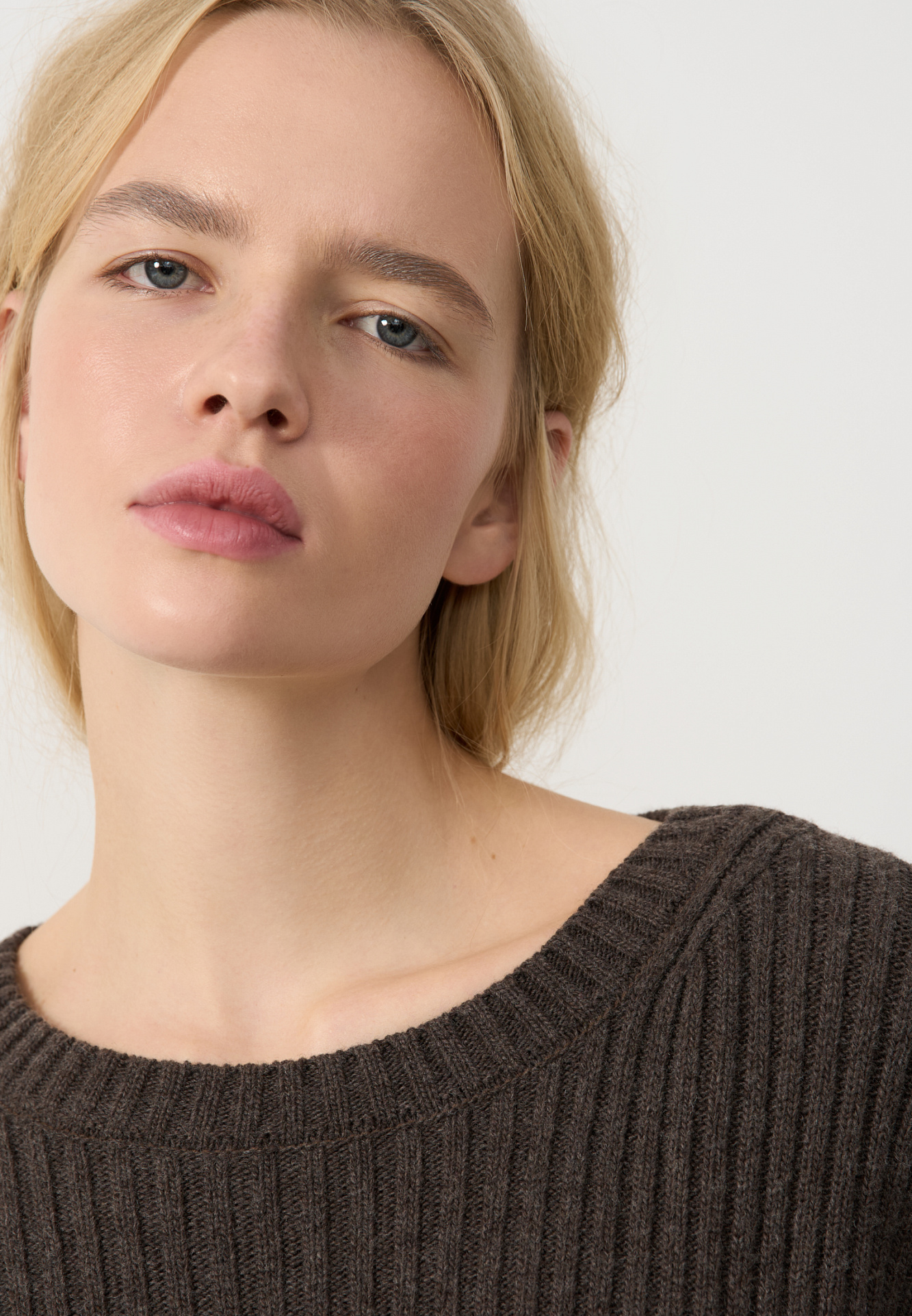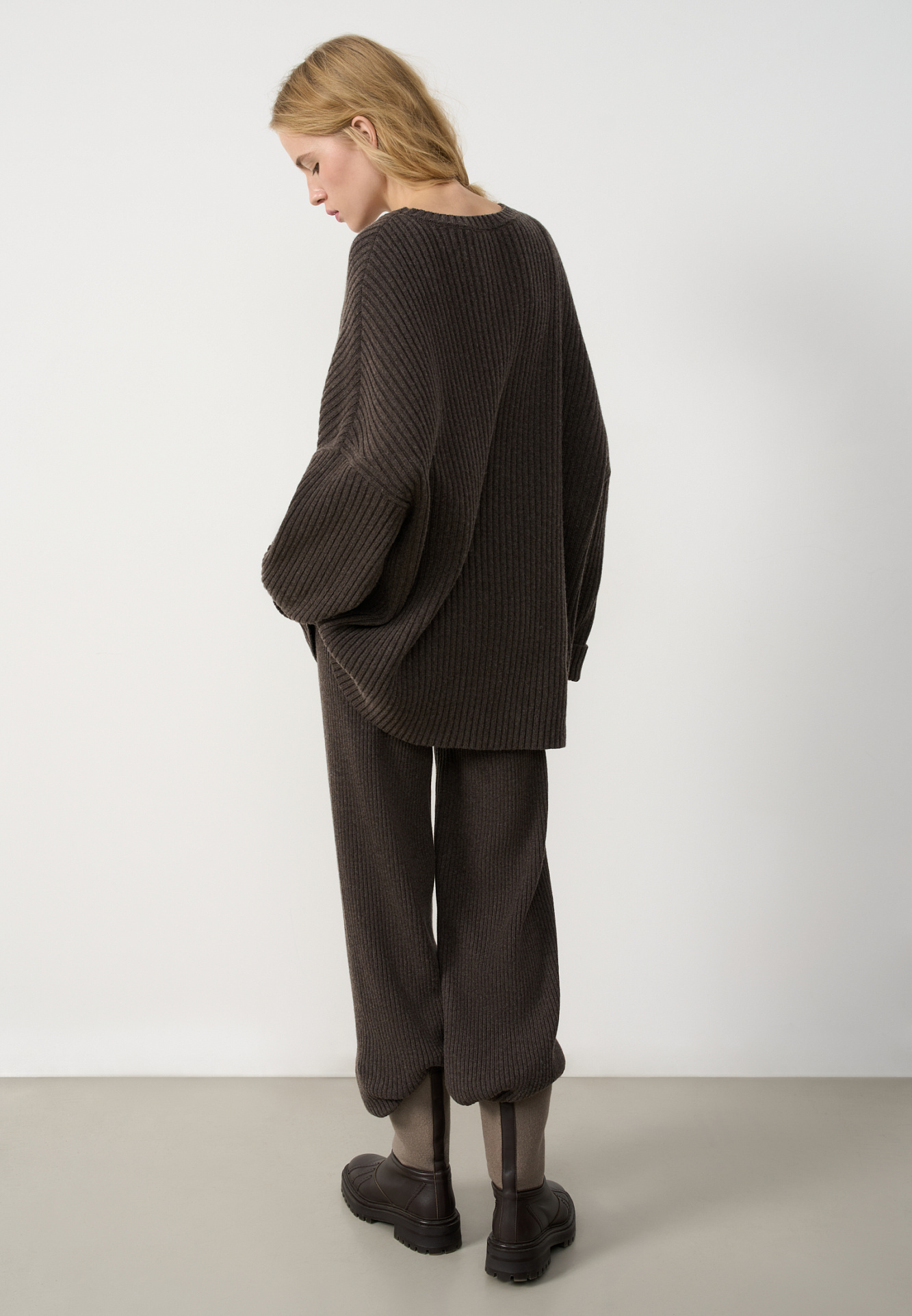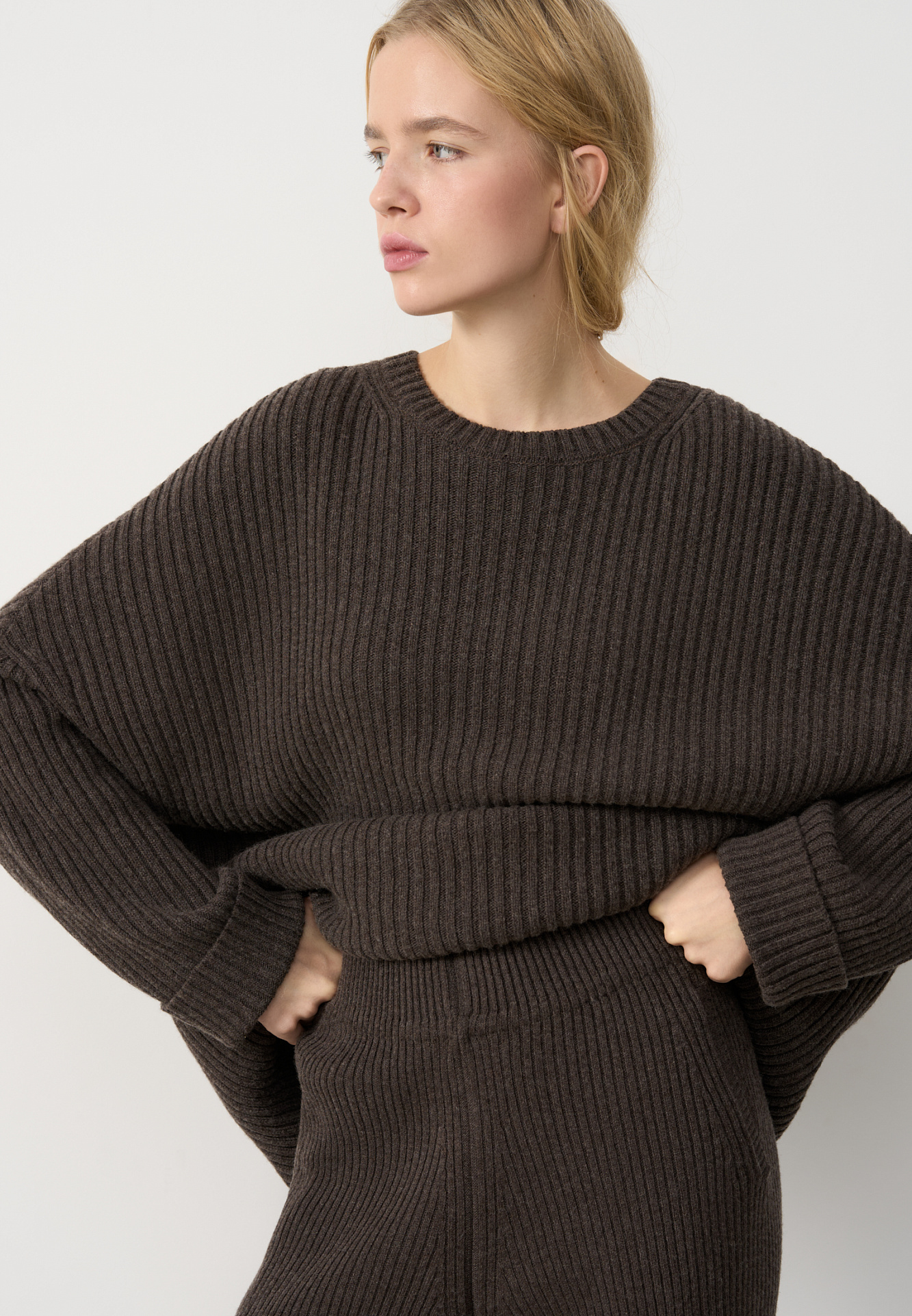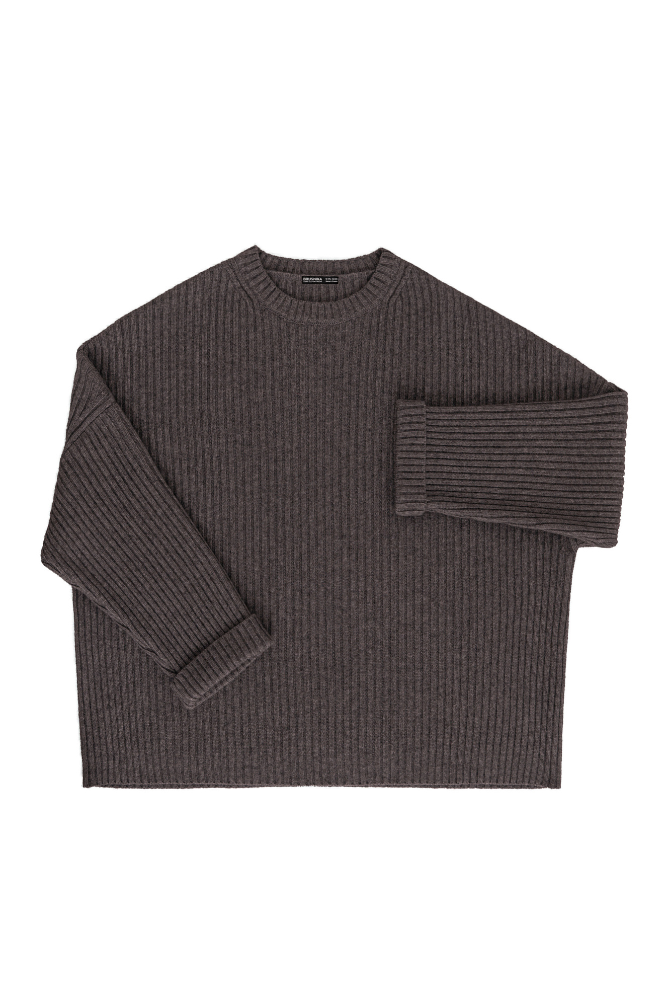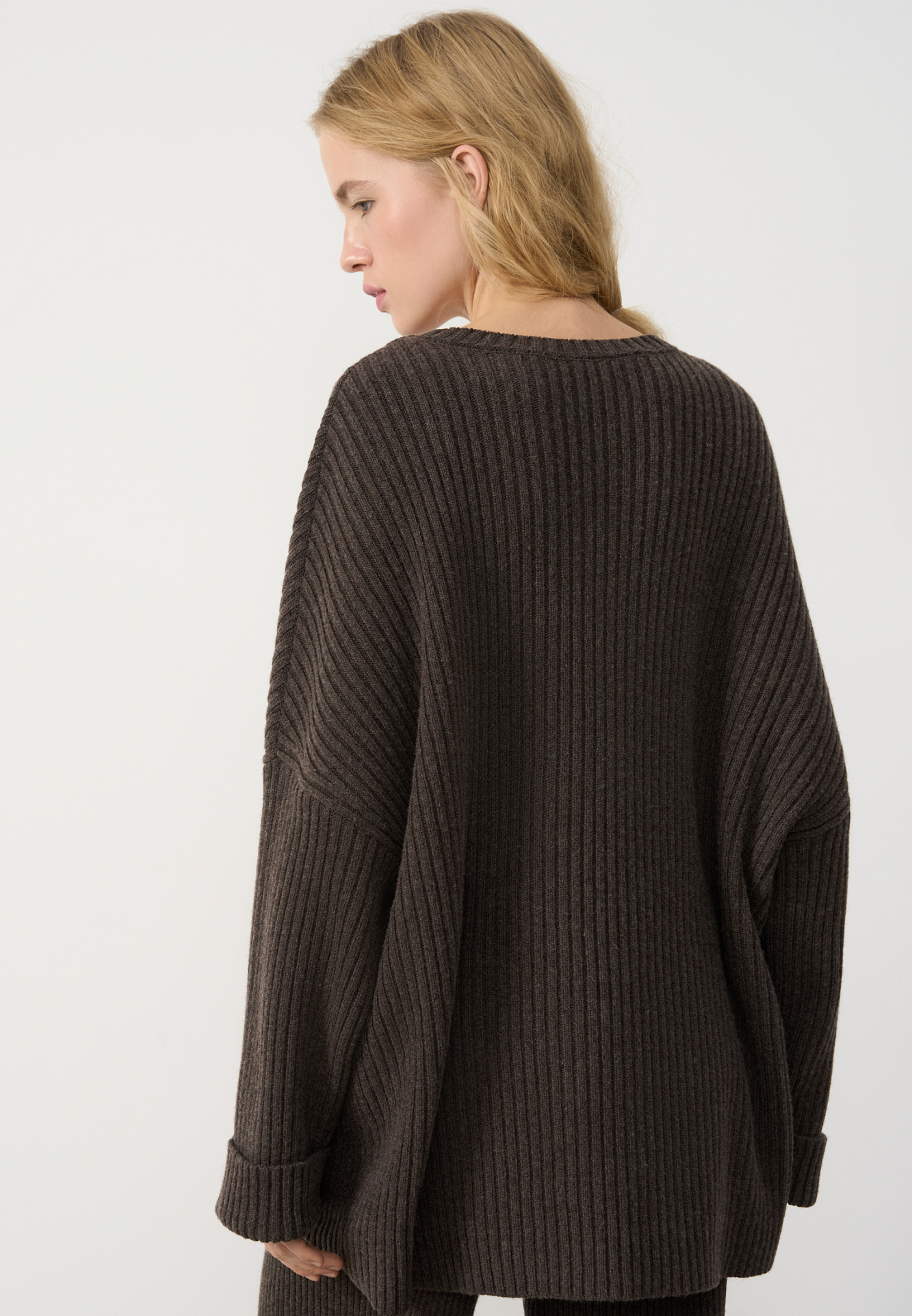 Трикотажный джемпер из шерсти с добавлением кашемира. Модель свободного силуэта со спущенной линией плеча, отворотами на манжетах и круглым вырезом горловины. Изделие выполнено в широкий рубчик.