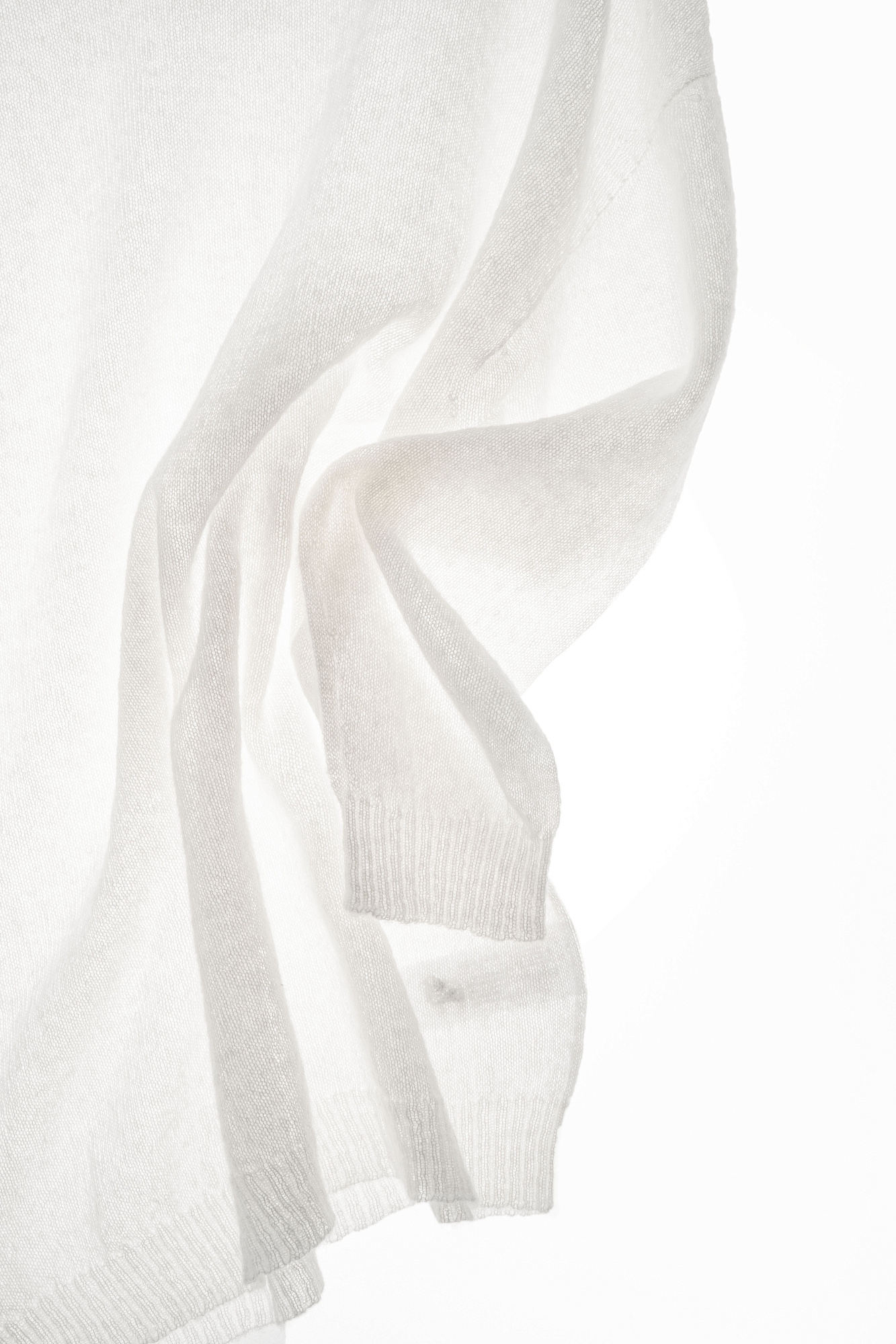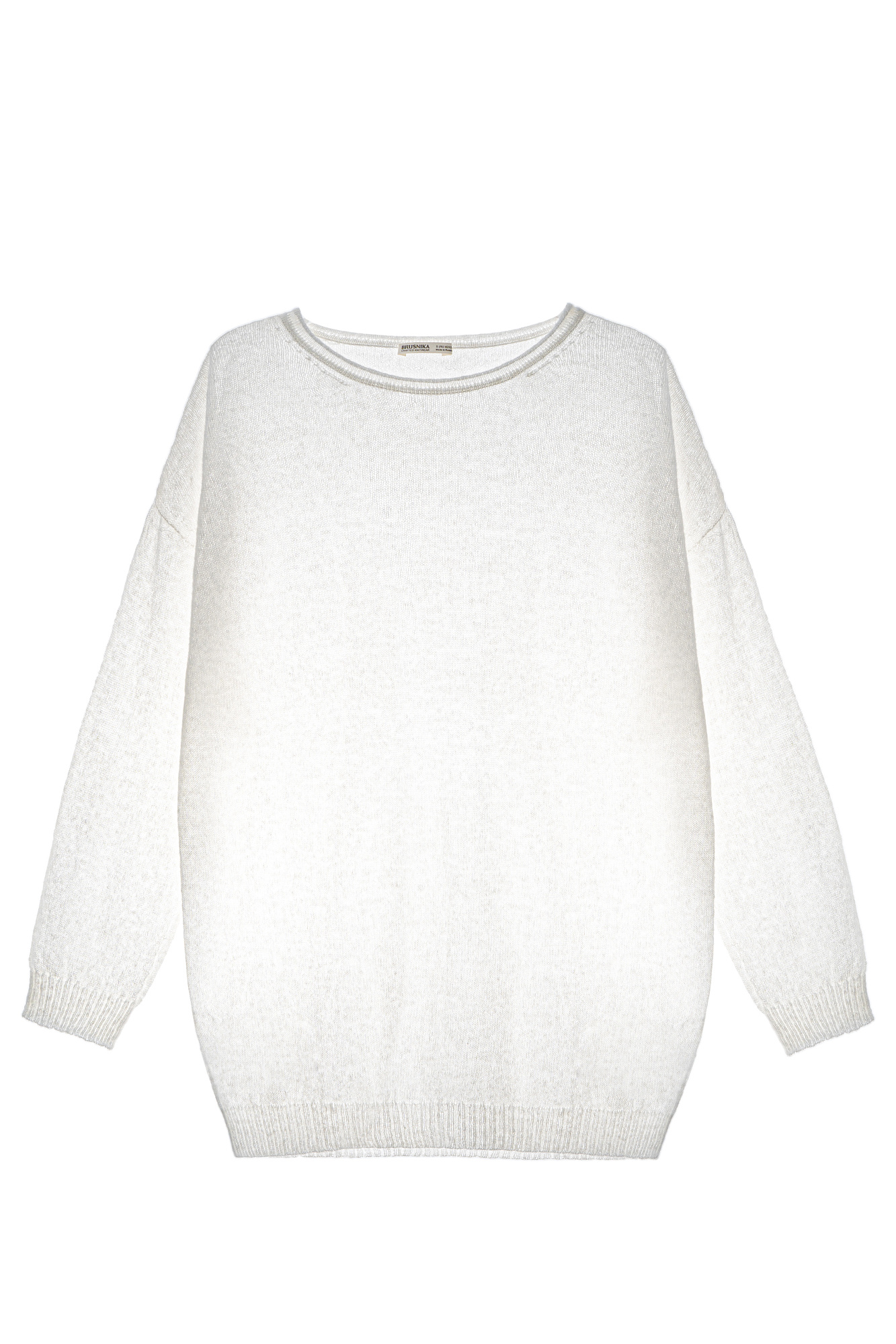 Длинный полупрозрачный трикотажный джемпер из мериносовой шерсти экстрафайн с добавлением шерсти альпака. Модель свободного силуэта, со спущенной линией плеч, длинными рукавами и неглубоким круглым вырезом горловины. Манжеты рукавов и низ изделия выполнены в рубчик.