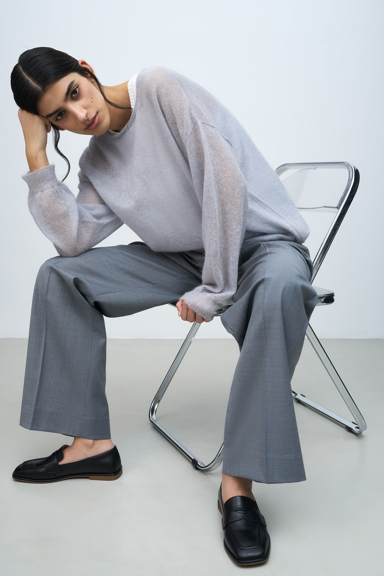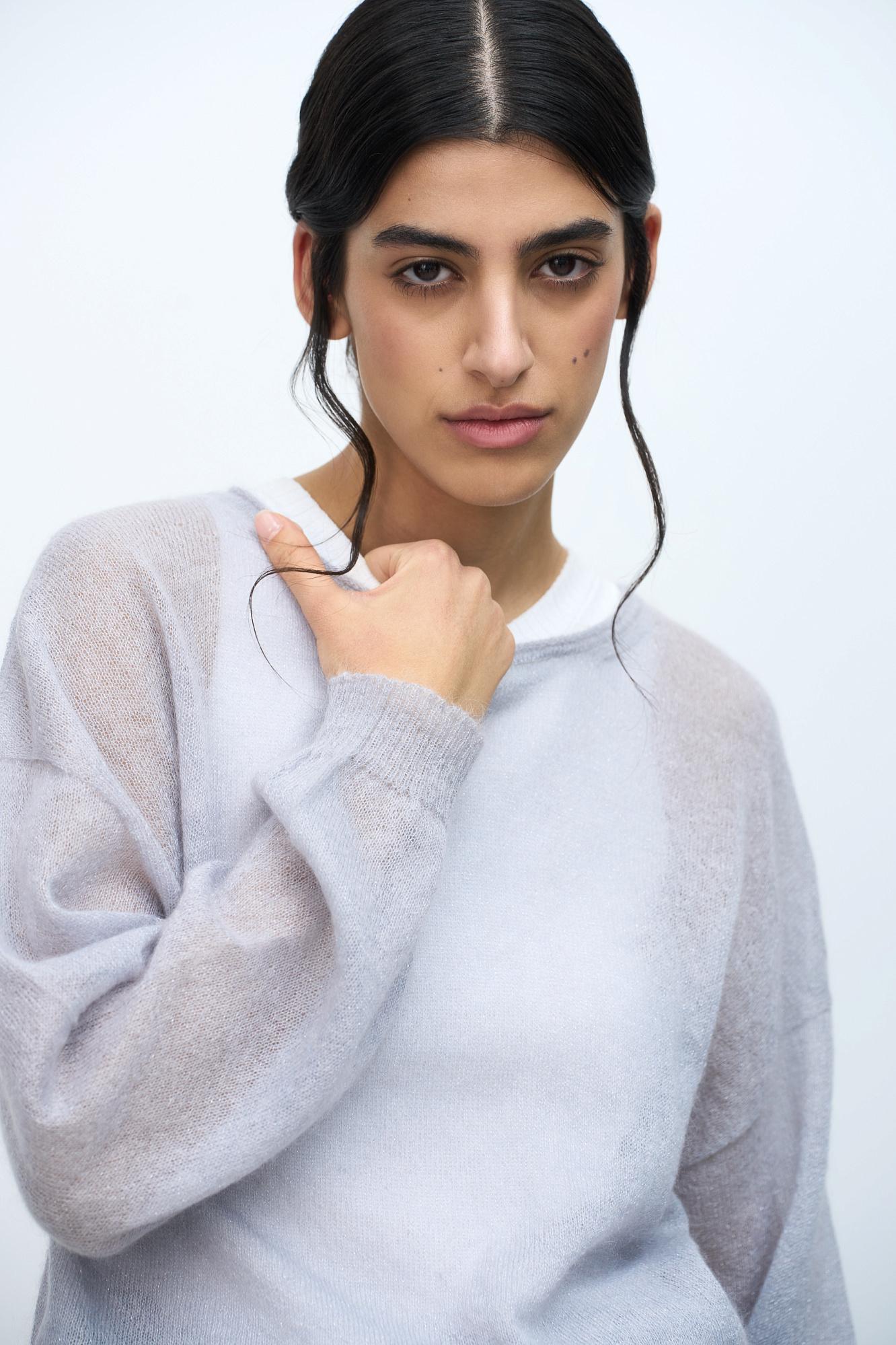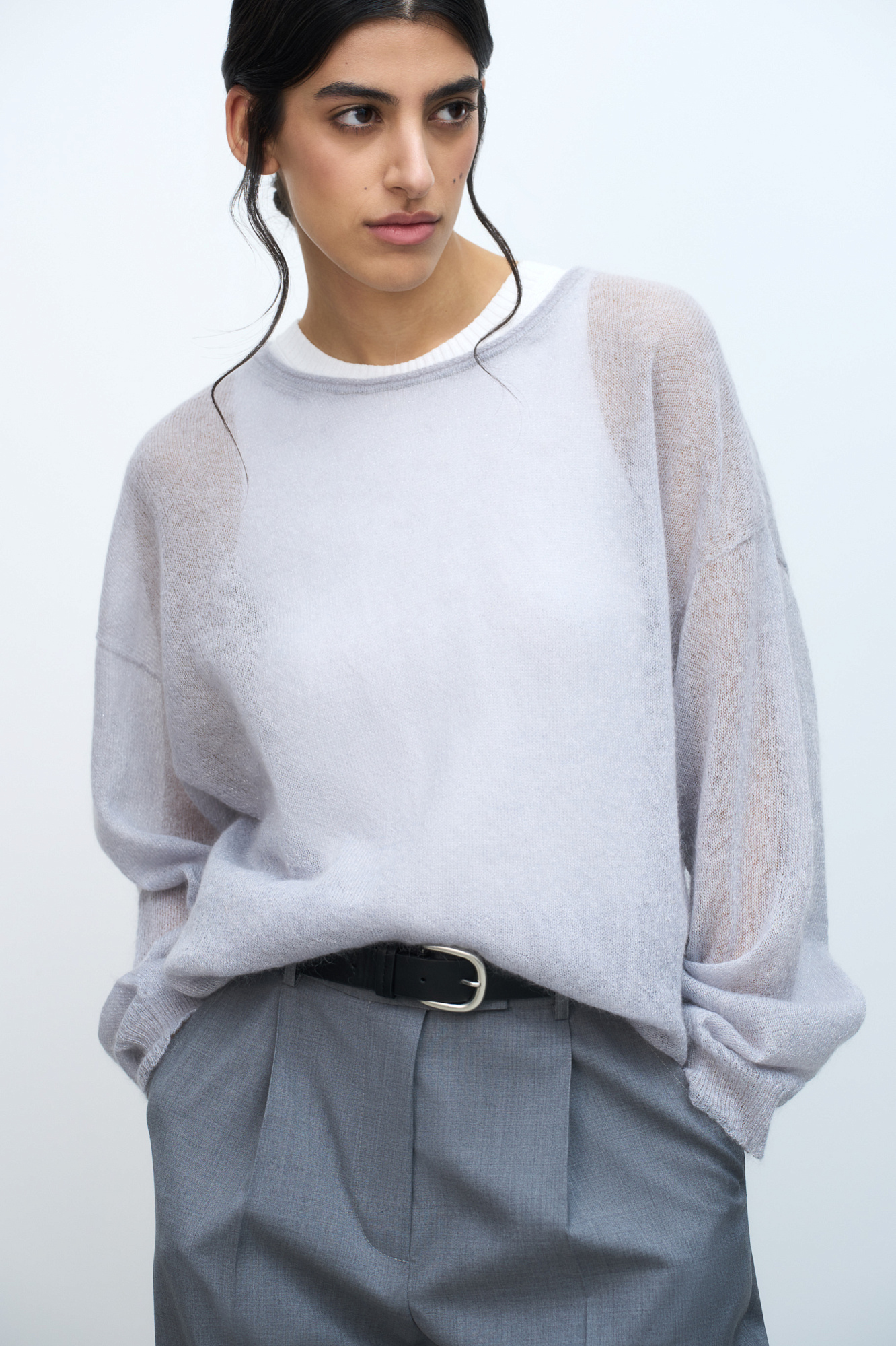 Трикотажный джемпер свободного силуэта со спущенной линией плеча. Для его создания использована тончайшая пряжа - смесь суперкид-мохера. Края изделия в рубчик.