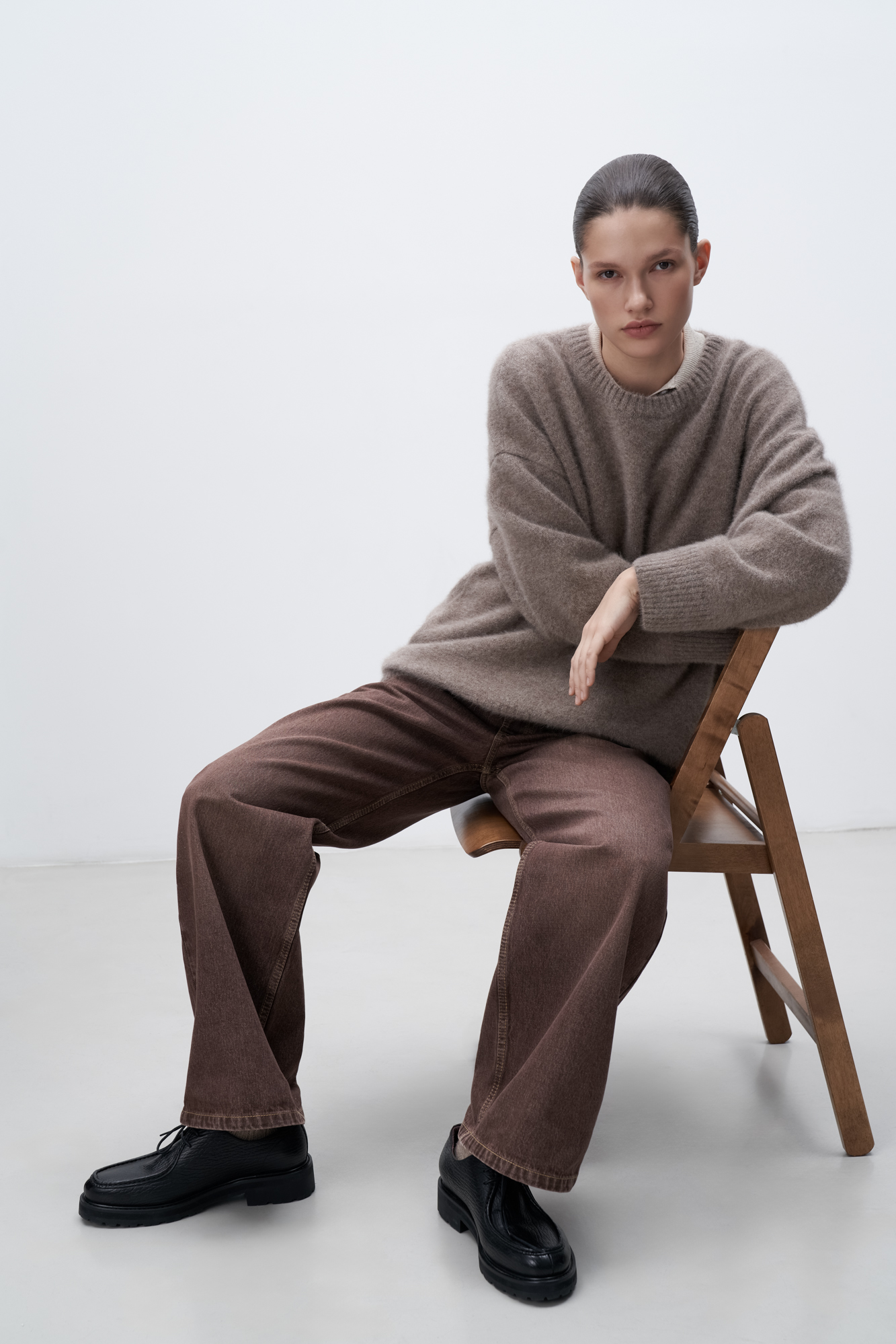 Трикотажный джемпер из пуха лисы и шелка. Модель свободного силуэта со спущенной линией плеч и круглым вырезом горловины. Края изделия выполнены в рубчик.