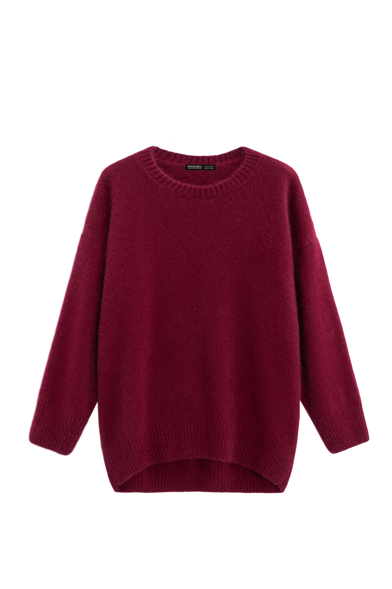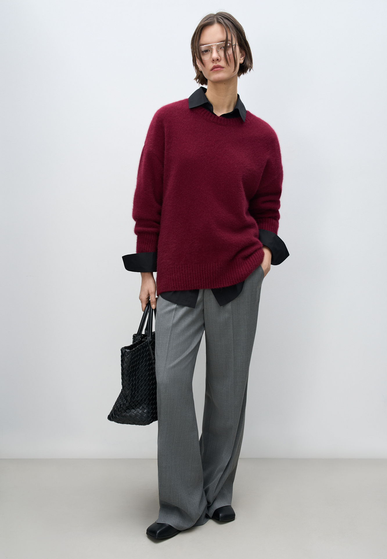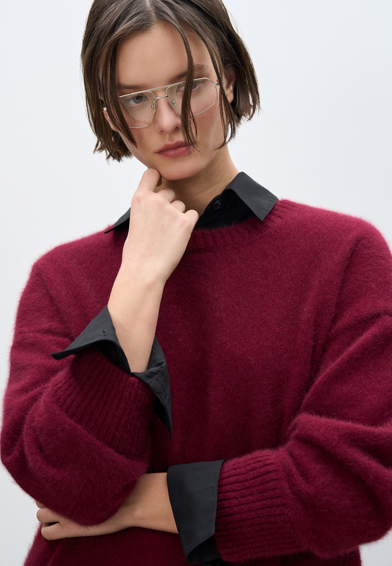 Трикотажный джемпер из пуха лисы и шелка. Модель свободного силуэта со спущенной линией плеч и круглым вырезом горловины. Края изделия выполнены в рубчик.