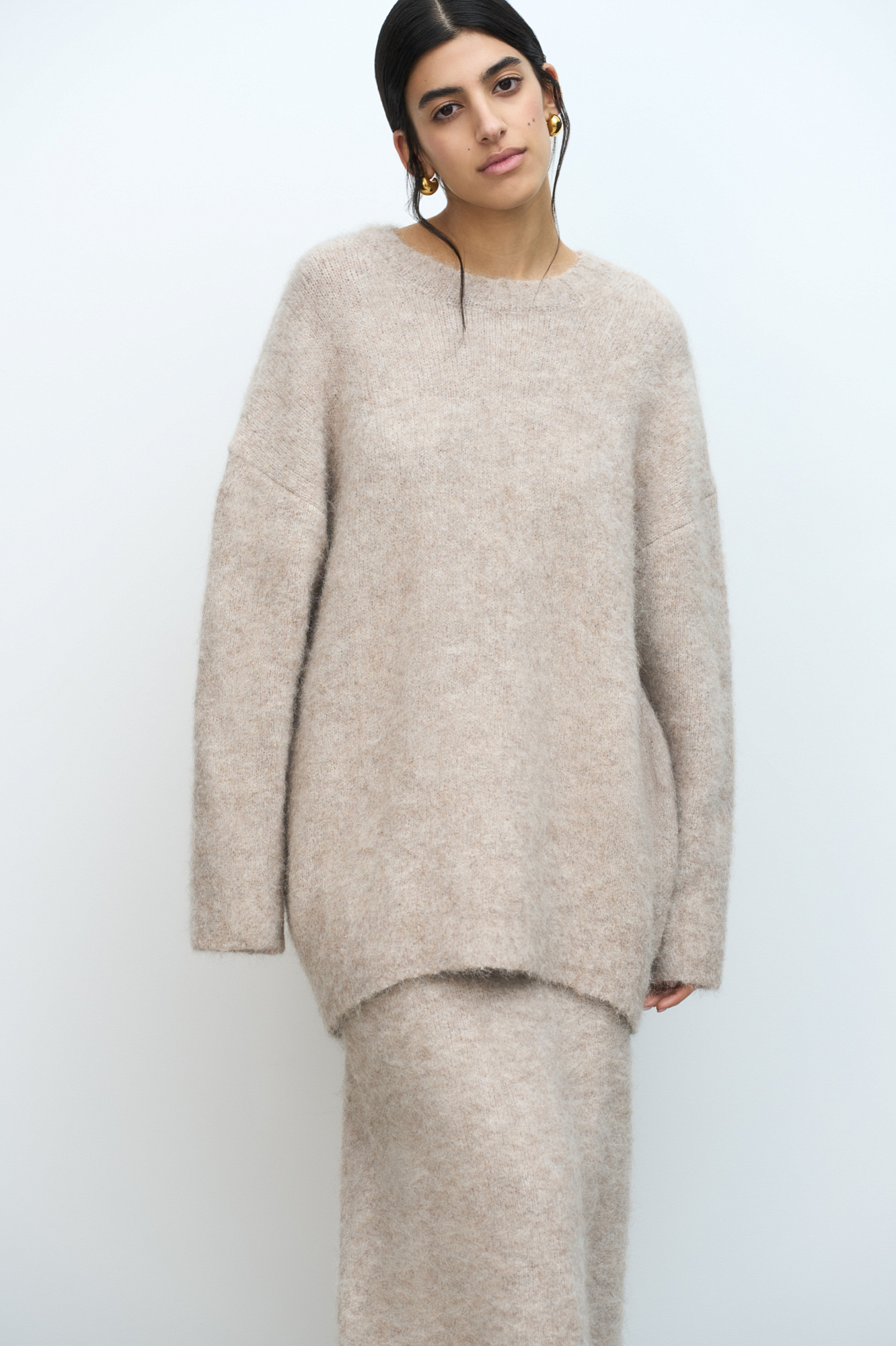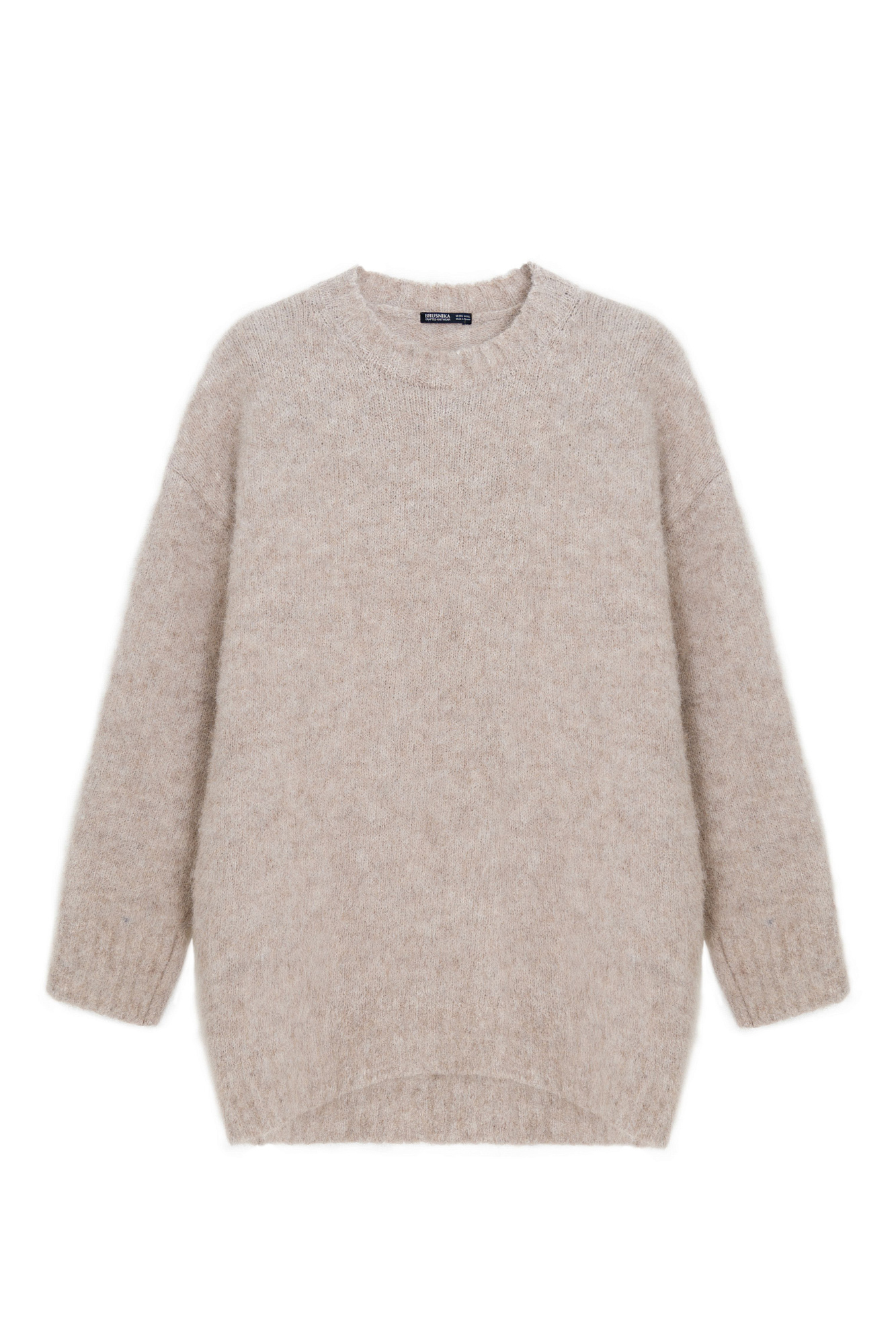 Трикотажный джемпер из пушистой пряжи на основе шерсти альпака. Модель свободного силуэта со спущенной линией плеча. Края изделия в рубчик.
