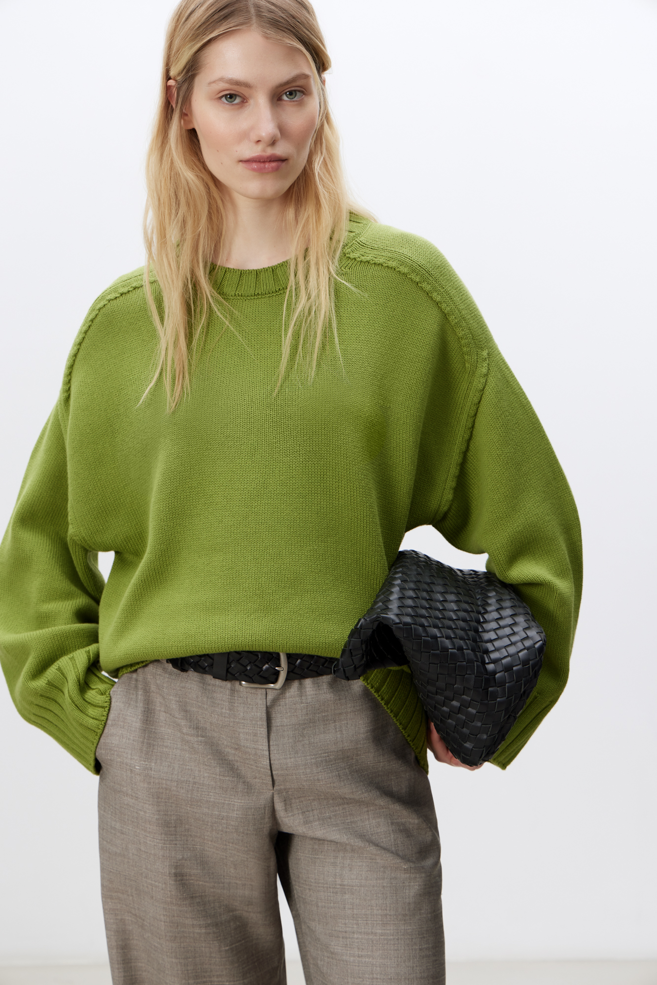 Трикотажный джемпер из 100% хлопка. Модель свободного силуэта со спущенной линией плеча и удлиненной спинкой.