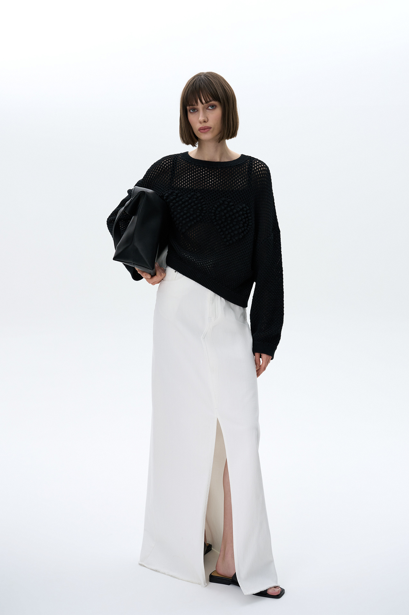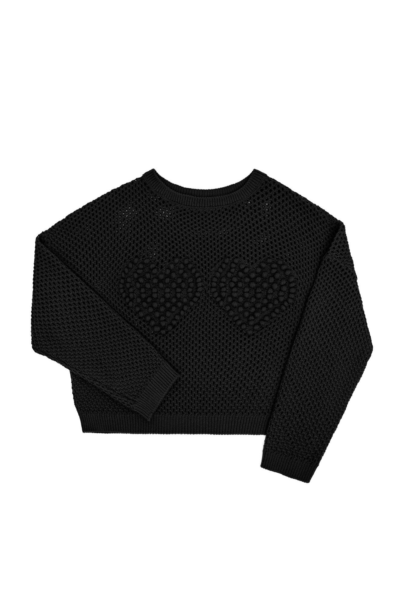 Трикотажный джемпер из хлопка. Модель свободного силуэта со спущенной линией плеча и круглым вырезом горловины. Изделие декорировано объемным орнаментом в виде двух сердец на груди.