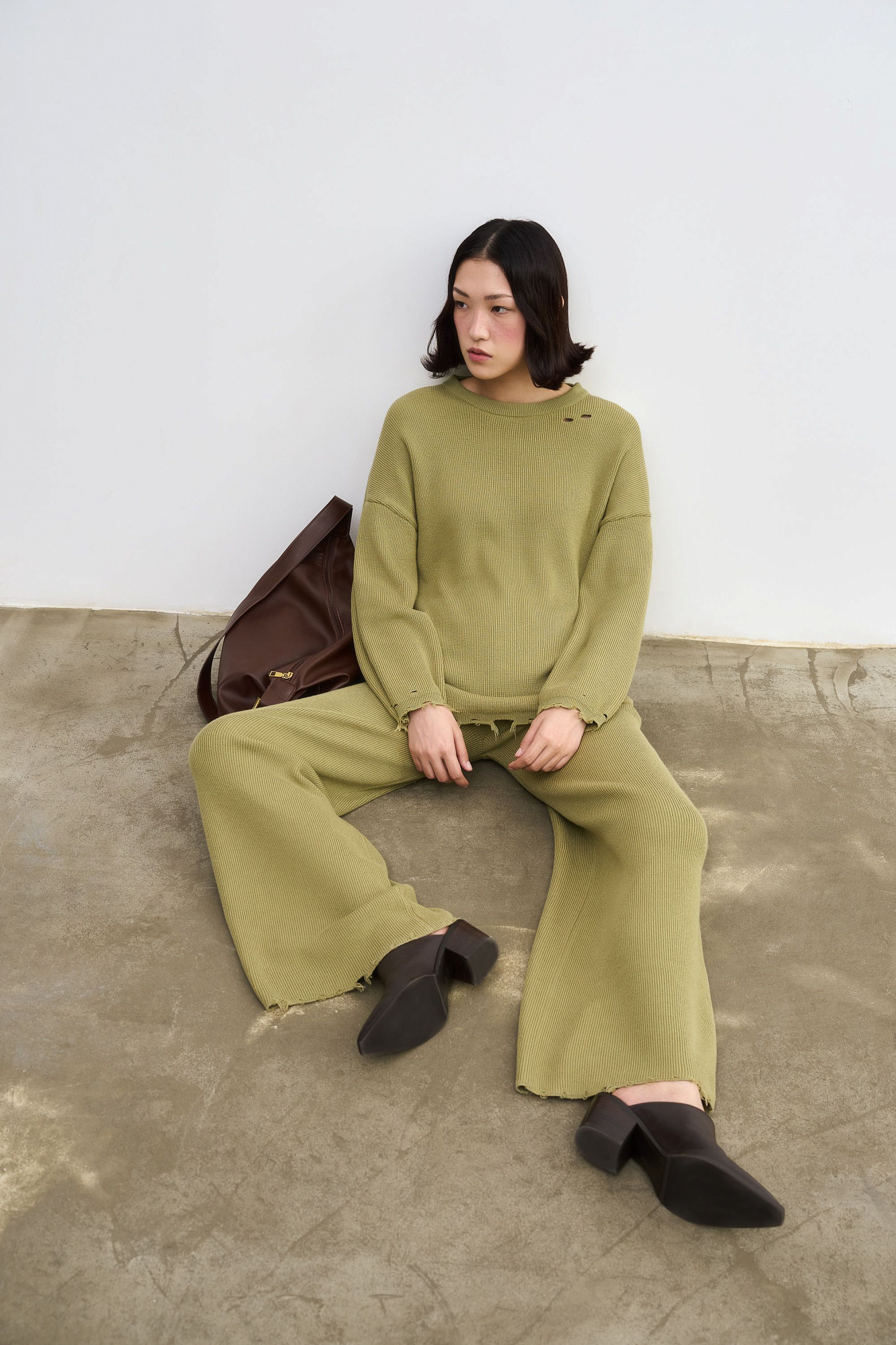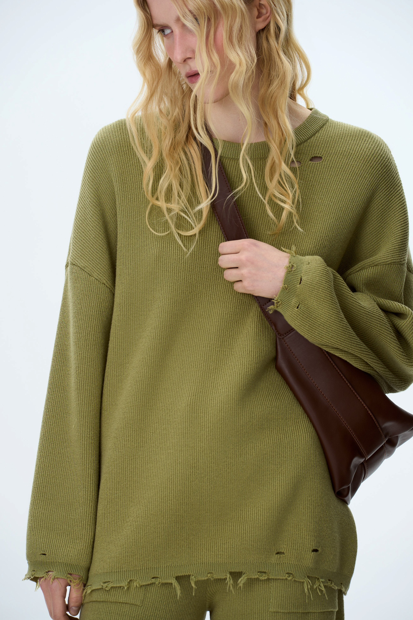 Трикотажный джемпер из хлопка с добавлением вискоза. Модель свободного силуэта со спущенной линией плеча и круглым вырезом горловины. Изделие декорировано имитацией драни и необработанным краем.