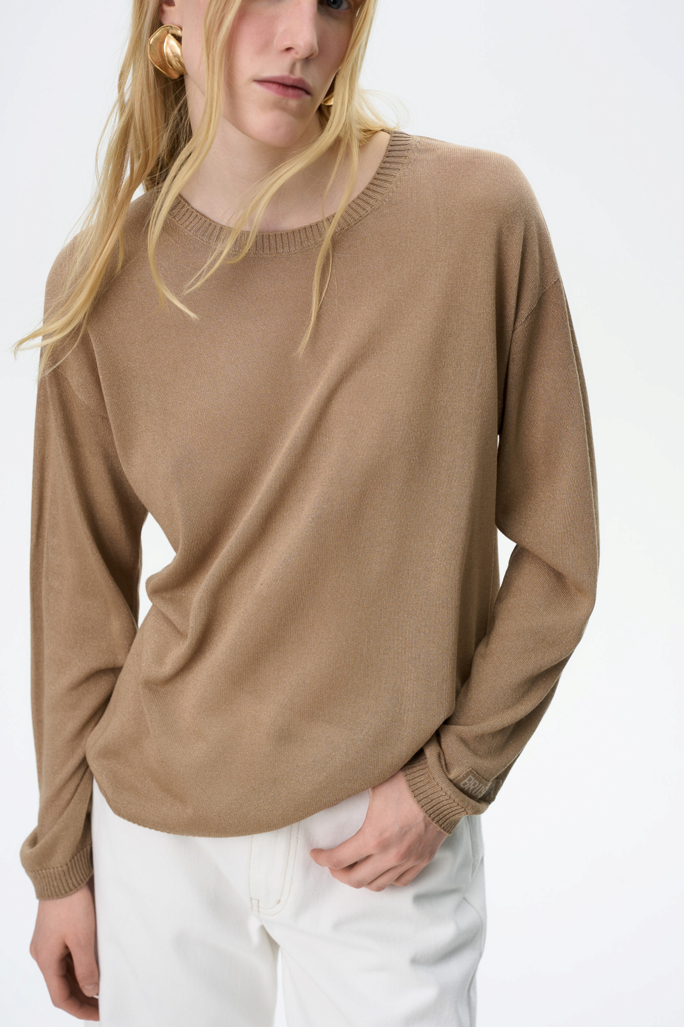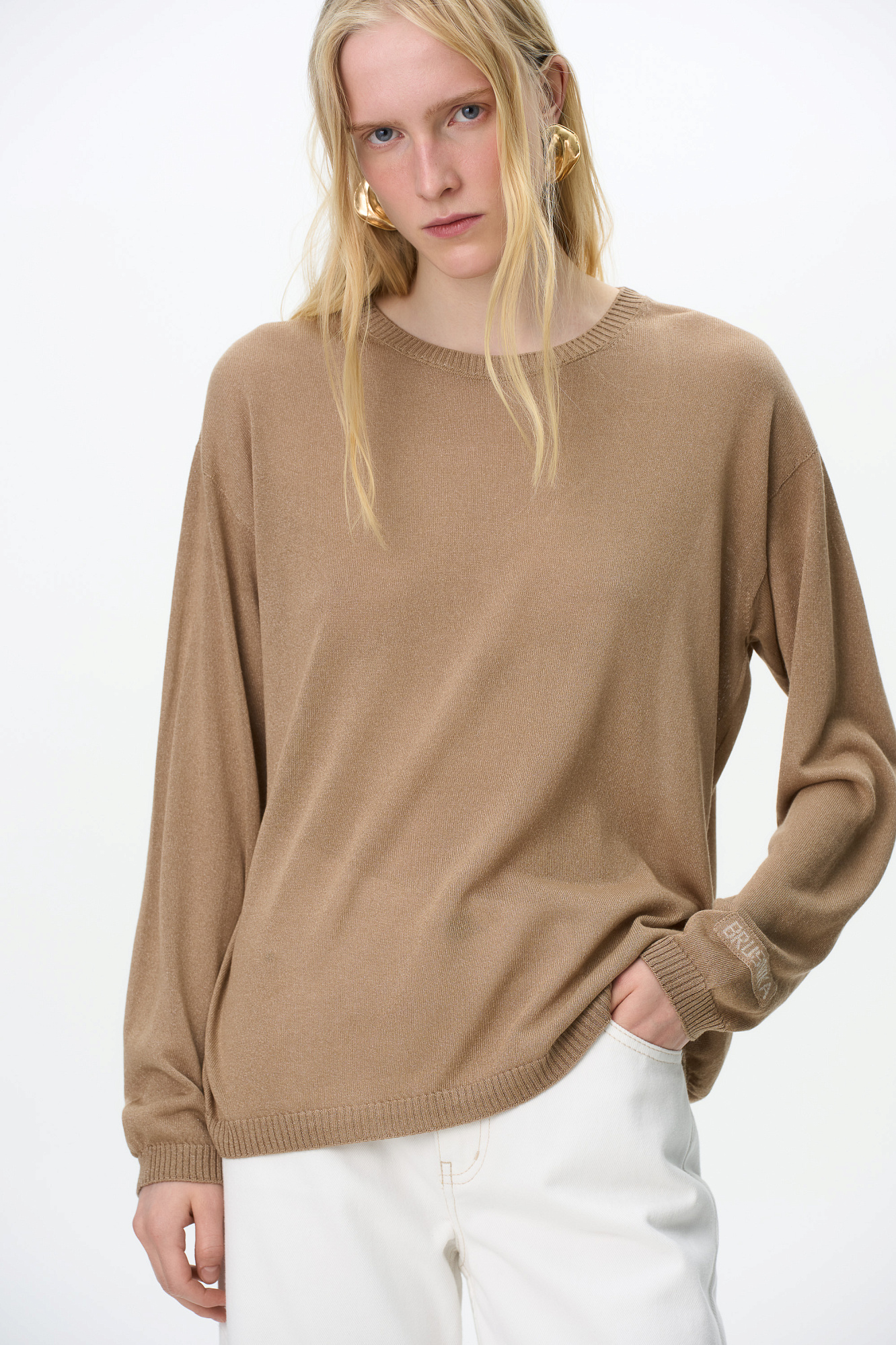 Трикотажный лонгслив из тонкой вискозы свободного силуэта. Спущенная линия плеча, круглый вырез и брендированный ярлык на рукаве.