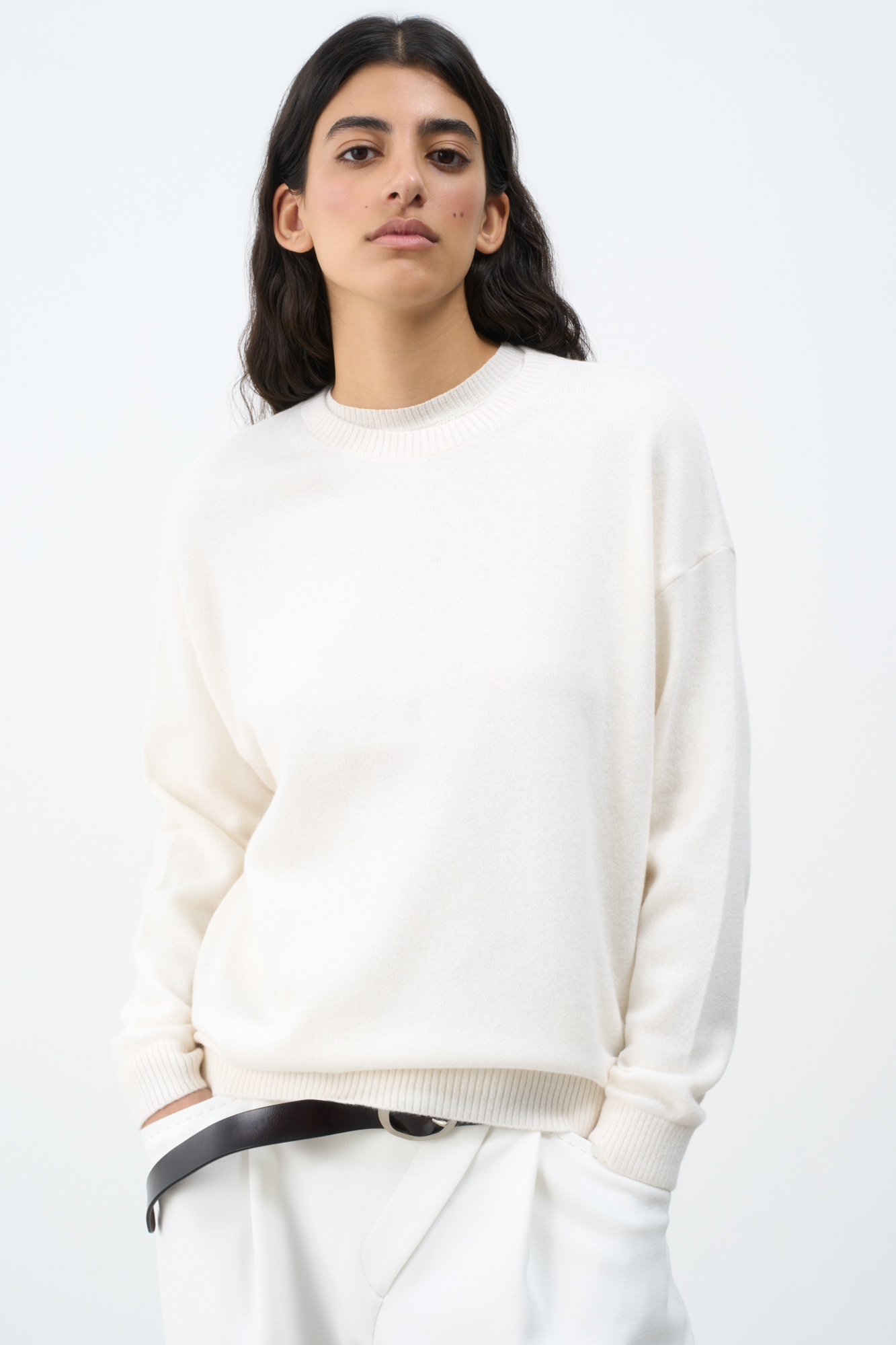 Трикотажный джемпер из 100% кашемира. Модель свободного силуэта со спущенной линией плеча и закругленным нижним краем. Края изделия в рубчик.