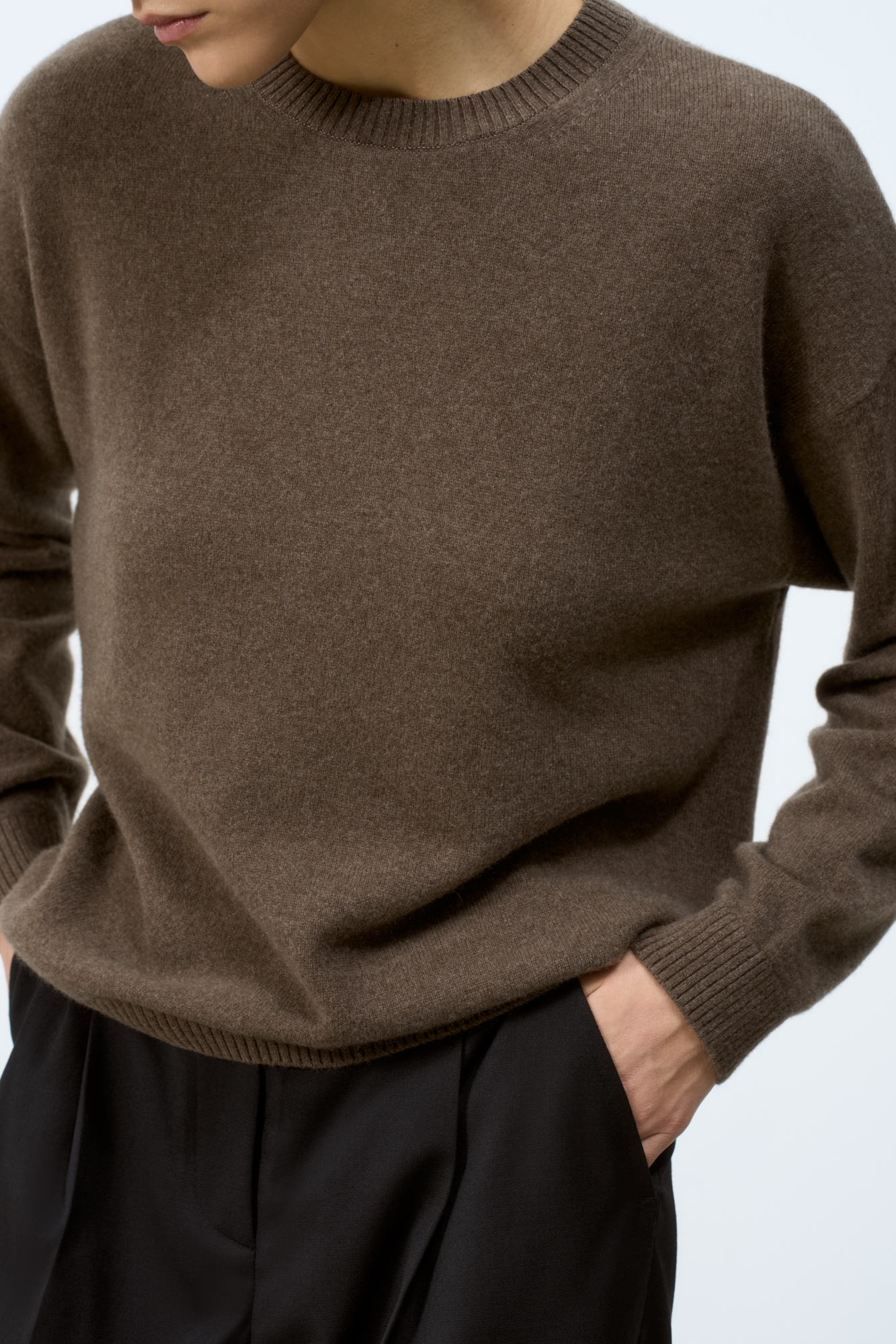 Трикотажный джемпер из 100% кашемира. Модель свободного силуэта со спущенной линией плеча и закругленным нижним краем. Края изделия в рубчик.
