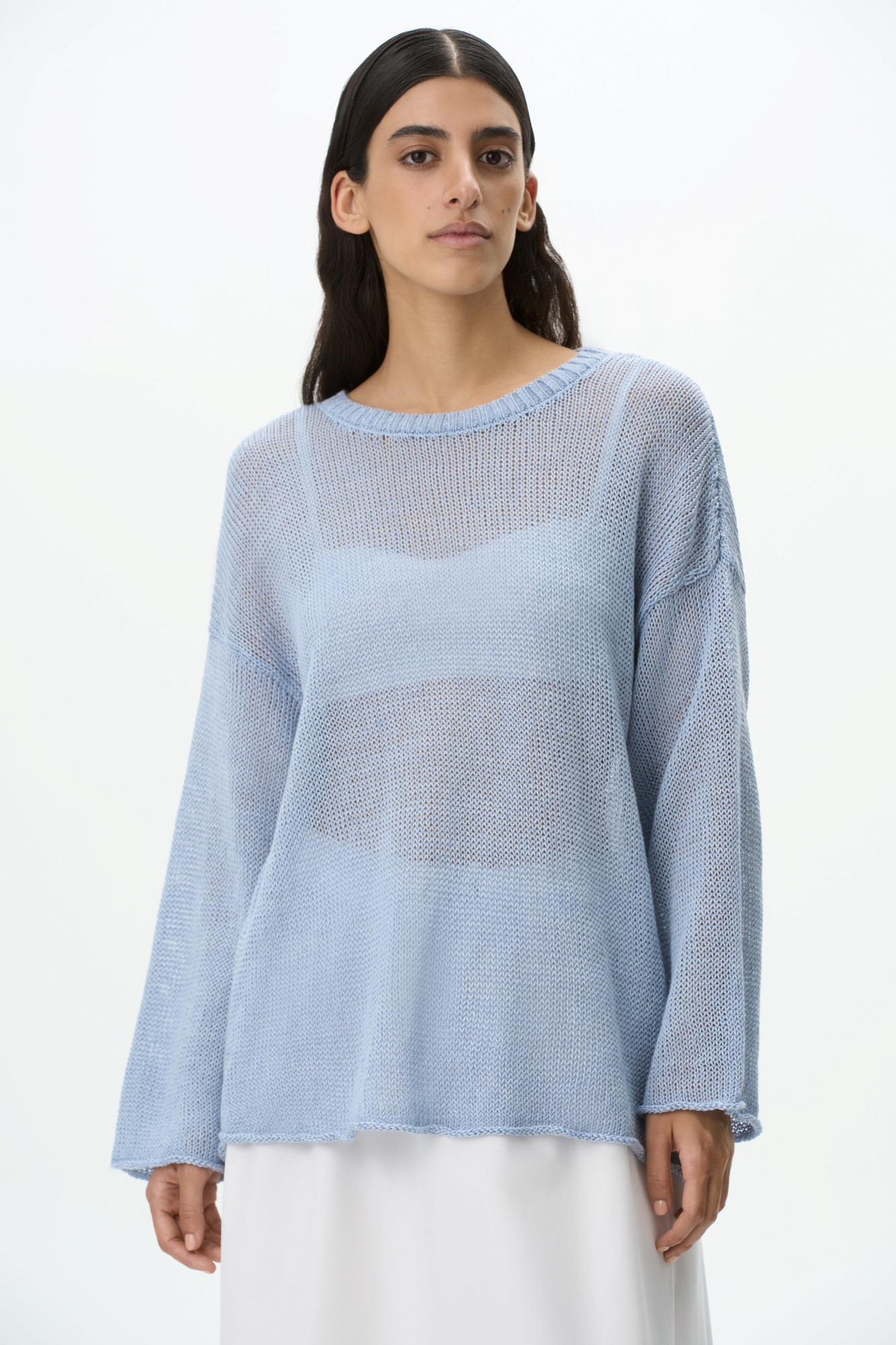 Полупрозрачный джемпер из 100% льна. Модель свободного силуэта со спущенной линией плеча и круглым вырезом горловины.