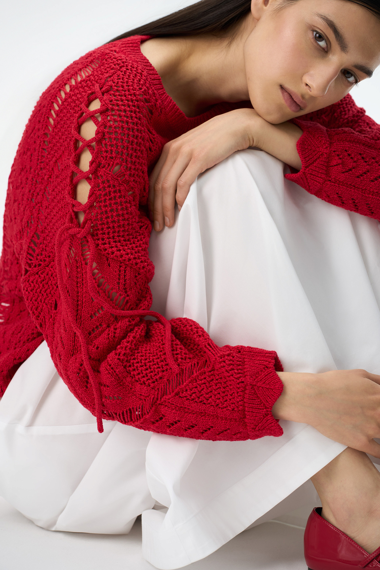 Ажурный джемпер со шнуровкой на рукавах. Модель свободного силуэта со спущенной линией плеча.