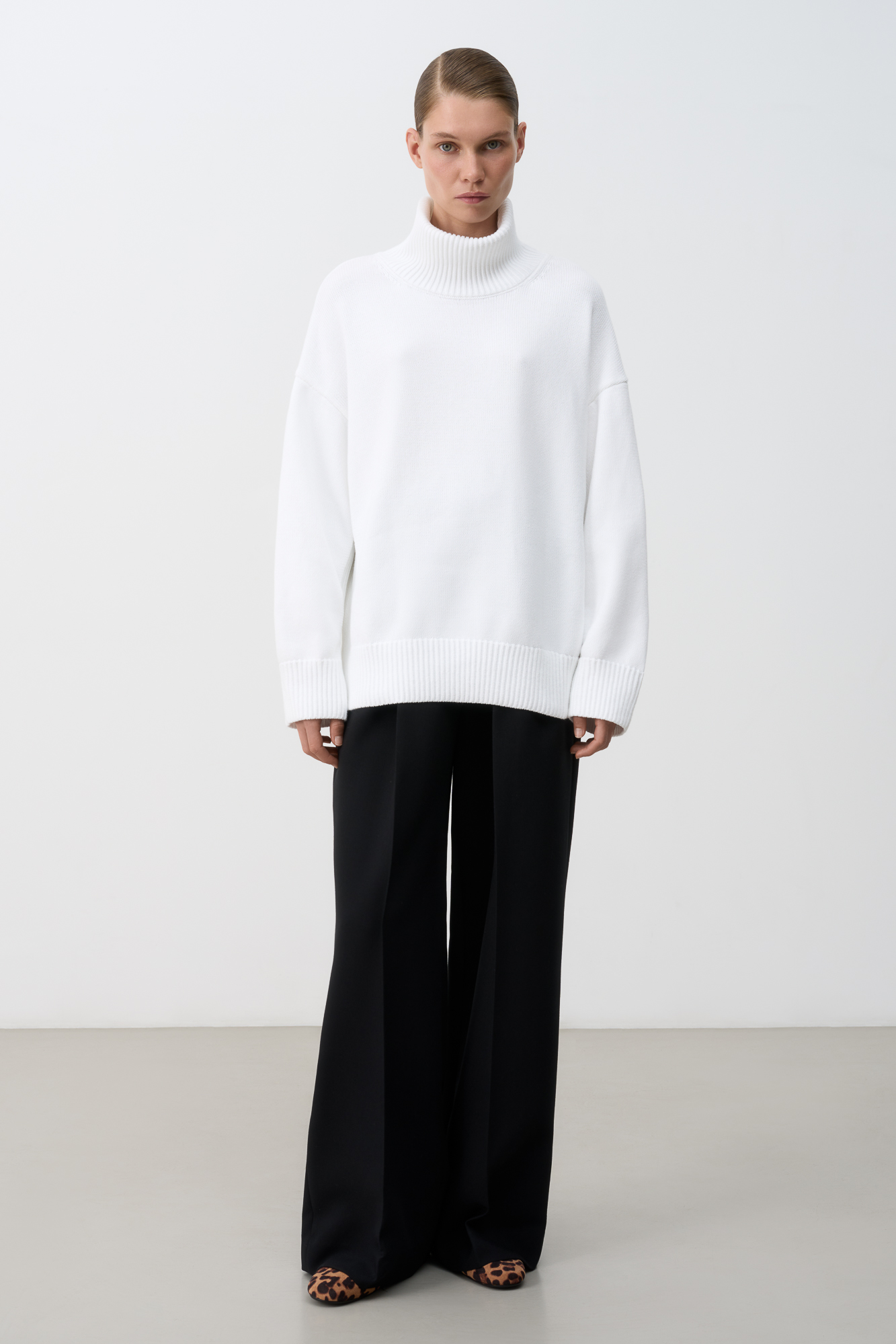 Трикотажный джемпер из 100% хлопка. Модель свободного силуэта со спущенной линией плеча и высоким объемным воротом.
