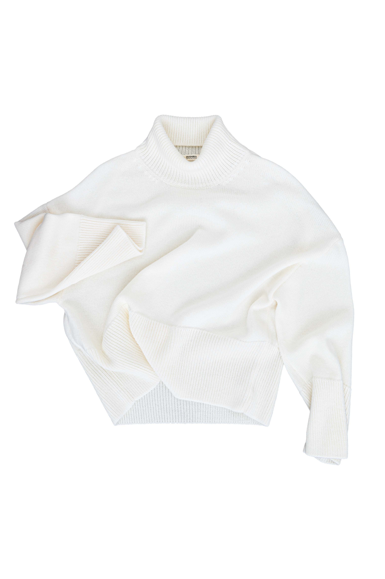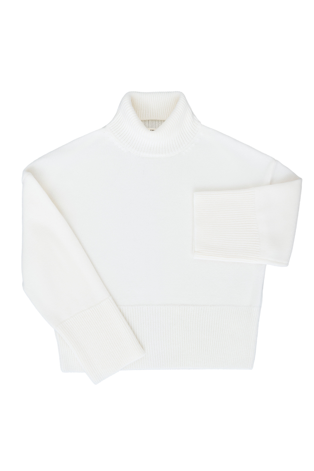 Трикотажный джемпер с высоким воротом. Модель свободного силуэта со спущенной линией плеча. Края изделия в рубчик.