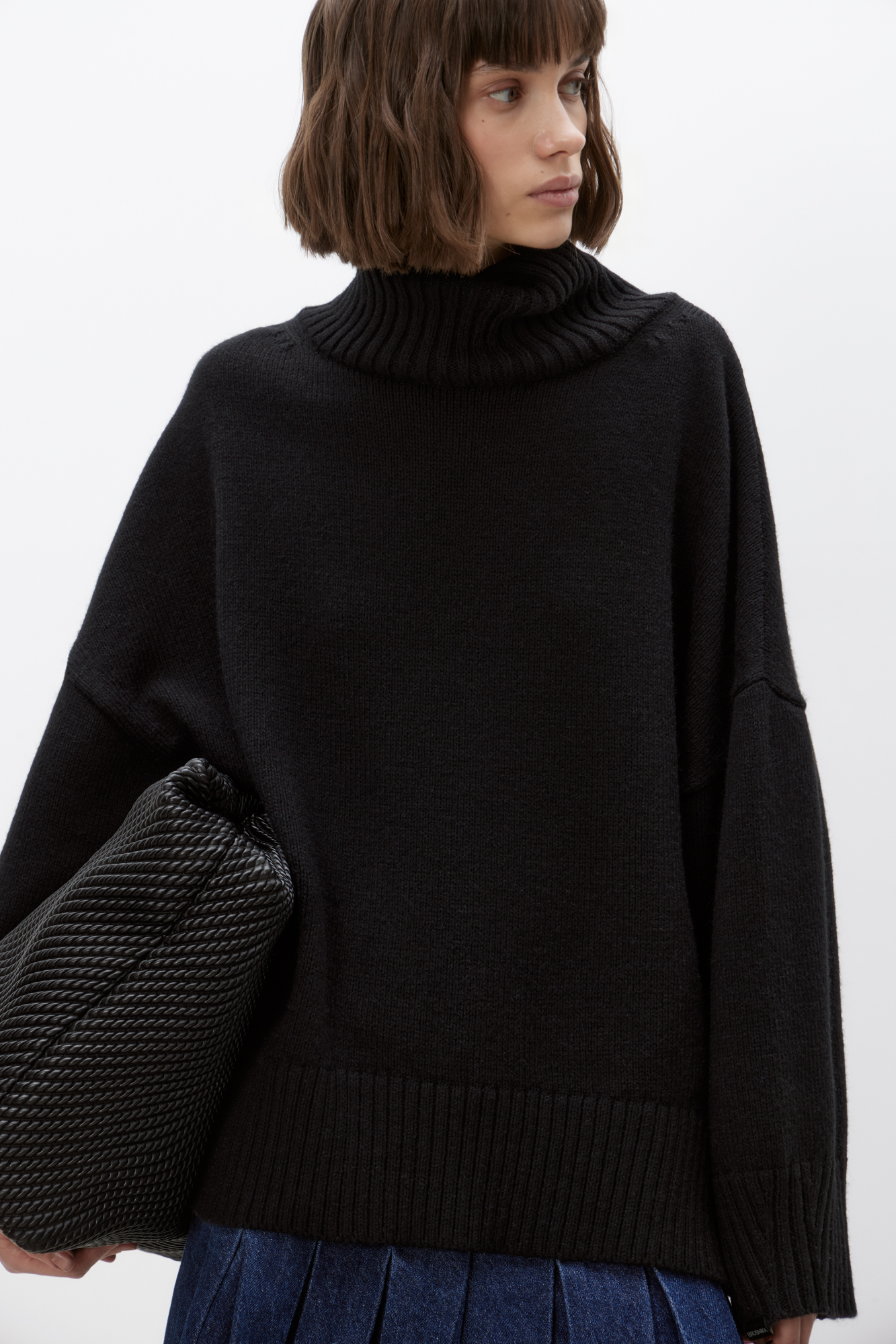 Объемный трикотажный джемпер из шерсти альпака. Модель свободного силуэта, со спущенной линией плеча и высоким воротом. Края изделия выполнены в широкий рубчик. Логотип бренда на манжете.