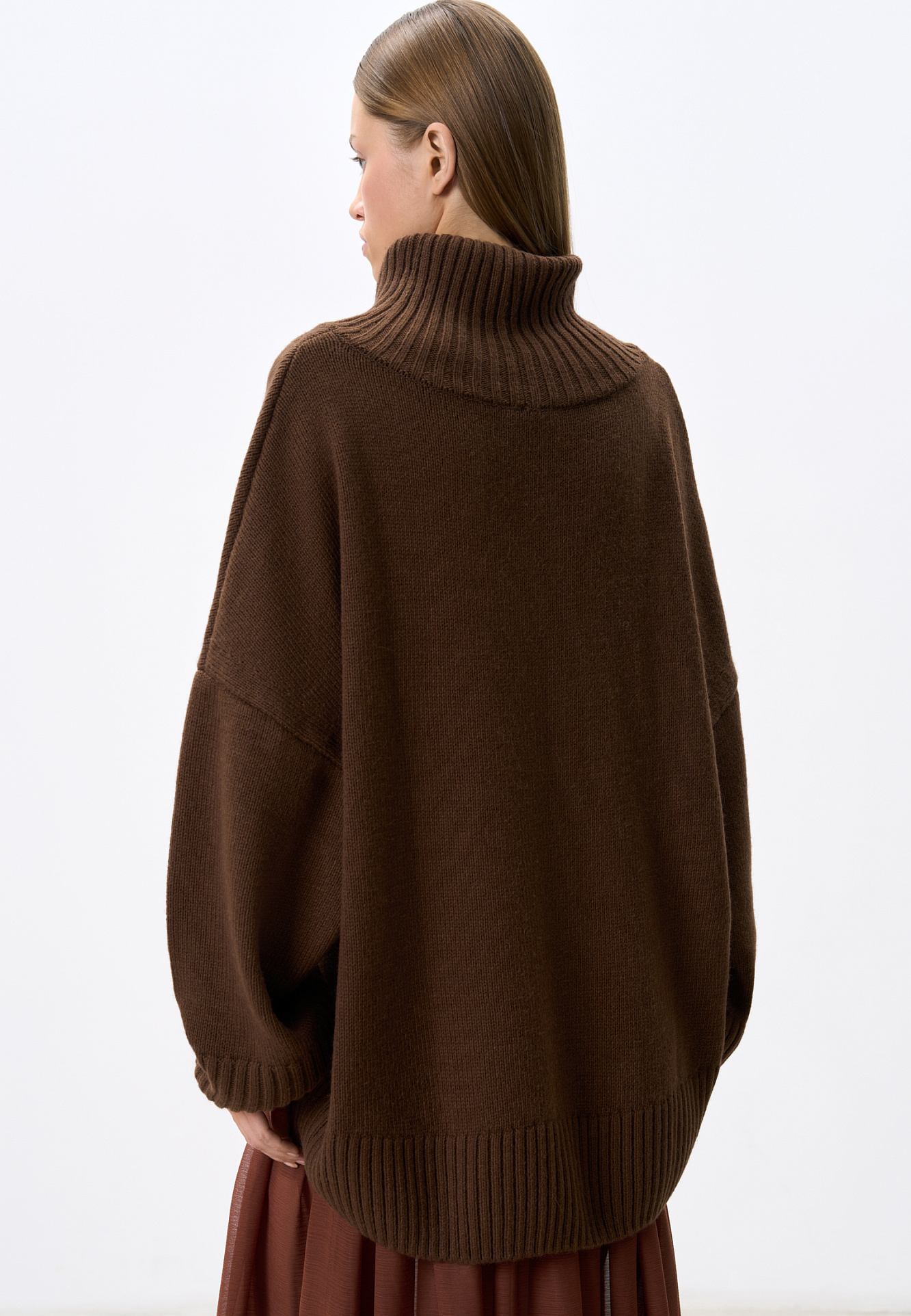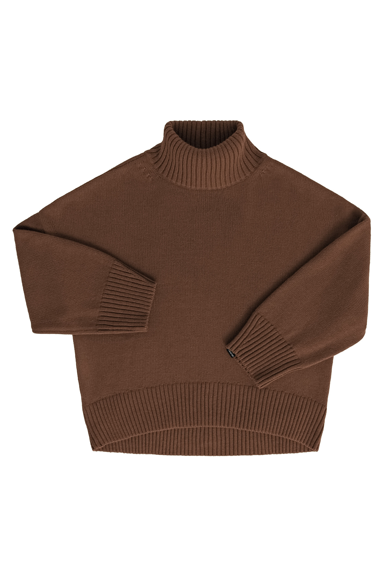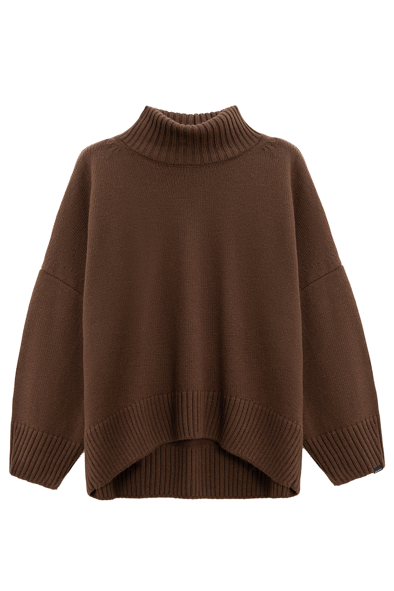 Объемный трикотажный джемпер из шерсти альпака. Модель свободного силуэта, со спущенной линией плеча и высоким воротом. Края изделия выполнены в широкий рубчик. Логотип бренда на манжете.