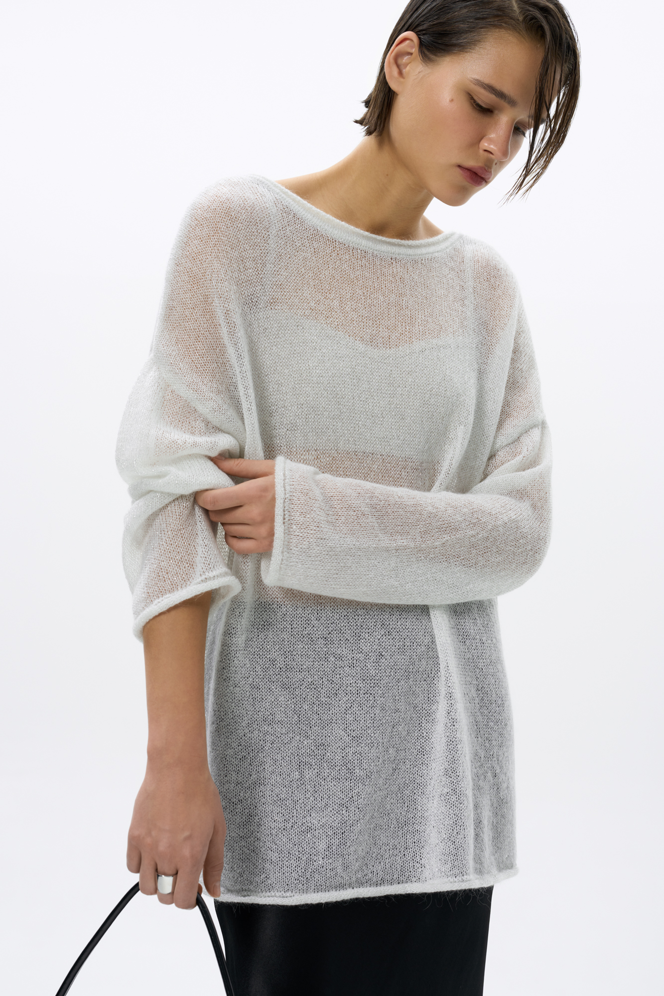 Полупрозрачный трикотажный джемпер с люрексом. Модель свободного силуэта с длинным рукавом и глубоким вырезом на спине.