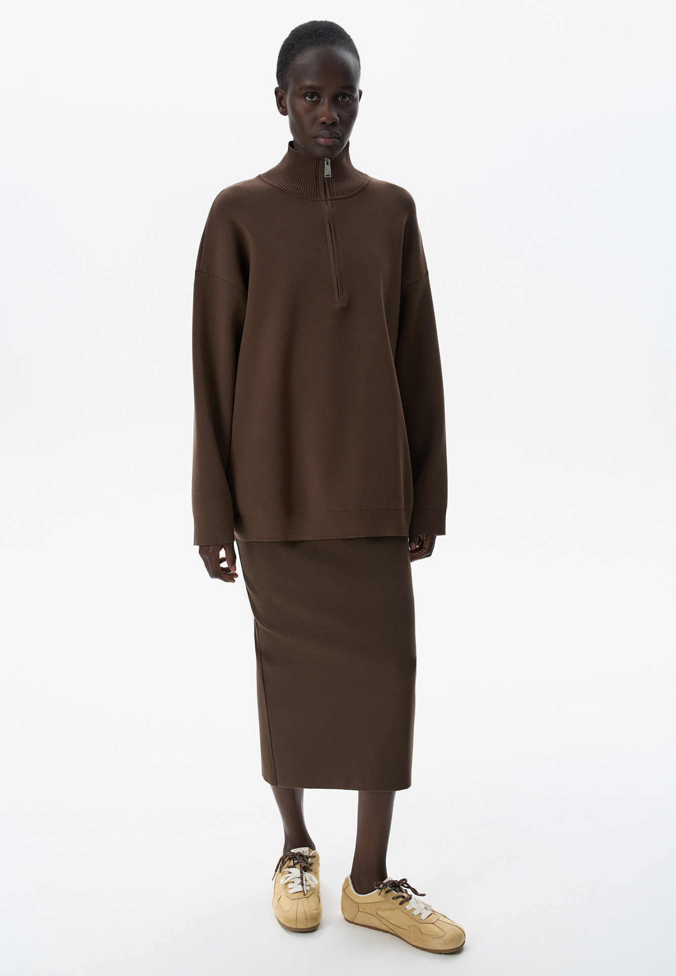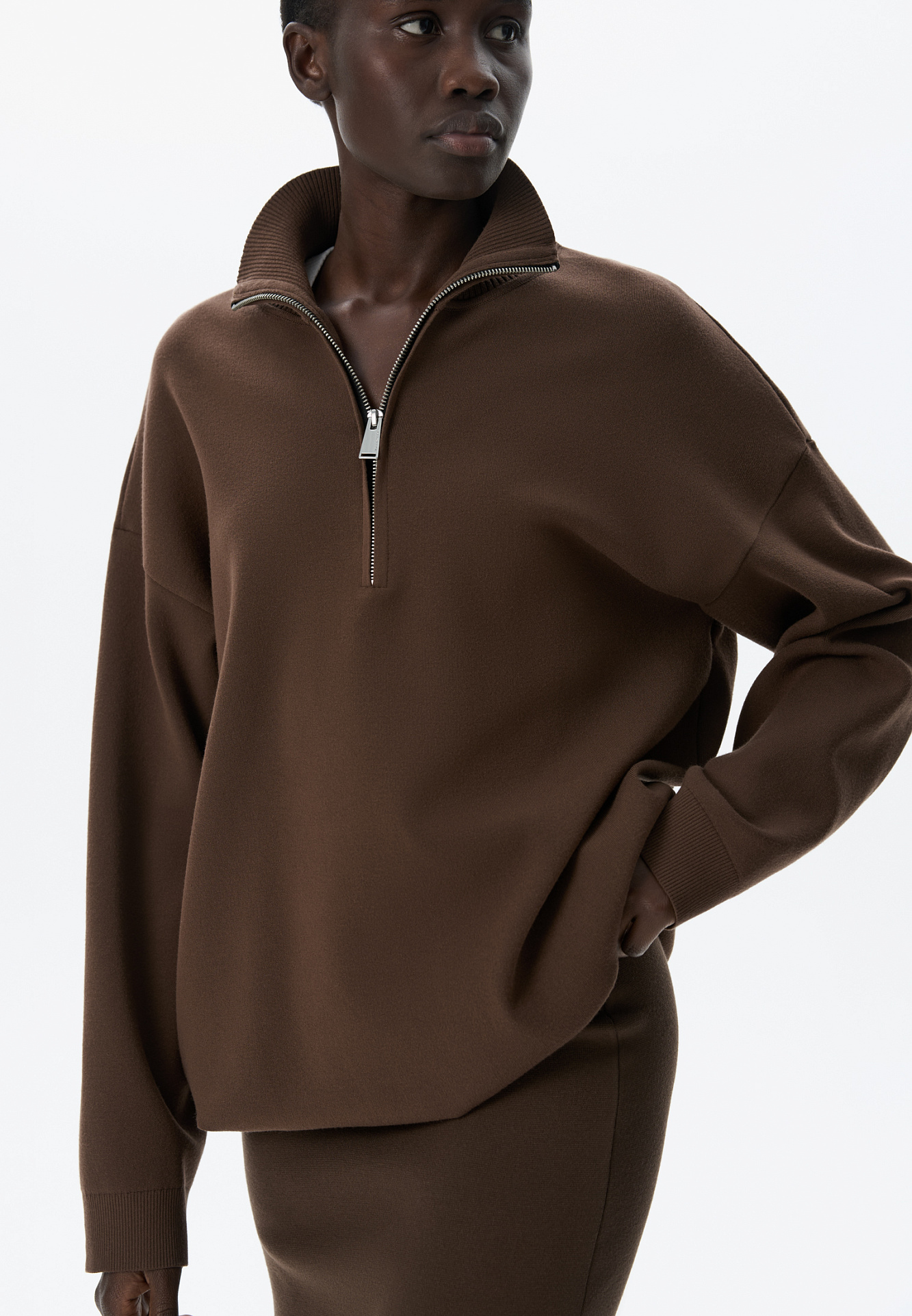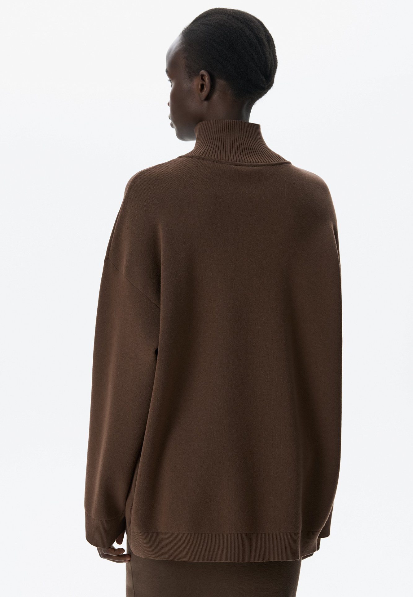 Трикотажный джемпер из вискозы с воротником-стойкой. Модель свободного силуэта со спущенной линией плеча и застежкой на молнию. Манжеты рукавов, воротник и низ изделия выполнены в рубчик.