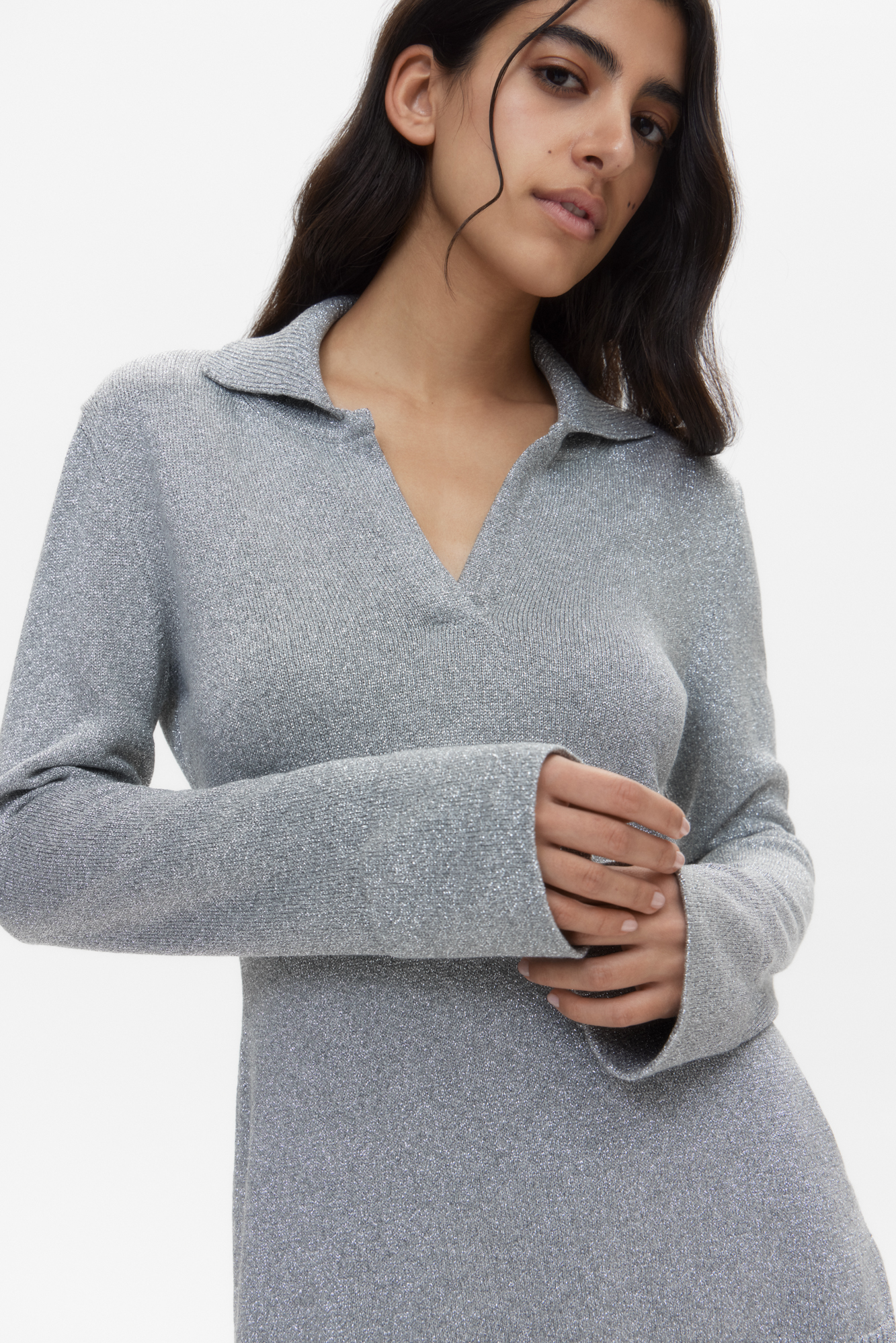 Трикотажный джемпер с воротником-поло. Модель свободного силуэта со спущенной линией плеча. Изделие выполнено из пряжи с эффектом металлического блеска.