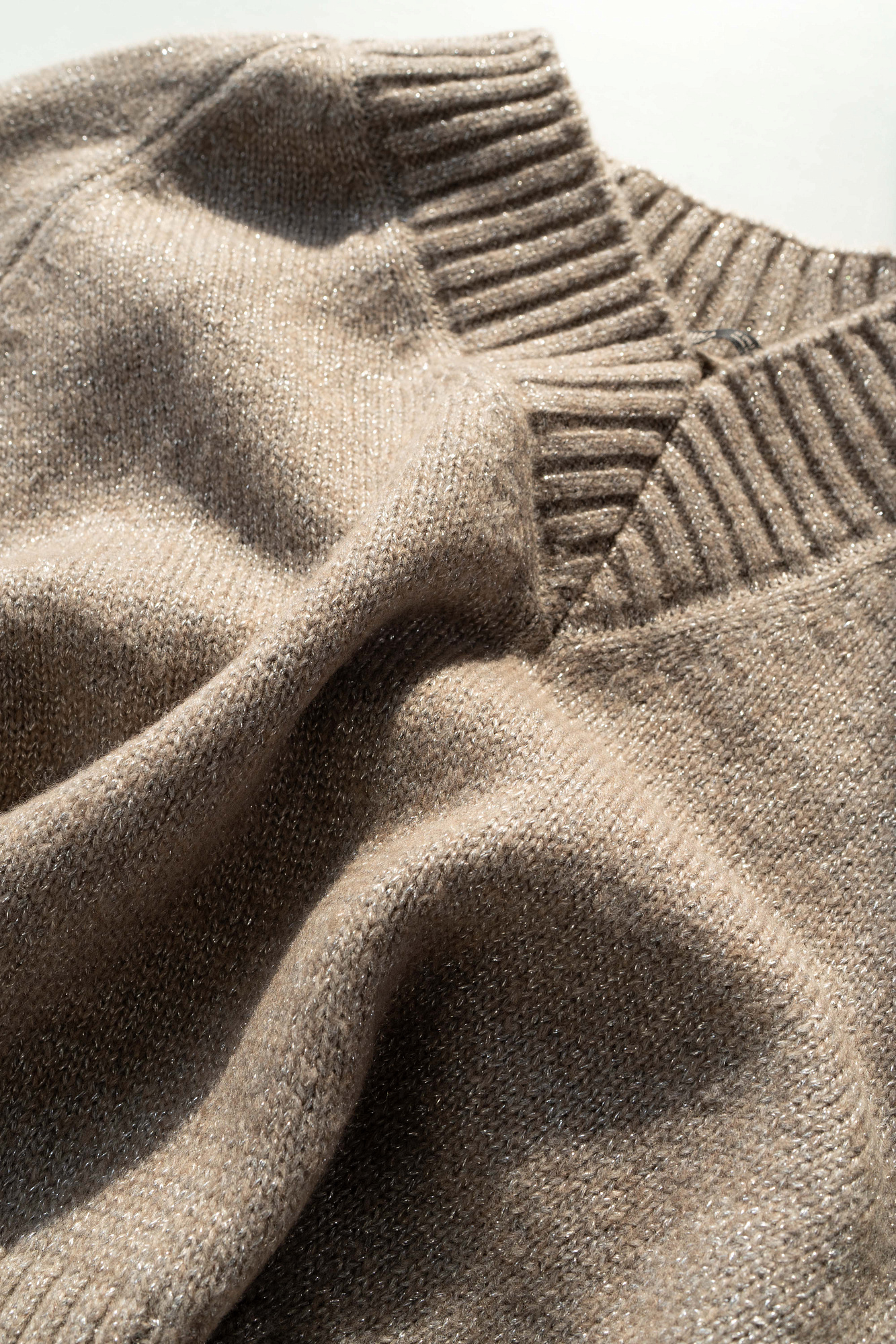 Трикотажный джемпер из шерсти мериноса с люрексом. Модель свободного силуэта с V-образным вырезом.